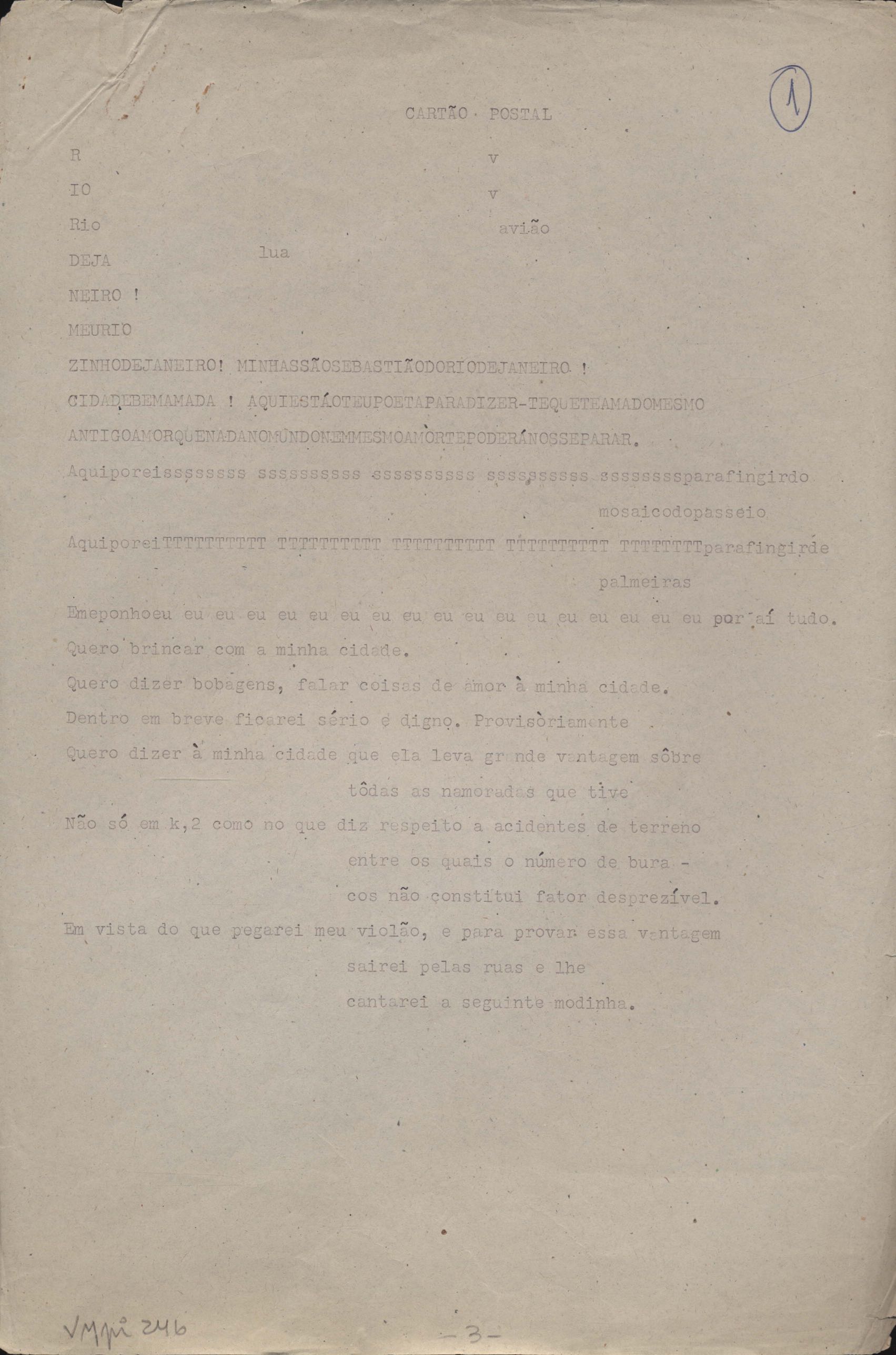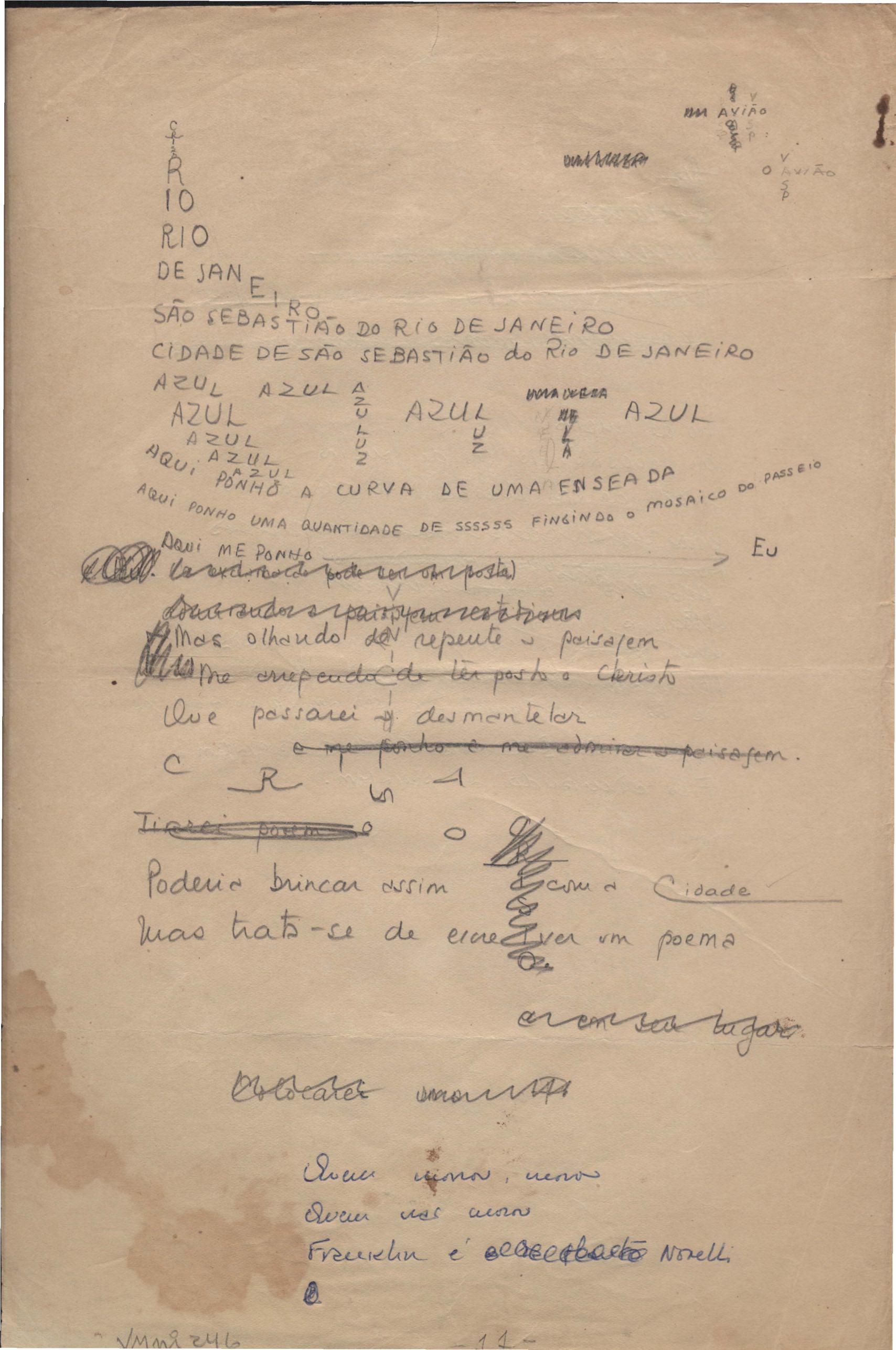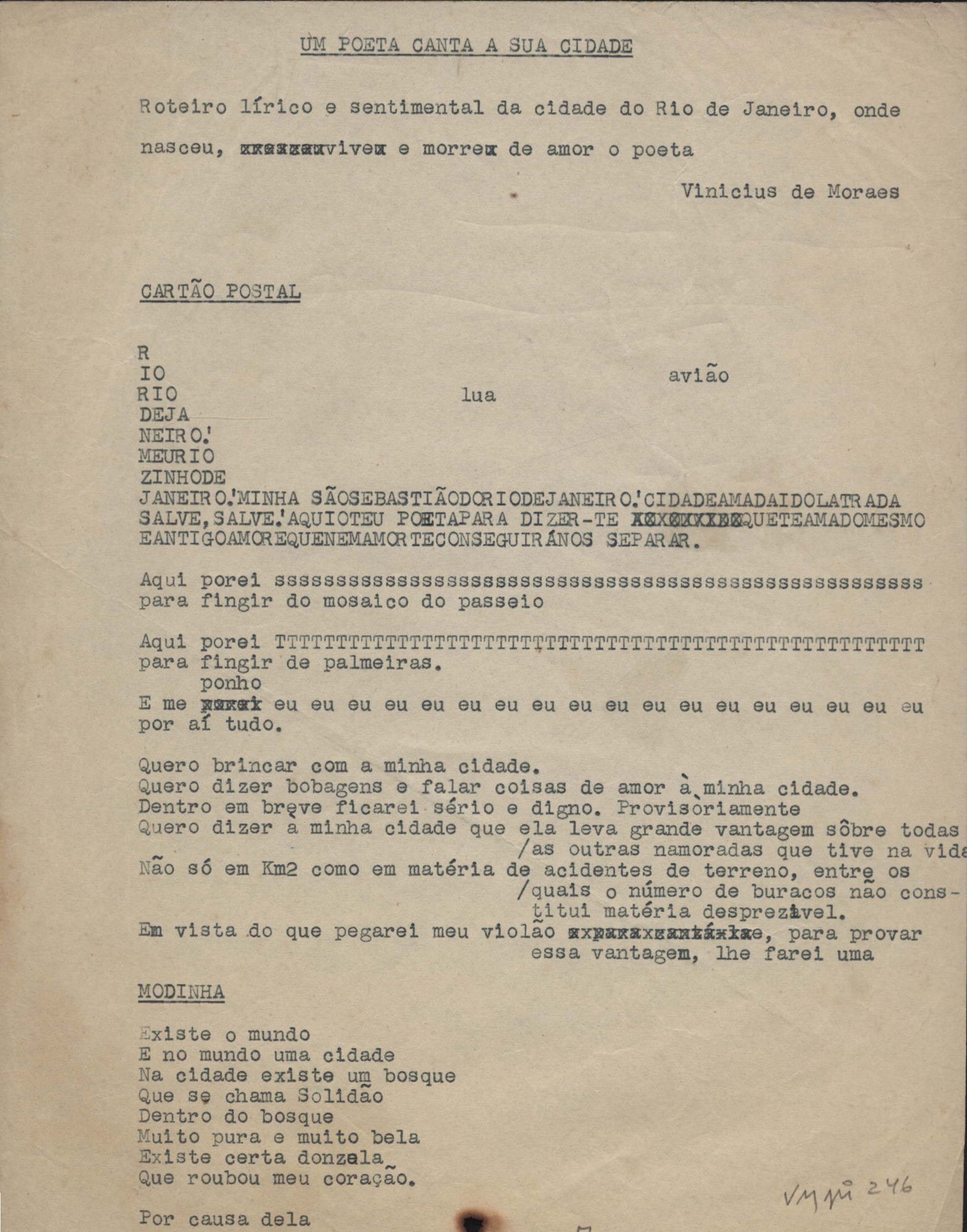 Este documento faz parte do dossiê VMPI246, que contempla poemas datados entre 1949 e 10 fev. 1973, publicados no livro Roteiro lírico e sentimental da cidade de São Sebastião do Rio de Janeiro, onde nasceu, vive em trânsito e morre de amor o poeta Vinicius de Moraes. Inclui prova tipográfica e outras versões manuscritas e datilografadas.