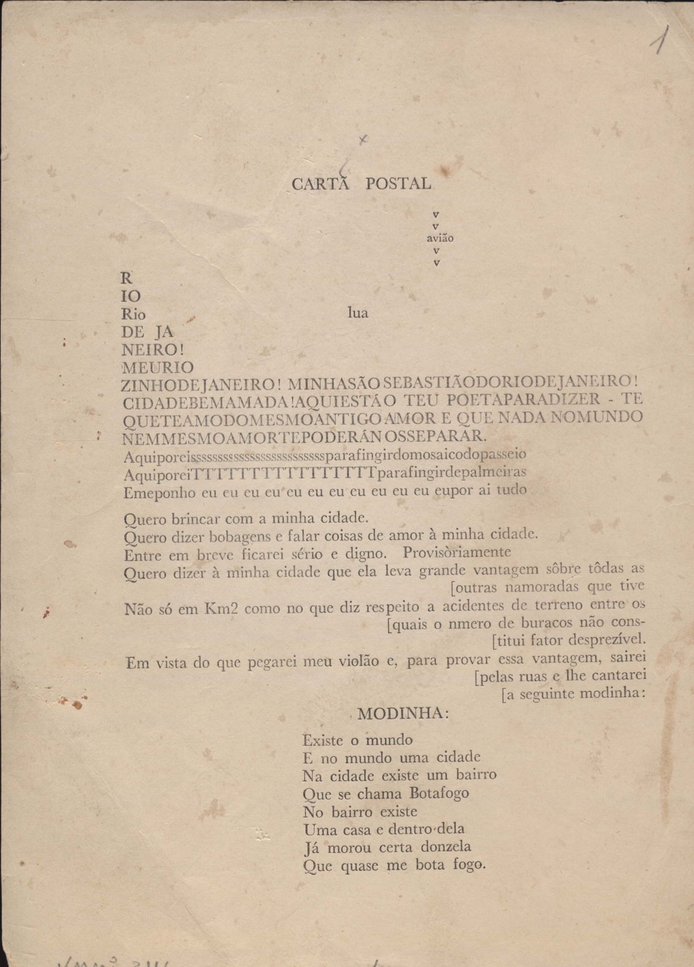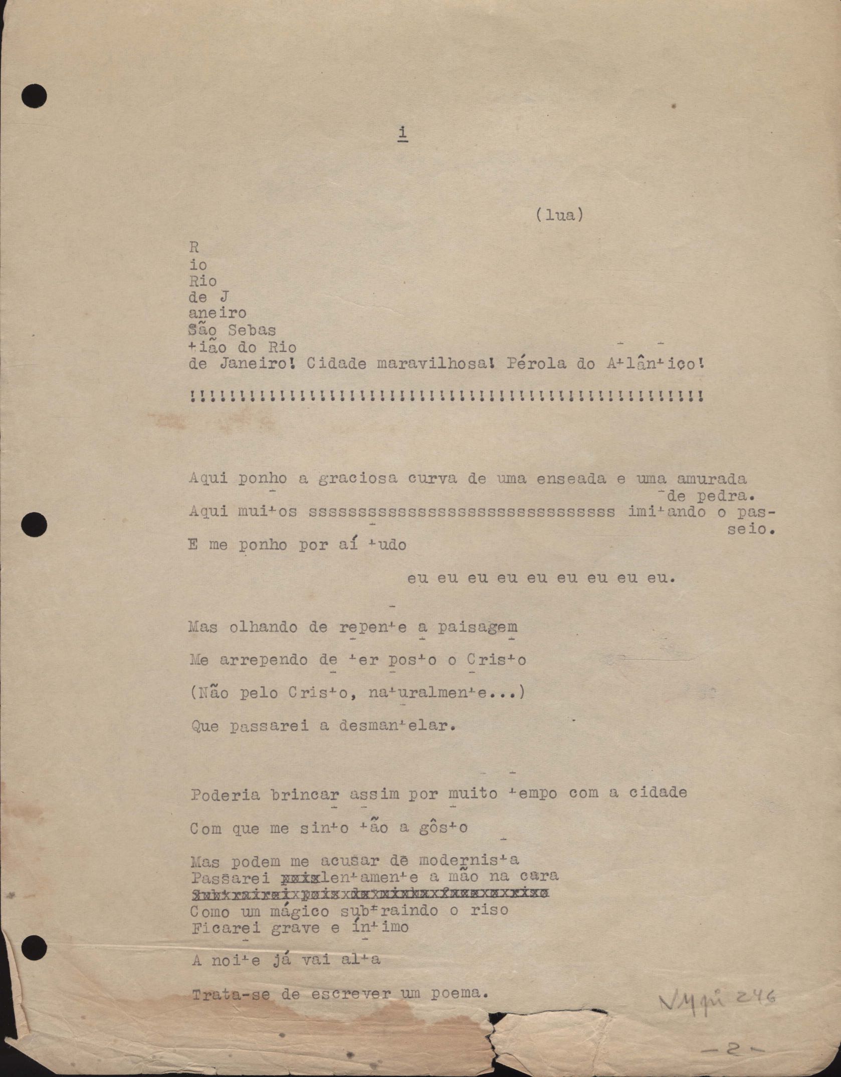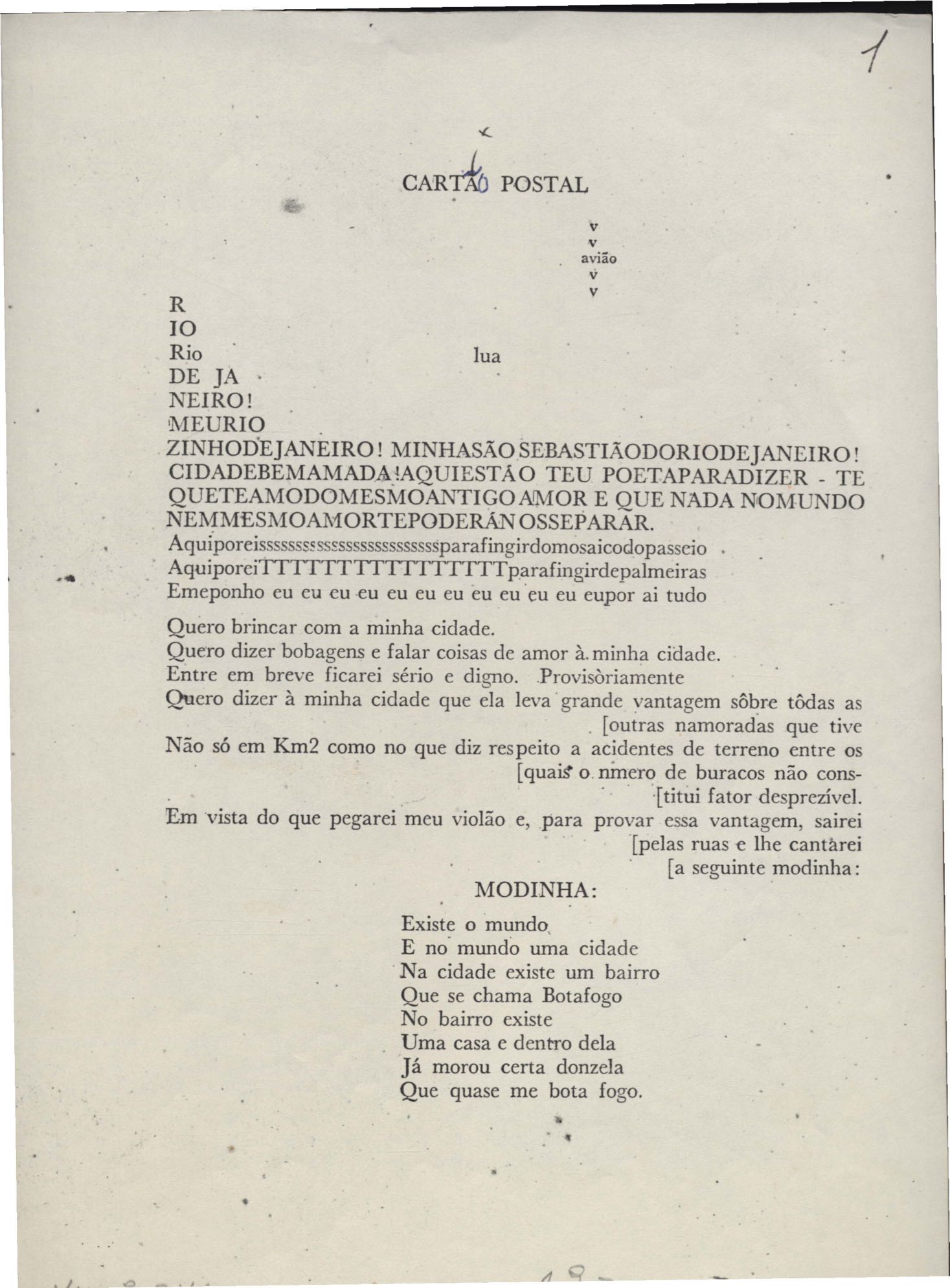 Este documento faz parte do dossiê VMPI246, que contempla poemas datados entre 1949 e 10 fev. 1973, publicados no livro Roteiro lírico e sentimental da cidade de São Sebastião do Rio de Janeiro, onde nasceu, vive em trânsito e morre de amor o poeta Vinicius de Moraes. Inclui prova tipográfica e outras versões manuscritas e datilografadas.