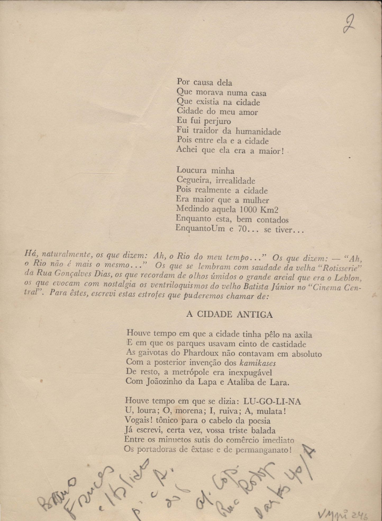 Este documento faz parte do dossiê VMPI246, que contempla poemas datados entre 1949 e 10 fev. 1973, publicados no livro Roteiro lírico e sentimental da cidade de São Sebastião do Rio de Janeiro, onde nasceu, vive em trânsito e morre de amor o poeta Vinicius de Moraes. Inclui prova tipográfica e outras versões manuscritas e datilografadas.
