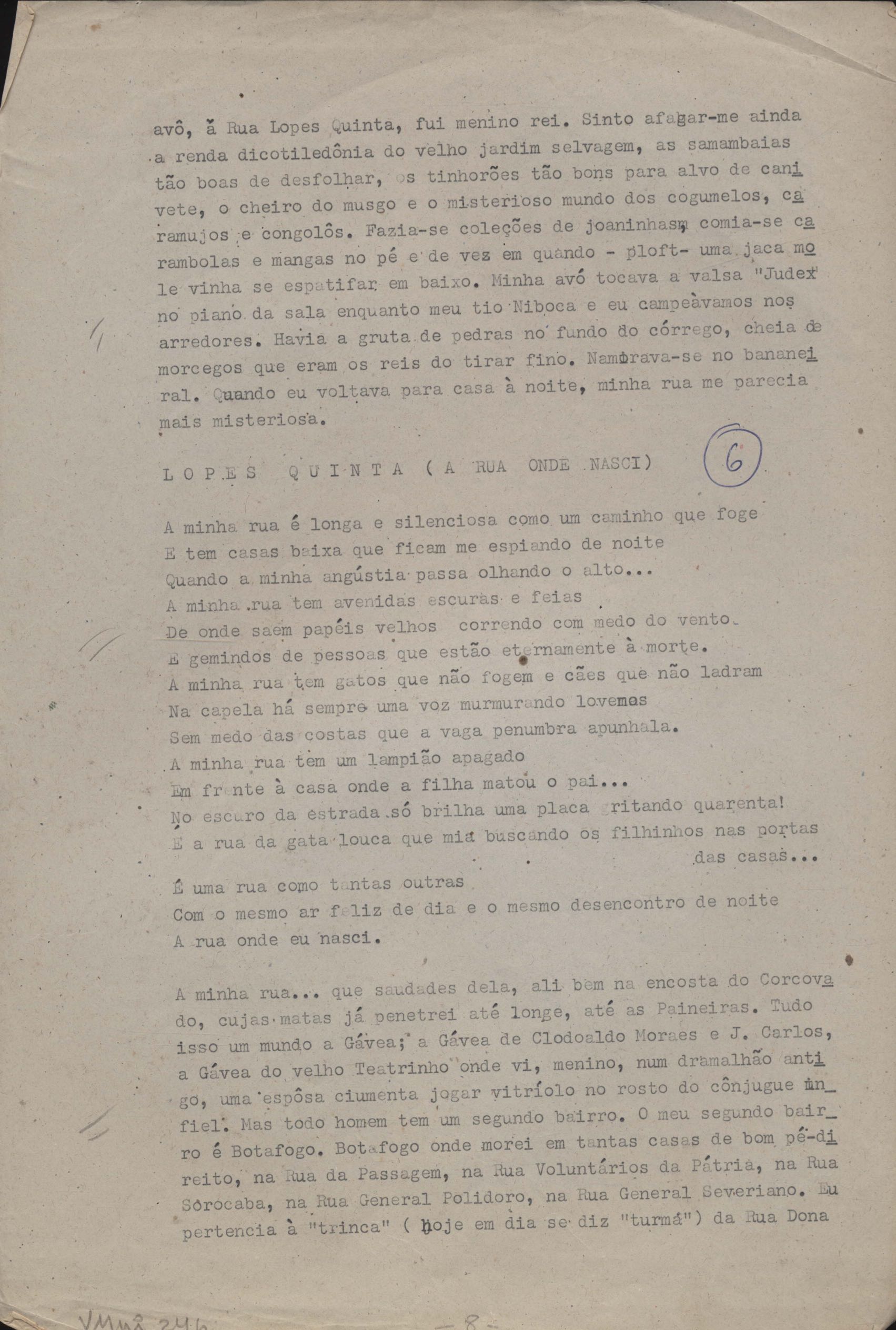 Este documento faz parte do dossiê VMPI246, que contempla poemas datados entre 1949 e 10 fev. 1973, publicados no livro Roteiro lírico e sentimental da cidade de São Sebastião do Rio de Janeiro, onde nasceu, vive em trânsito e morre de amor o poeta Vinicius de Moraes. Inclui prova tipográfica e outras versões manuscritas e datilografadas.