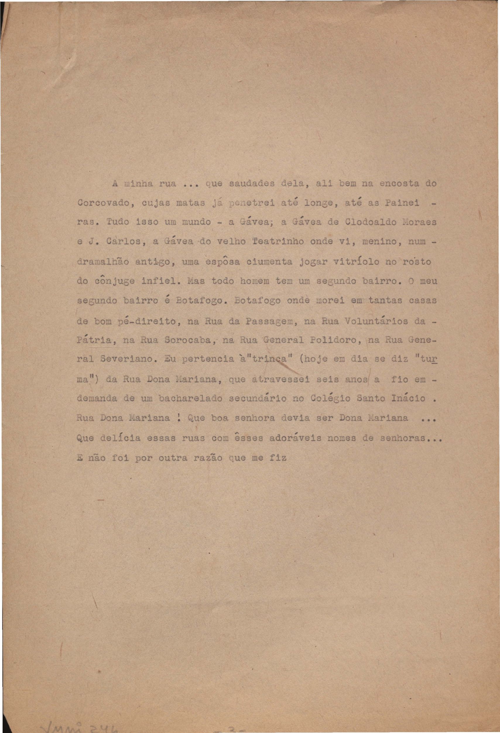 Este documento faz parte do dossiê VMPI246, que contempla poemas datados entre 1949 e 10 fev. 1973, publicados no livro Roteiro lírico e sentimental da cidade de São Sebastião do Rio de Janeiro, onde nasceu, vive em trânsito e morre de amor o poeta Vinicius de Moraes. Inclui prova tipográfica e outras versões manuscritas e datilografadas.