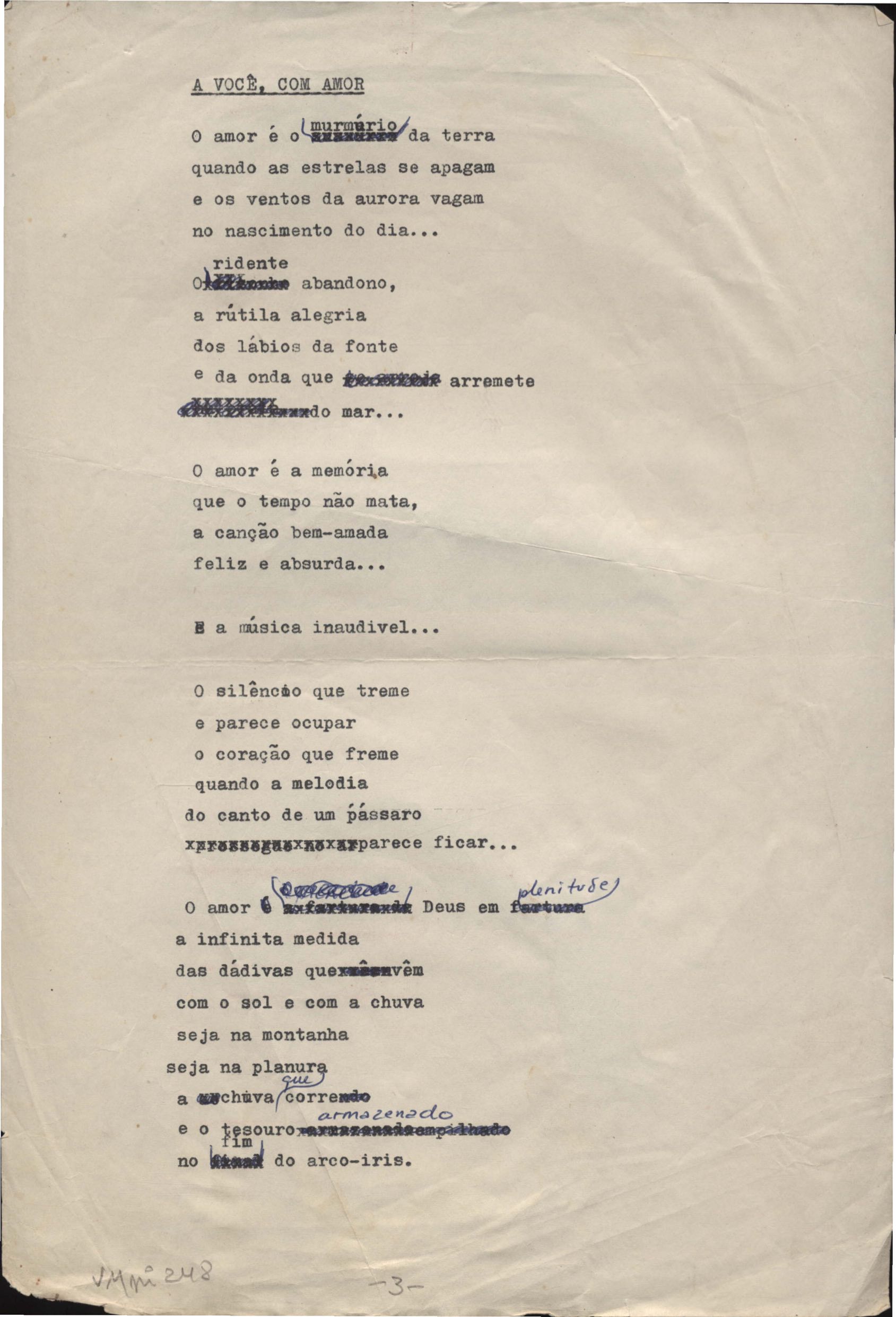 Este documento faz parte do dossiê VMPI248, "Poemas esparsos", que contempla poemas datados entre 21 ago. 1927 e 8 dez. 1971. Destes poemas, 401 são esboços e não possuem título (cf. registro VM0PI248_1_232). Estes originais não podem ser tomados como obra inédita. Ideias, tentativas, escritos inacabados, abandonados ou aproveitados posteriormente com outra forma compõem o dossiê.