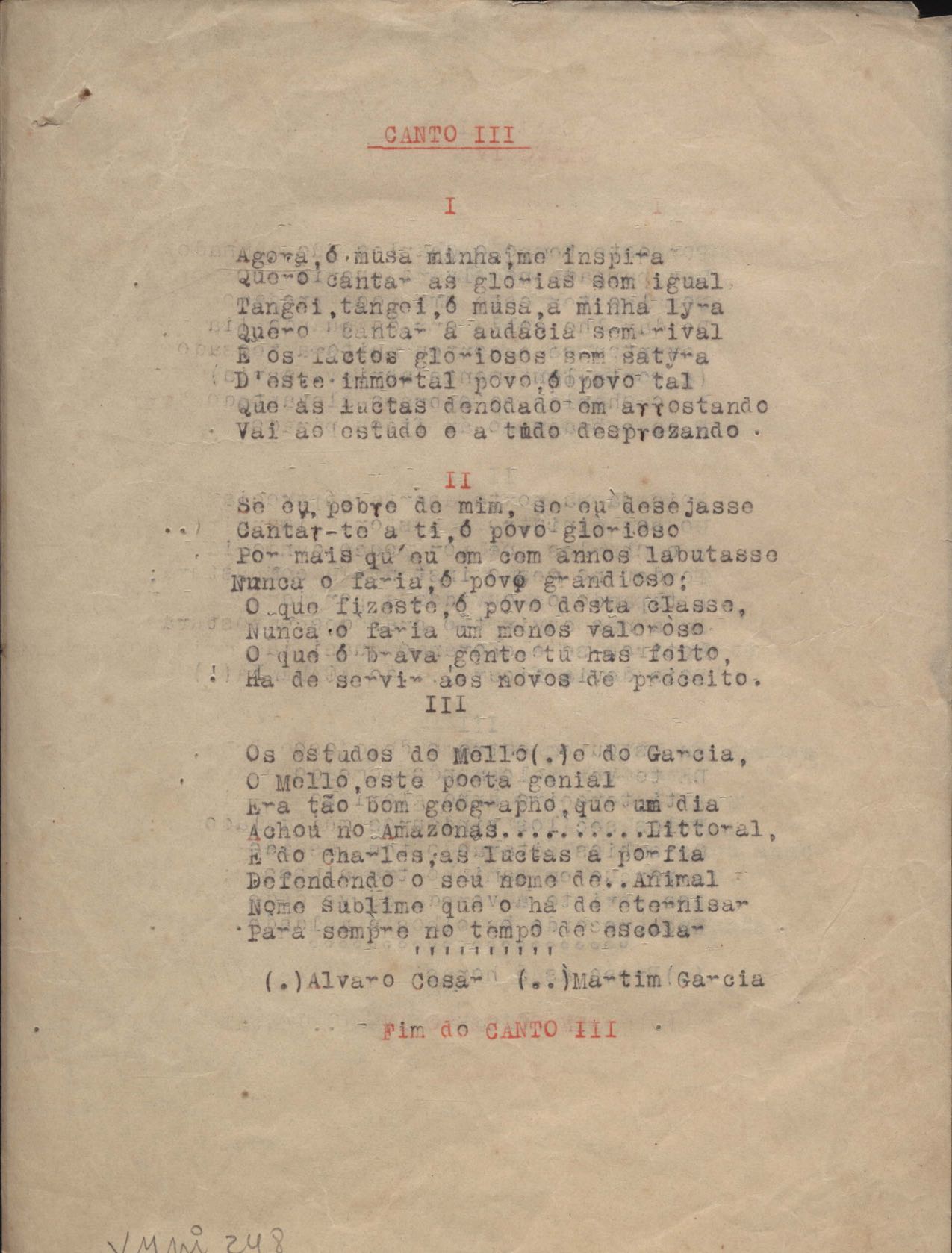 Este documento faz parte do dossiê VMPI248, "Poemas esparsos", que contempla poemas datados entre 21 ago. 1927 e 8 dez. 1971. Destes poemas, 401 são esboços e não possuem título (cf. registro VM0PI248_1_232). Estes originais não podem ser tomados como obra inédita. Ideias, tentativas, escritos inacabados, abandonados ou aproveitados posteriormente com outra forma compõem o dossiê.