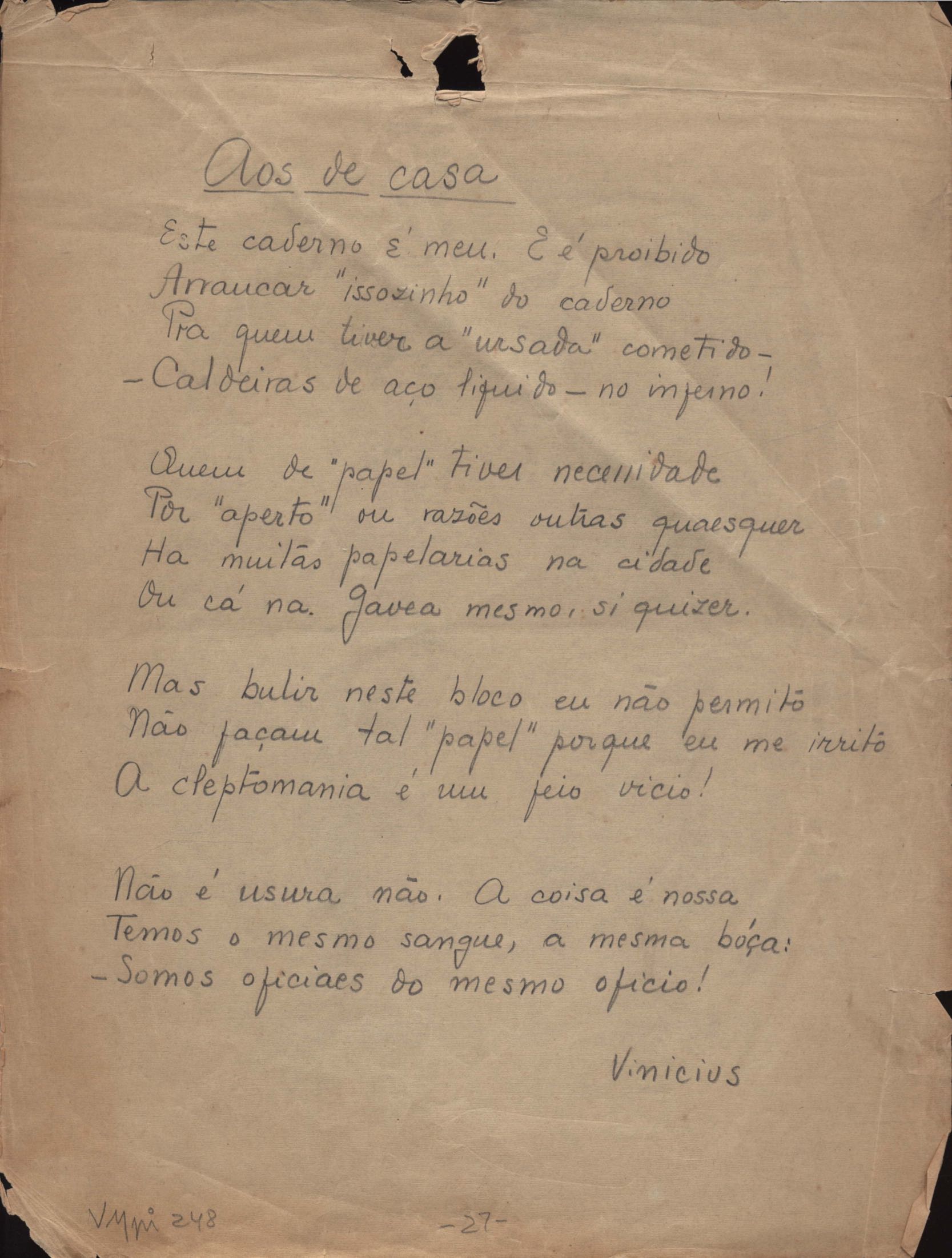 Este documento faz parte do dossiê VMPI248, "Poemas esparsos", que contempla poemas datados entre 21 ago. 1927 e 8 dez. 1971. Destes poemas, 401 são esboços e não possuem título (cf. registro VM0PI248_1_232). Estes originais não podem ser tomados como obra inédita. Ideias, tentativas, escritos inacabados, abandonados ou aproveitados posteriormente com outra forma compõem o dossiê.