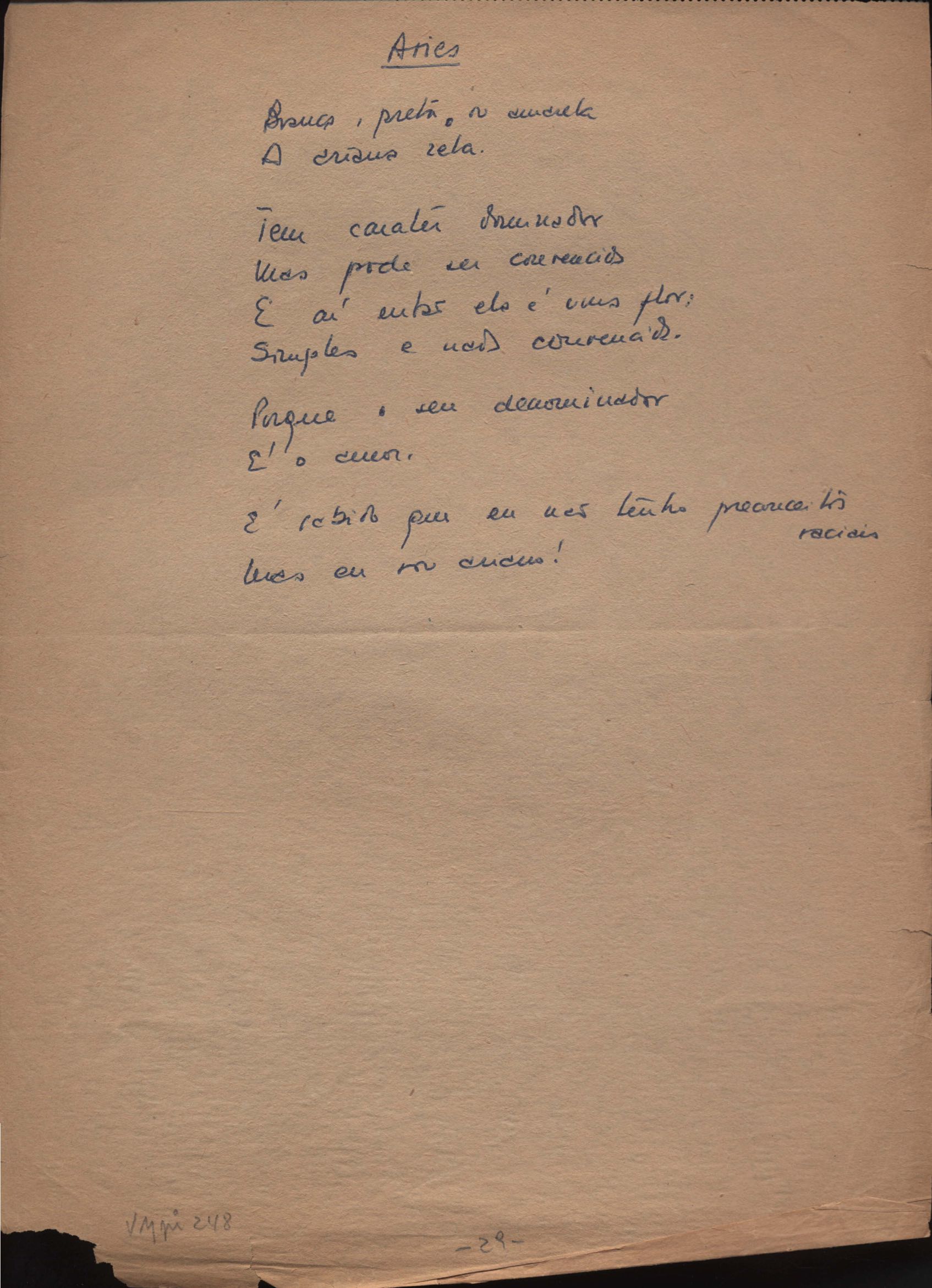 Este documento faz parte do dossiê VMPI248, "Poemas esparsos", que contempla poemas datados entre 21 ago. 1927 e 8 dez. 1971. Destes poemas, 401 são esboços e não possuem título (cf. registro VM0PI248_1_232). Estes originais não podem ser tomados como obra inédita. Ideias, tentativas, escritos inacabados, abandonados ou aproveitados posteriormente com outra forma compõem o dossiê.