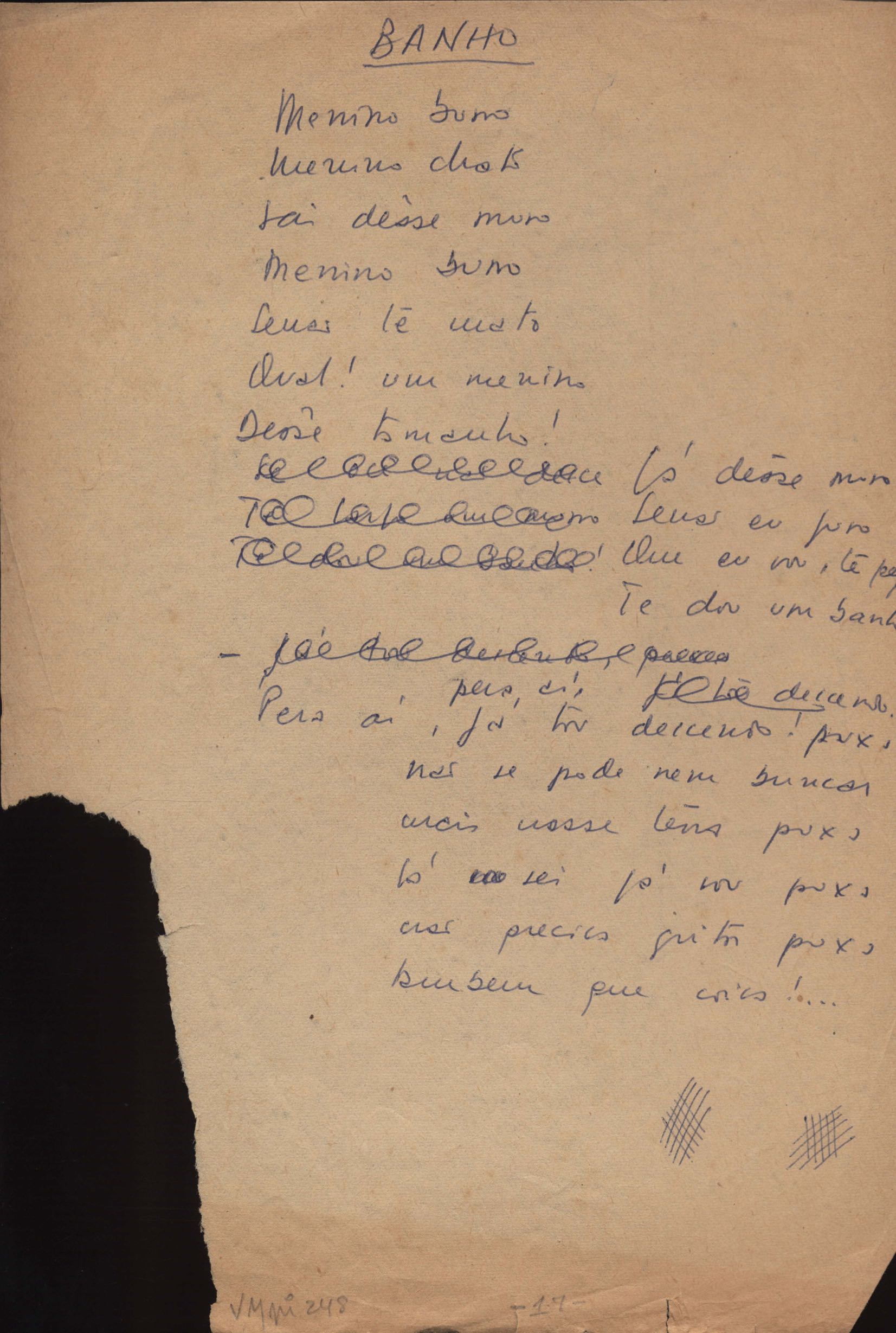 Este documento faz parte do dossiê VMPI248, "Poemas esparsos", que contempla poemas datados entre 21 ago. 1927 e 8 dez. 1971. Destes poemas, 401 são esboços e não possuem título (cf. registro VM0PI248_1_232). Estes originais não podem ser tomados como obra inédita. Ideias, tentativas, escritos inacabados, abandonados ou aproveitados posteriormente com outra forma compõem o dossiê.