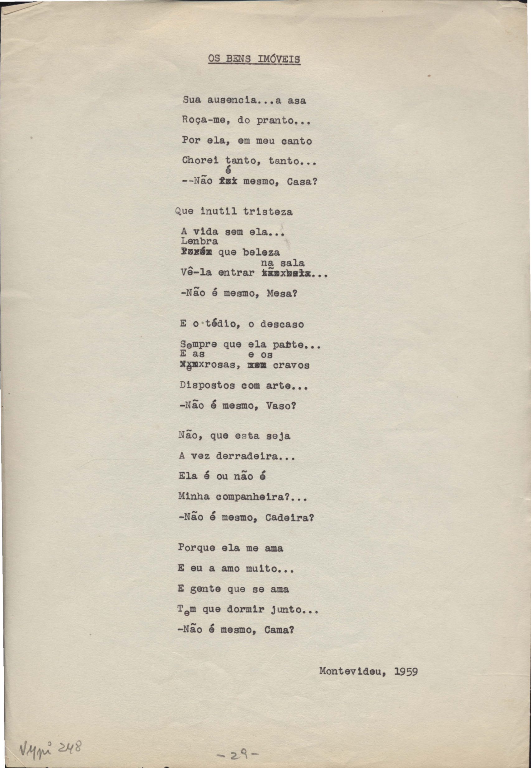 Este documento faz parte do dossiê VMPI248, "Poemas esparsos", que contempla poemas datados entre 21 ago. 1927 e 8 dez. 1971. Destes poemas, 401 são esboços e não possuem título (cf. registro VM0PI248_1_232). Estes originais não podem ser tomados como obra inédita. Ideias, tentativas, escritos inacabados, abandonados ou aproveitados posteriormente com outra forma compõem o dossiê.
