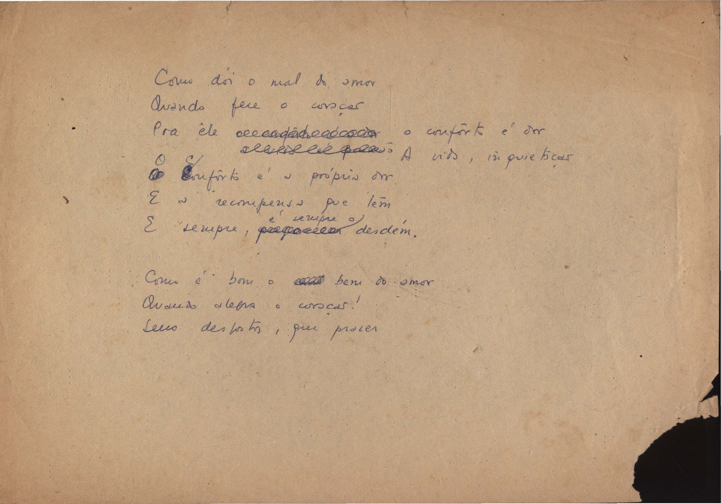 Este documento faz parte do dossiê VMPI248, "Poemas esparsos", que contempla poemas datados entre 21 ago. 1927 e 8 dez. 1971. Destes poemas, 401 são esboços e não possuem título (cf. registro VM0PI248_1_232). Estes originais não podem ser tomados como obra inédita. Ideias, tentativas, escritos inacabados, abandonados ou aproveitados posteriormente com outra forma compõem o dossiê.