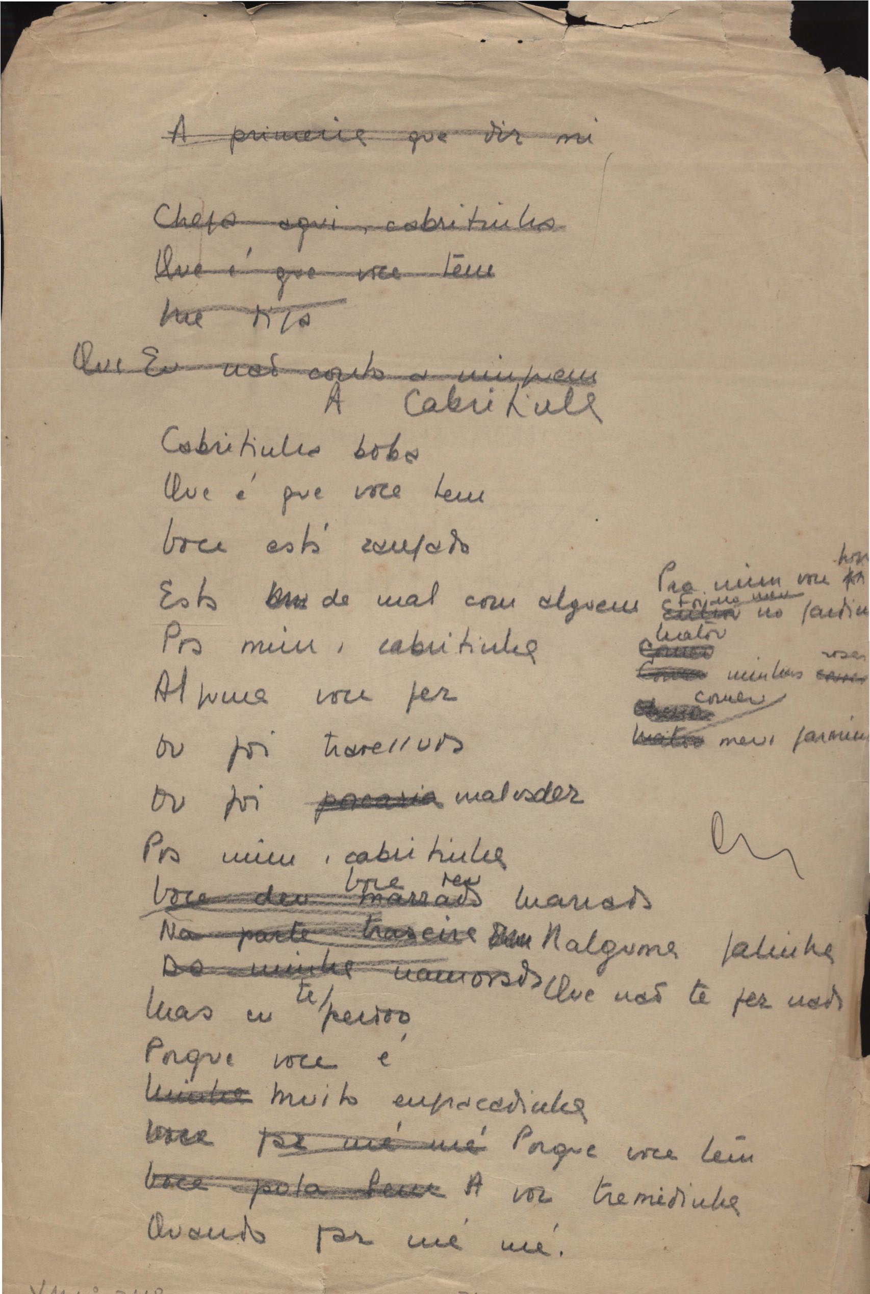Este documento faz parte do dossiê VMPI248, "Poemas esparsos", que contempla poemas datados entre 21 ago. 1927 e 8 dez. 1971. Destes poemas, 401 são esboços e não possuem título (cf. registro VM0PI248_1_232). Estes originais não podem ser tomados como obra inédita. Ideias, tentativas, escritos inacabados, abandonados ou aproveitados posteriormente com outra forma compõem o dossiê.