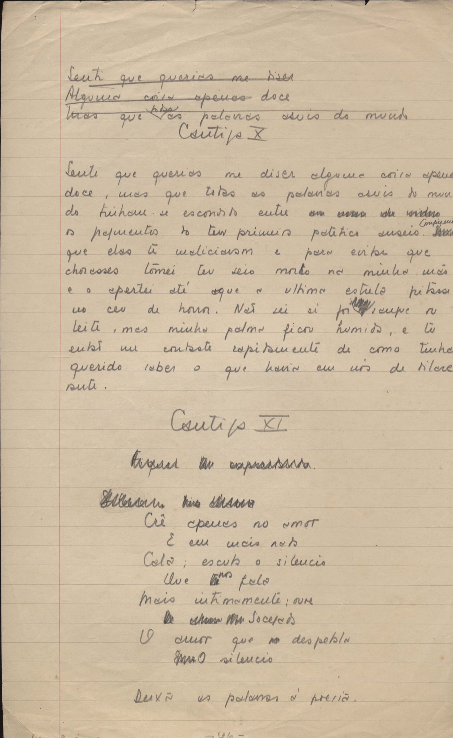 Este documento faz parte do dossiê VMPI248, "Poemas esparsos", que contempla poemas datados entre 21 ago. 1927 e 8 dez. 1971. Destes poemas, 401 são esboços e não possuem título (cf. registro VM0PI248_1_232). Estes originais não podem ser tomados como obra inédita. Ideias, tentativas, escritos inacabados, abandonados ou aproveitados posteriormente com outra forma compõem o dossiê.