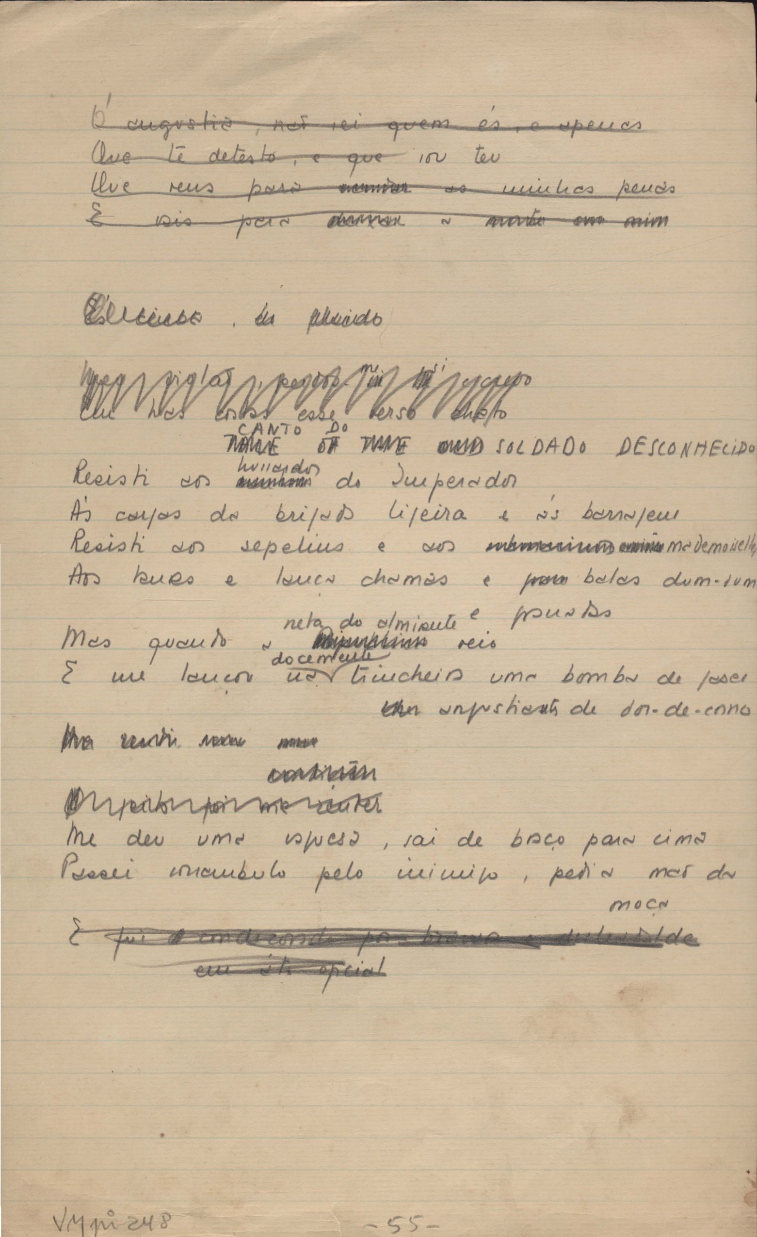 Este documento faz parte do dossiê VMPI248, "Poemas esparsos", que contempla poemas datados entre 21 ago. 1927 e 8 dez. 1971. Destes poemas, 401 são esboços e não possuem título (cf. registro VM0PI248_1_232). Estes originais não podem ser tomados como obra inédita. Ideias, tentativas, escritos inacabados, abandonados ou aproveitados posteriormente com outra forma compõem o dossiê.