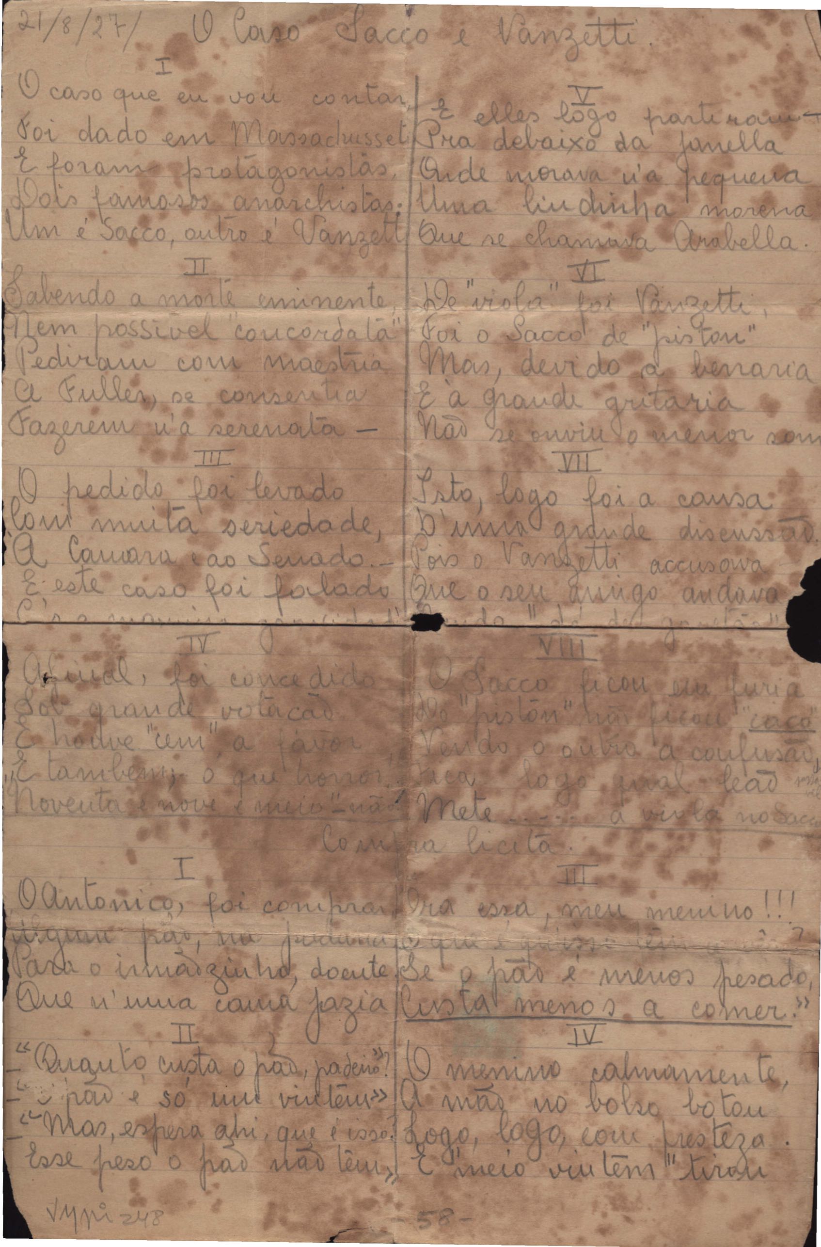 Este documento faz parte do dossiê VMPI248, "Poemas esparsos", que contempla poemas datados entre 21 ago. 1927 e 8 dez. 1971. Destes poemas, 401 são esboços e não possuem título (cf. registro VM0PI248_1_232). Estes originais não podem ser tomados como obra inédita. Ideias, tentativas, escritos inacabados, abandonados ou aproveitados posteriormente com outra forma compõem o dossiê.