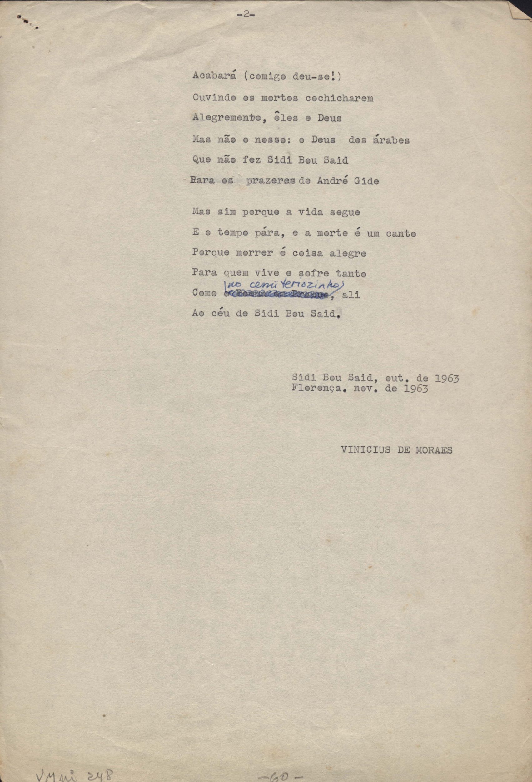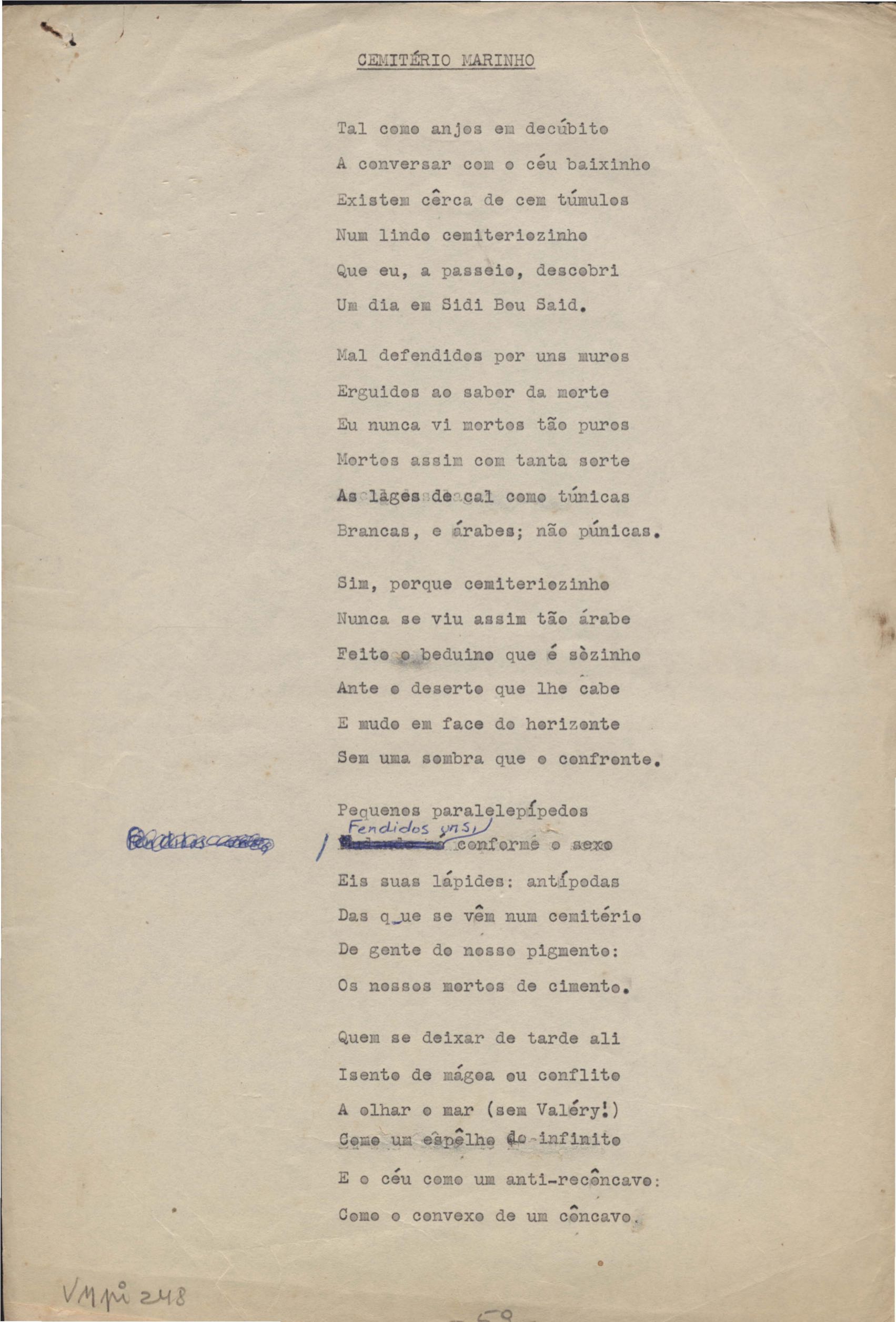 Este documento faz parte do dossiê VMPI248, "Poemas esparsos", que contempla poemas datados entre 21 ago. 1927 e 8 dez. 1971. Destes poemas, 401 são esboços e não possuem título (cf. registro VM0PI248_1_232). Estes originais não podem ser tomados como obra inédita. Ideias, tentativas, escritos inacabados, abandonados ou aproveitados posteriormente com outra forma compõem o dossiê.