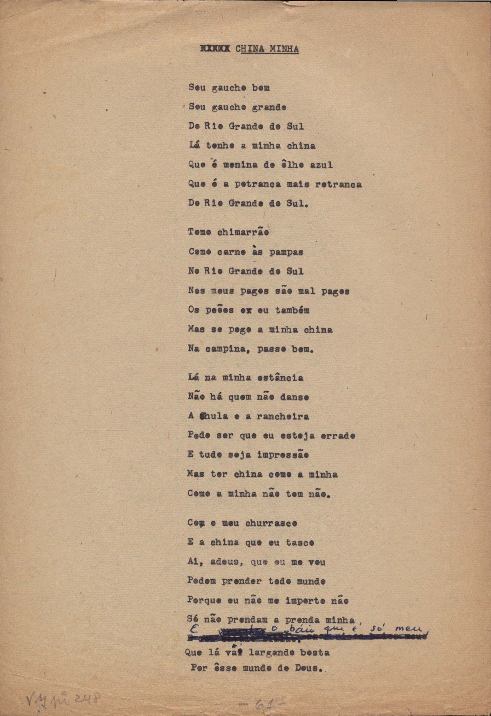 Este documento faz parte do dossiê VMPI248, "Poemas esparsos", que contempla poemas datados entre 21 ago. 1927 e 8 dez. 1971. Destes poemas, 401 são esboços e não possuem título (cf. registro VM0PI248_1_232). Estes originais não podem ser tomados como obra inédita. Ideias, tentativas, escritos inacabados, abandonados ou aproveitados posteriormente com outra forma compõem o dossiê.