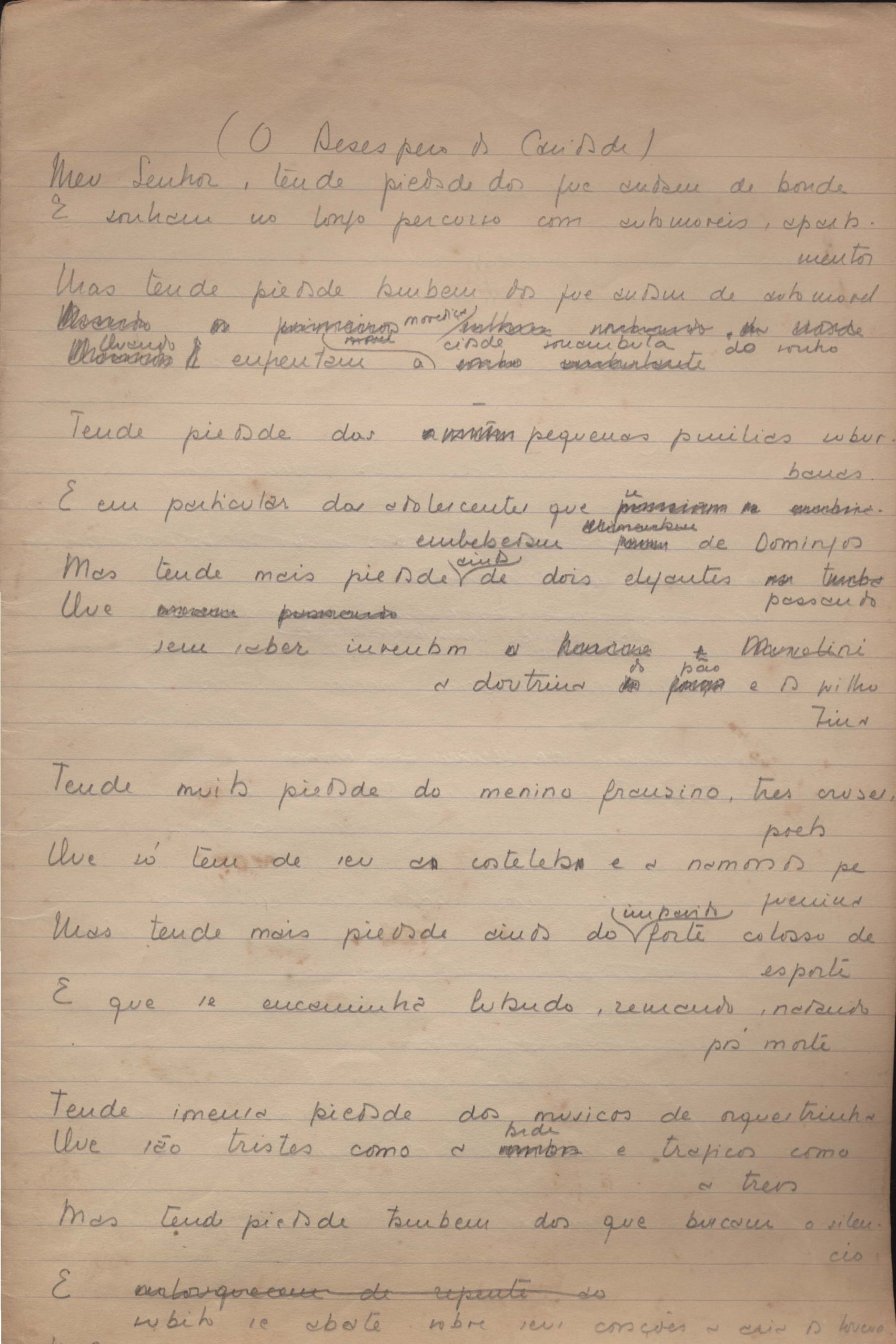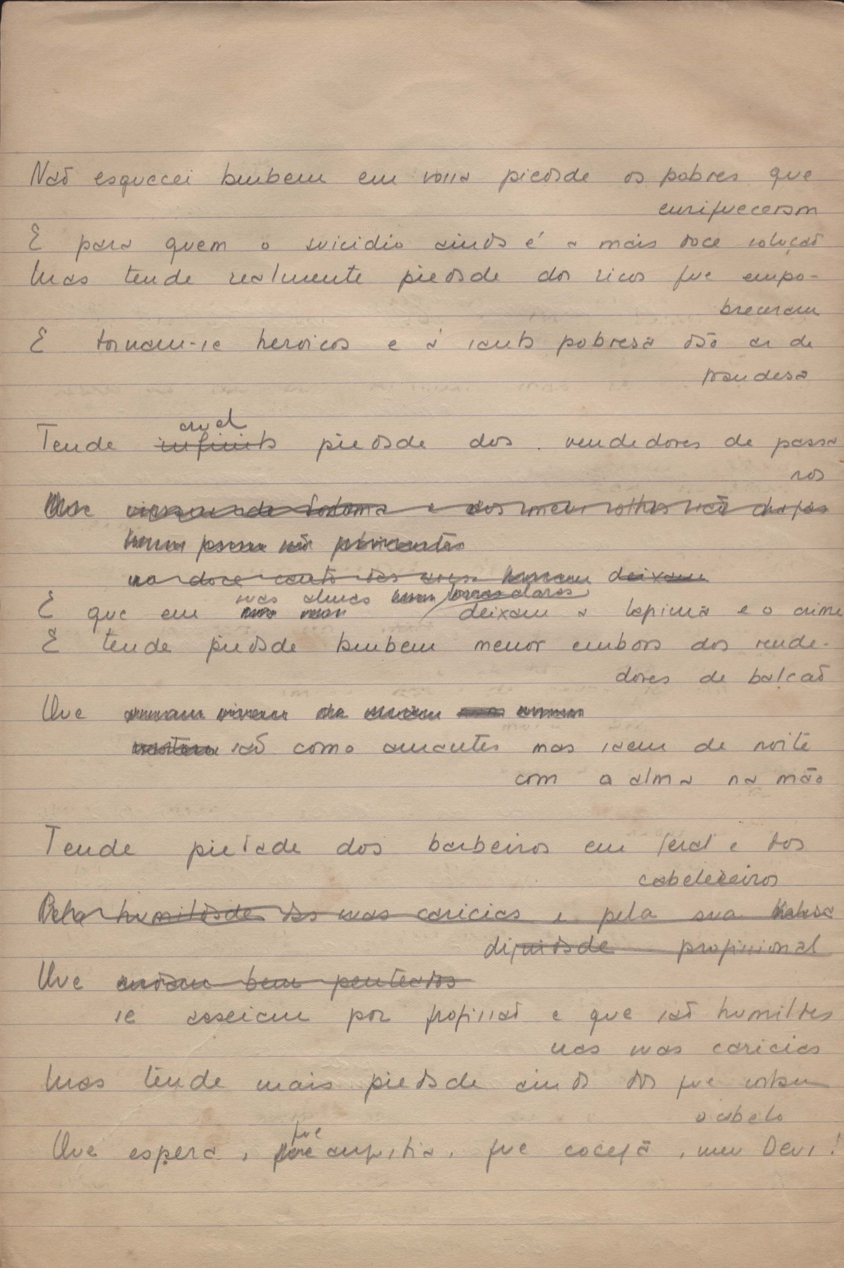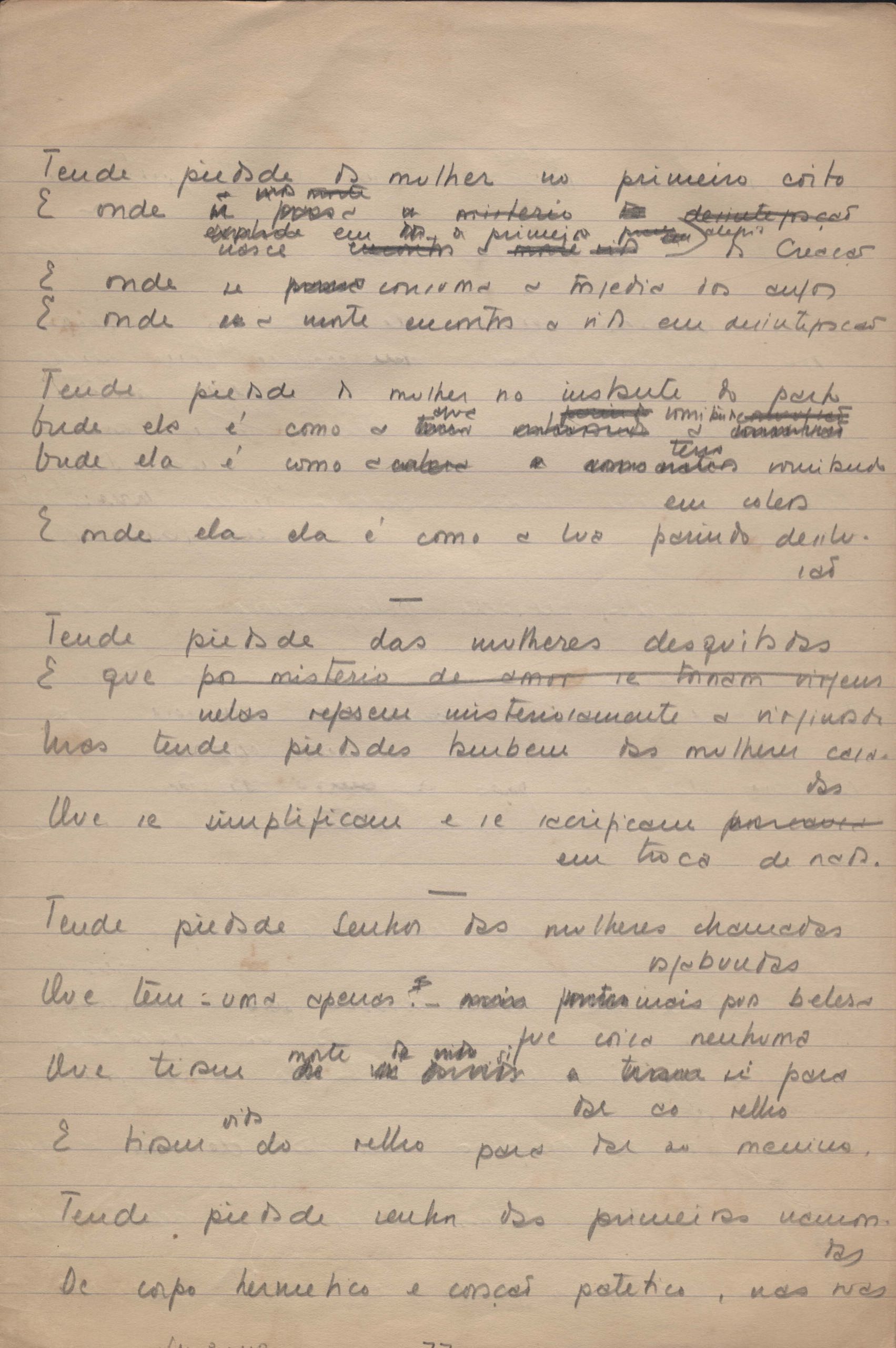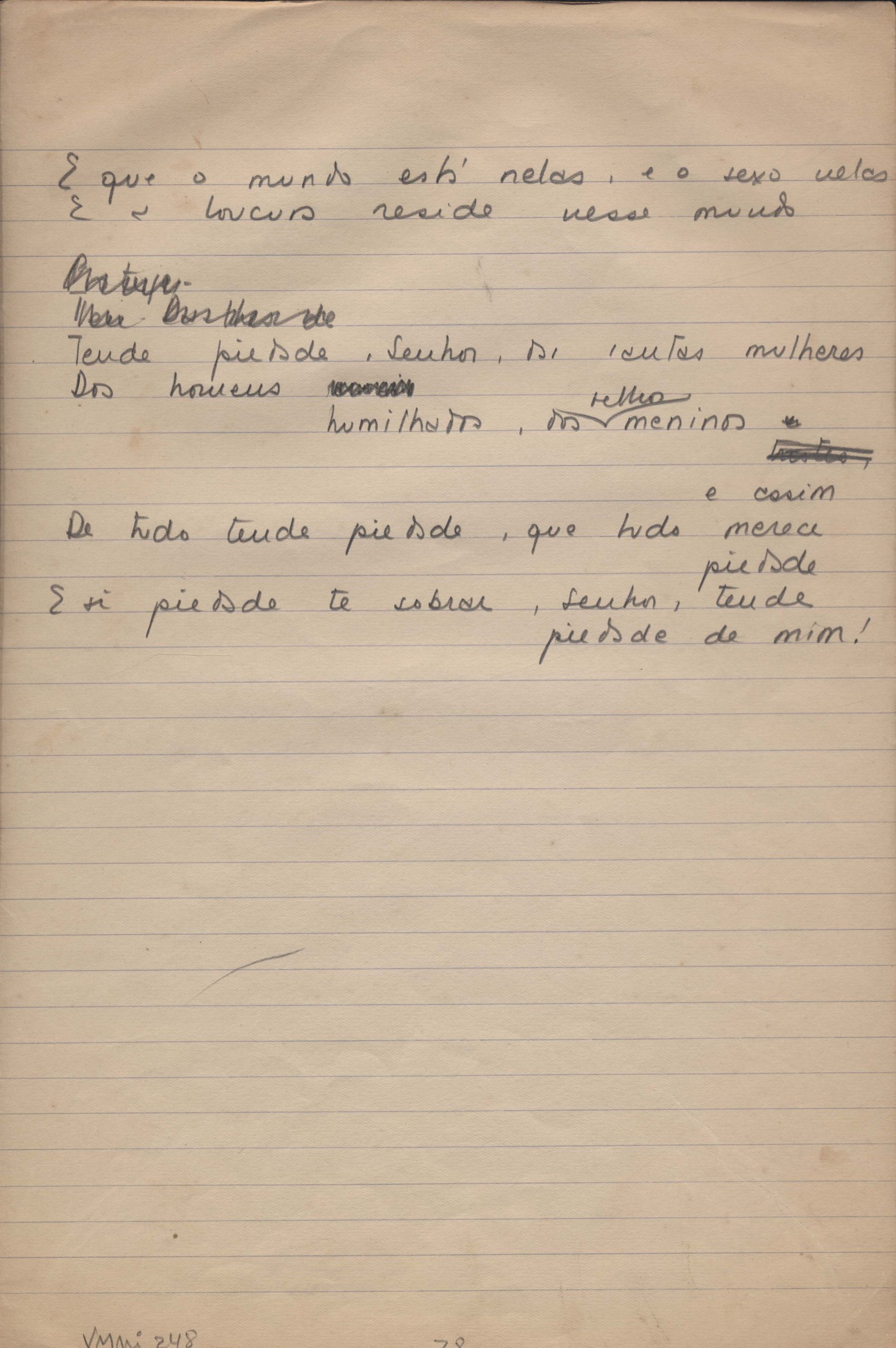 Este documento faz parte do dossiê VMPI248, "Poemas esparsos", que contempla poemas datados entre 21 ago. 1927 e 8 dez. 1971. Destes poemas, 401 são esboços e não possuem título (cf. registro VM0PI248_1_232). Estes originais não podem ser tomados como obra inédita. Ideias, tentativas, escritos inacabados, abandonados ou aproveitados posteriormente com outra forma compõem o dossiê.