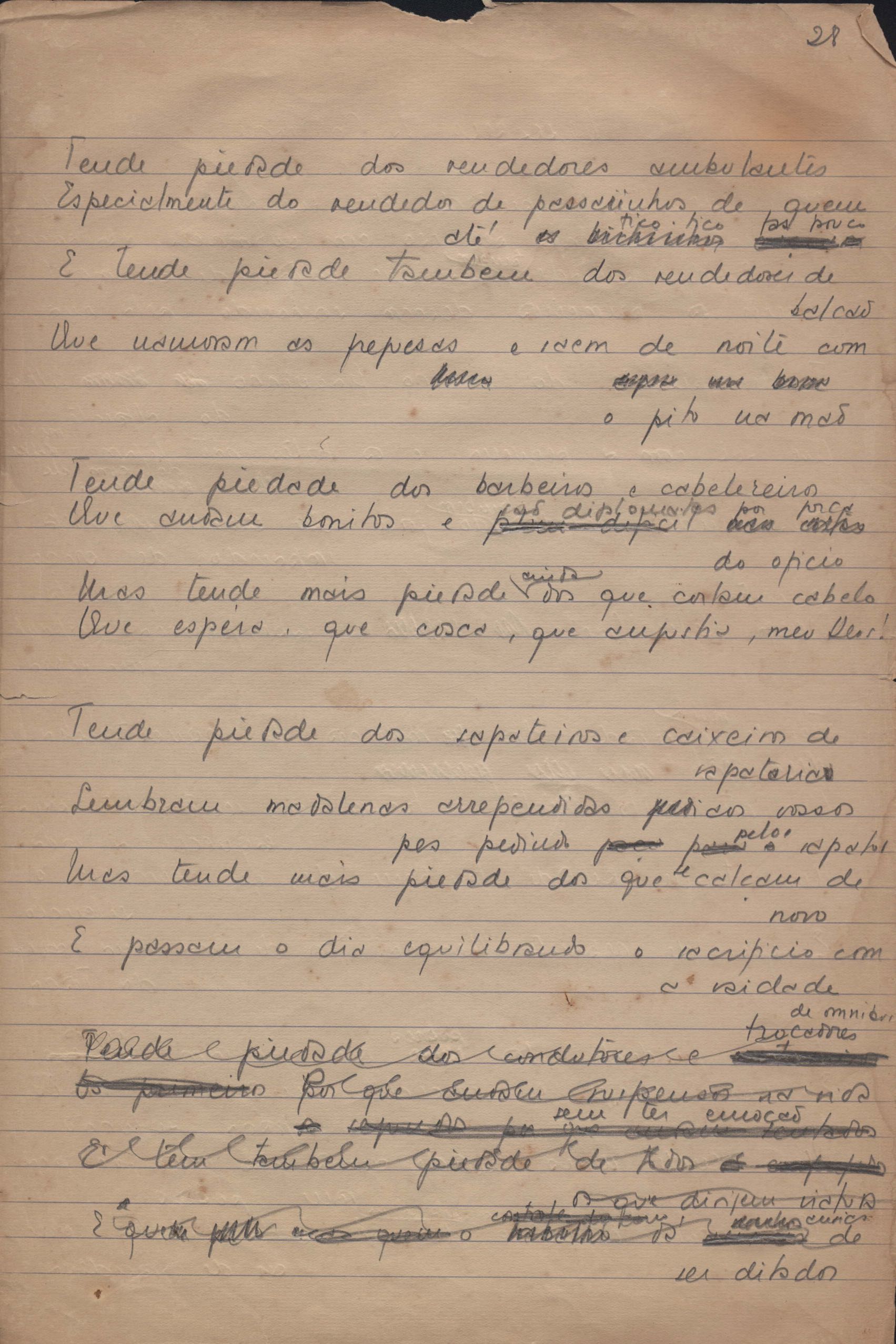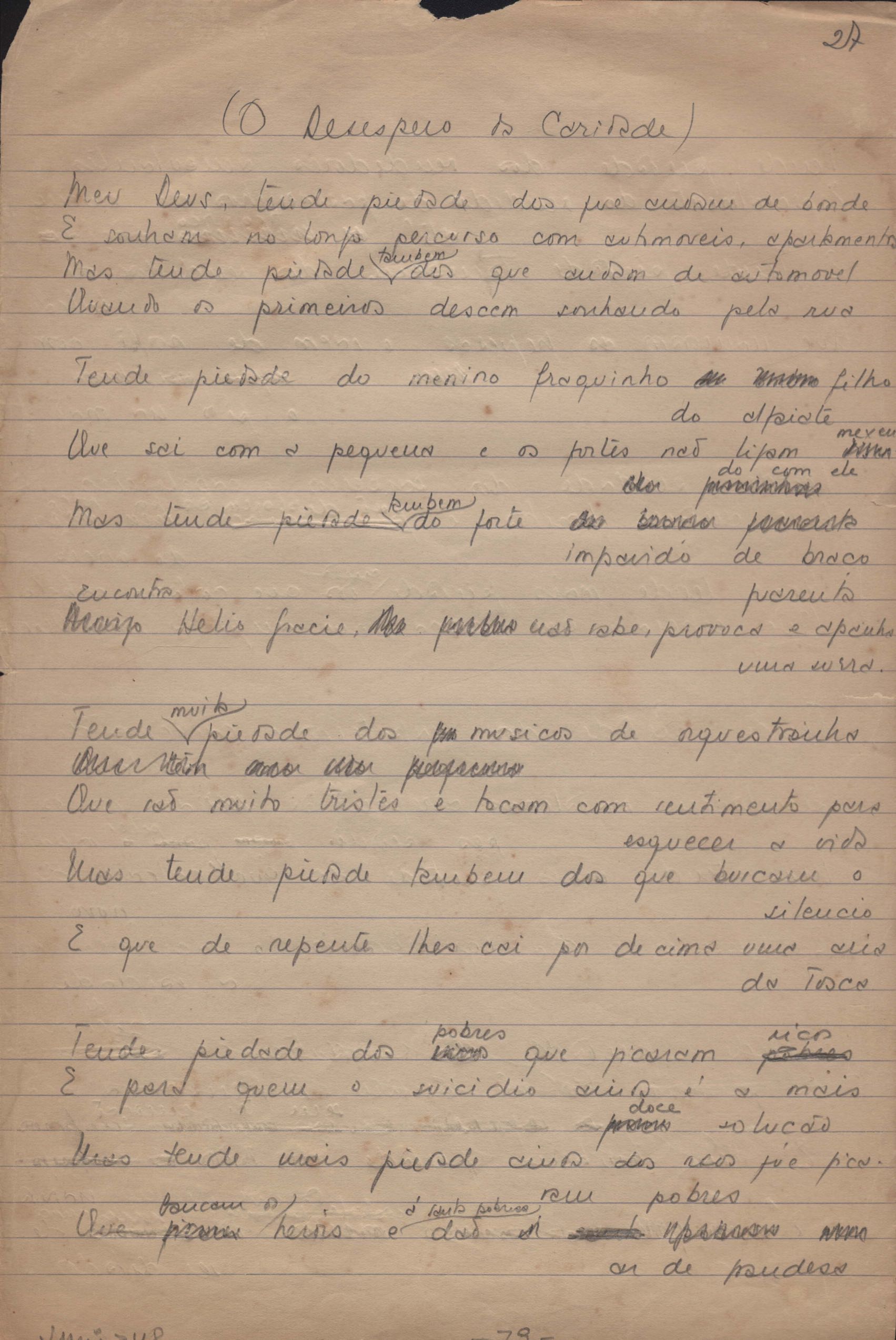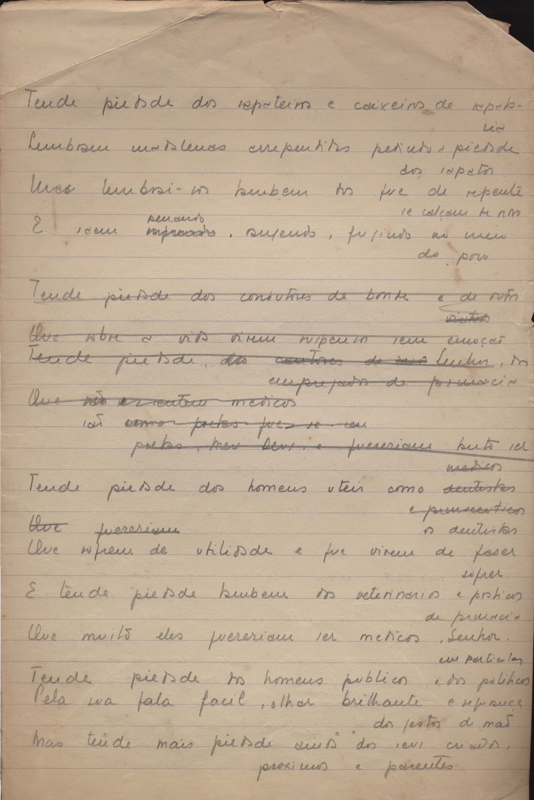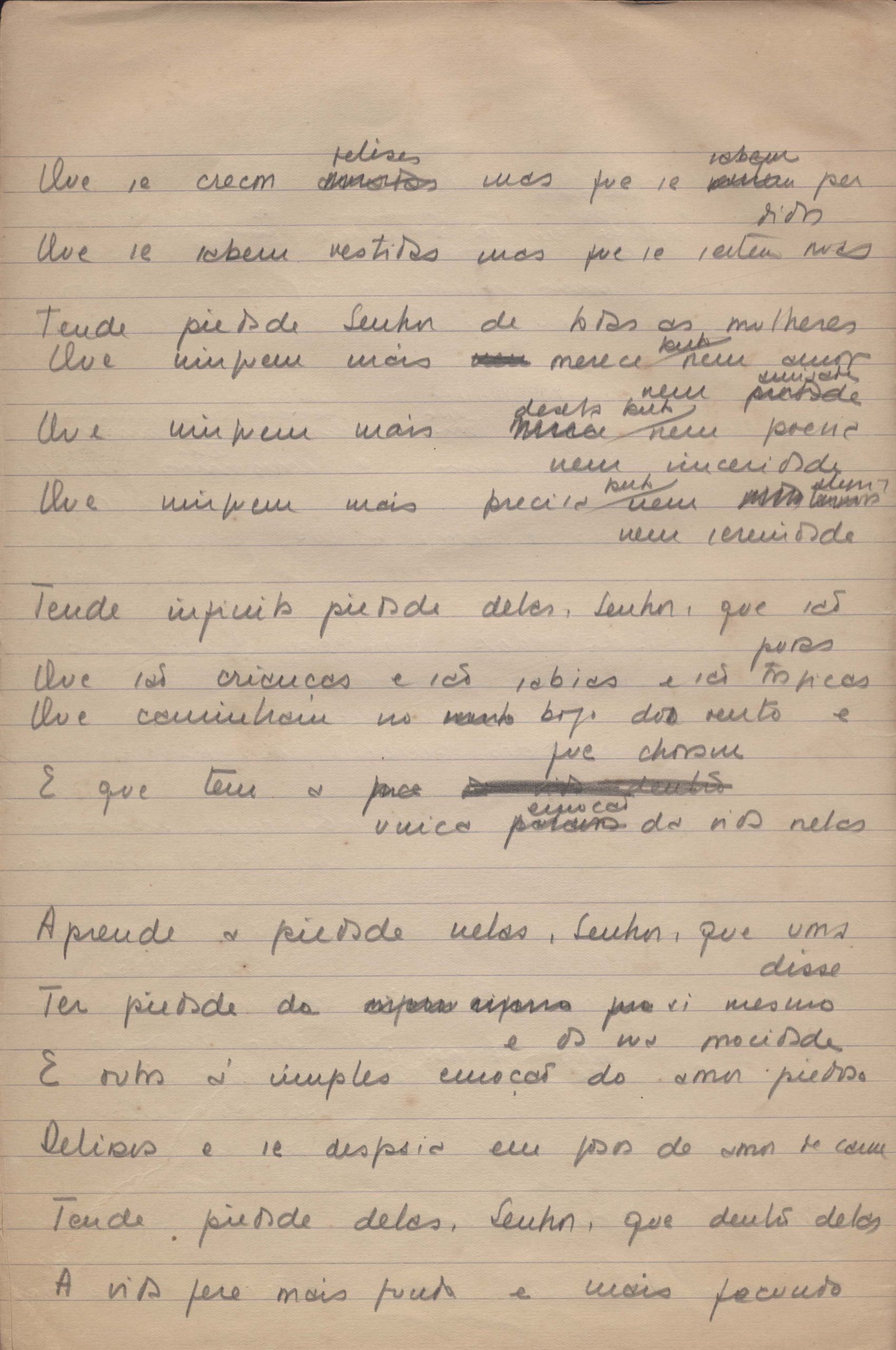 Este documento faz parte do dossiê VMPI248, "Poemas esparsos", que contempla poemas datados entre 21 ago. 1927 e 8 dez. 1971. Destes poemas, 401 são esboços e não possuem título (cf. registro VM0PI248_1_232). Estes originais não podem ser tomados como obra inédita. Ideias, tentativas, escritos inacabados, abandonados ou aproveitados posteriormente com outra forma compõem o dossiê.