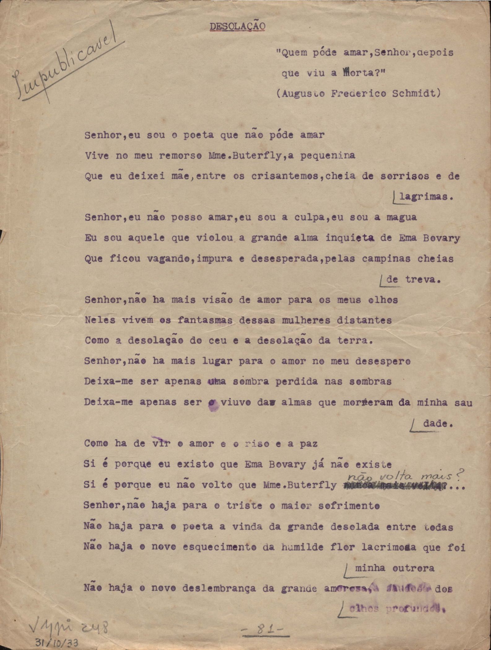 Este documento faz parte do dossiê VMPI248, "Poemas esparsos", que contempla poemas datados entre 21 ago. 1927 e 8 dez. 1971. Destes poemas, 401 são esboços e não possuem título (cf. registro VM0PI248_1_232). Estes originais não podem ser tomados como obra inédita. Ideias, tentativas, escritos inacabados, abandonados ou aproveitados posteriormente com outra forma compõem o dossiê.