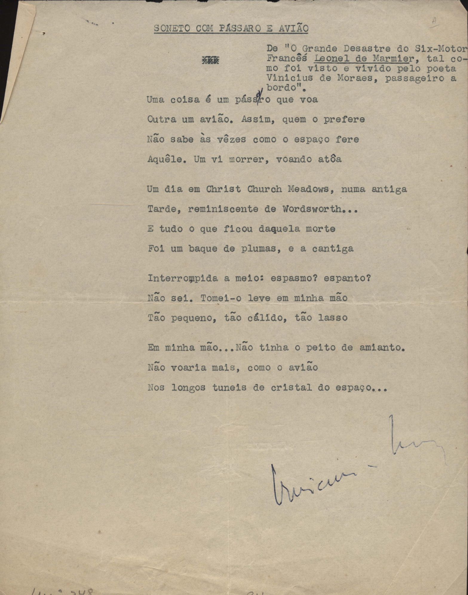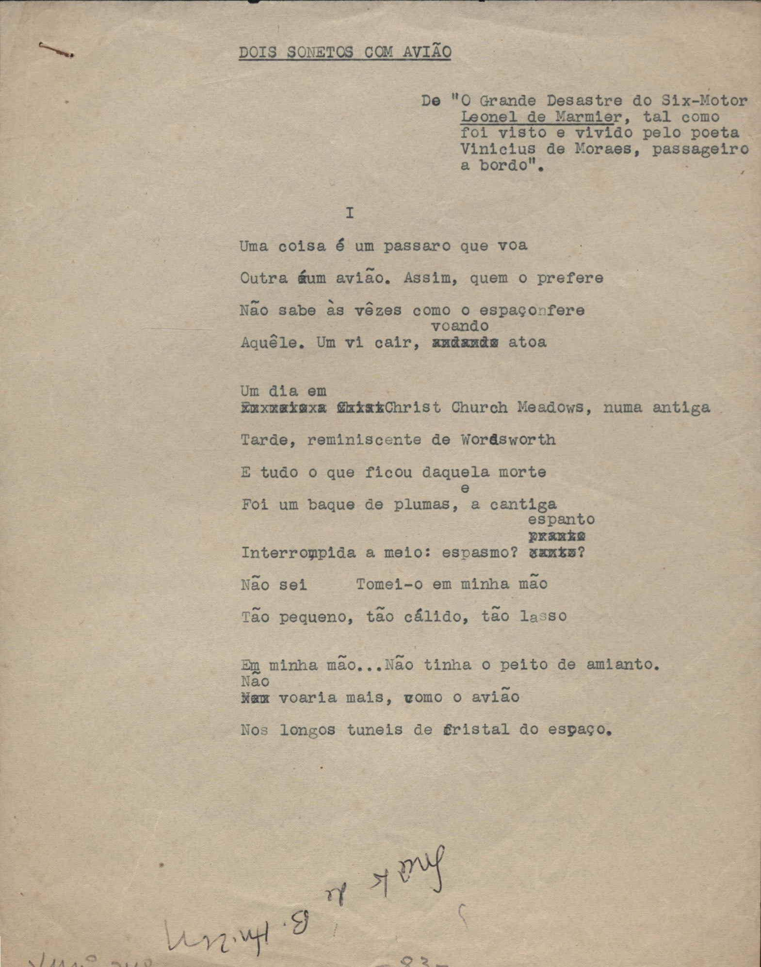 Este documento faz parte do dossiê VMPI248, "Poemas esparsos", que contempla poemas datados entre 21 ago. 1927 e 8 dez. 1971. Destes poemas, 401 são esboços e não possuem título (cf. registro VM0PI248_1_232). Estes originais não podem ser tomados como obra inédita. Ideias, tentativas, escritos inacabados, abandonados ou aproveitados posteriormente com outra forma compõem o dossiê.