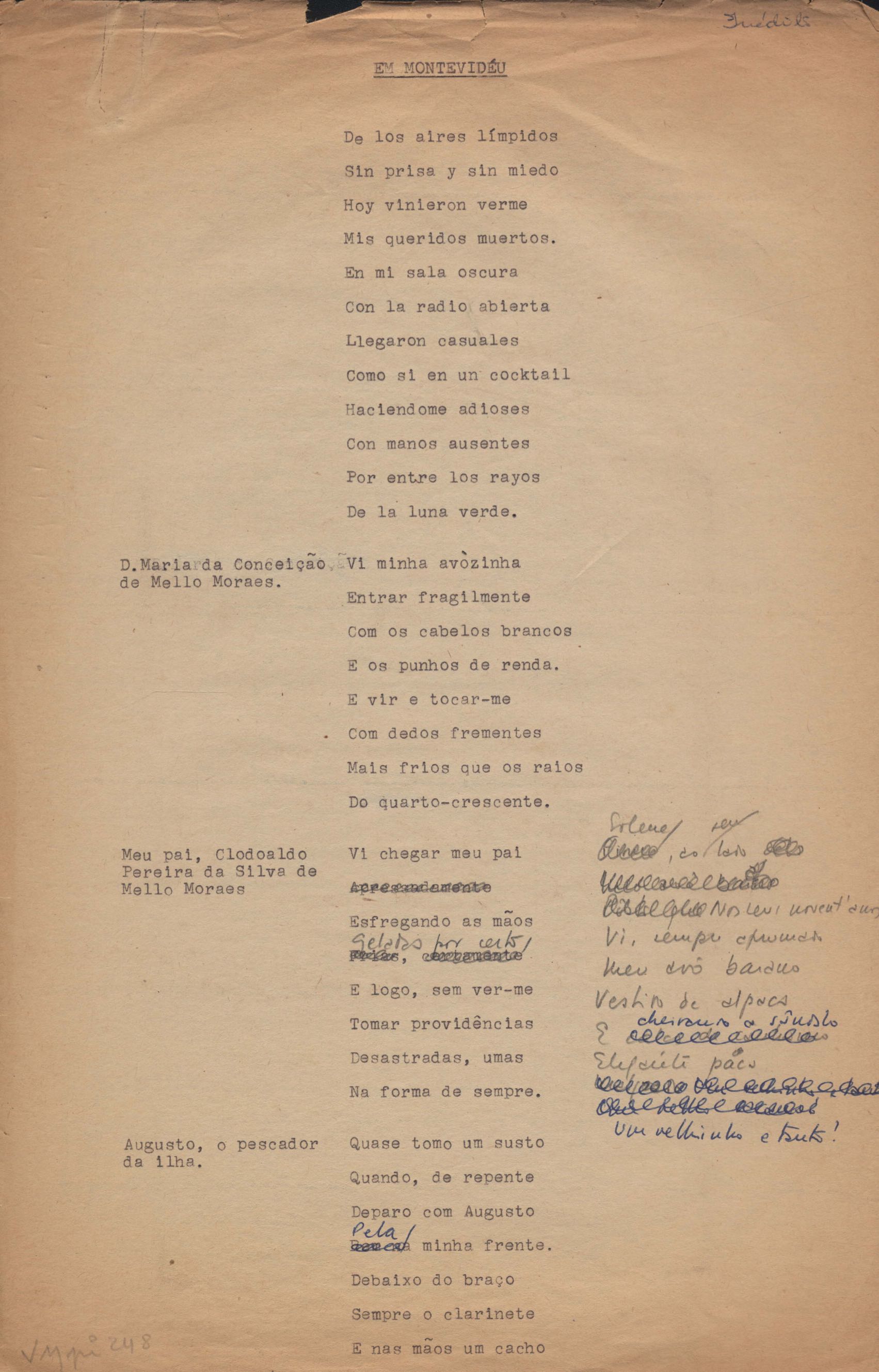 Este documento faz parte do dossiê VMPI248, "Poemas esparsos", que contempla poemas datados entre 21 ago. 1927 e 8 dez. 1971. Destes poemas, 401 são esboços e não possuem título (cf. registro VM0PI248_1_232). Estes originais não podem ser tomados como obra inédita. Ideias, tentativas, escritos inacabados, abandonados ou aproveitados posteriormente com outra forma compõem o dossiê.