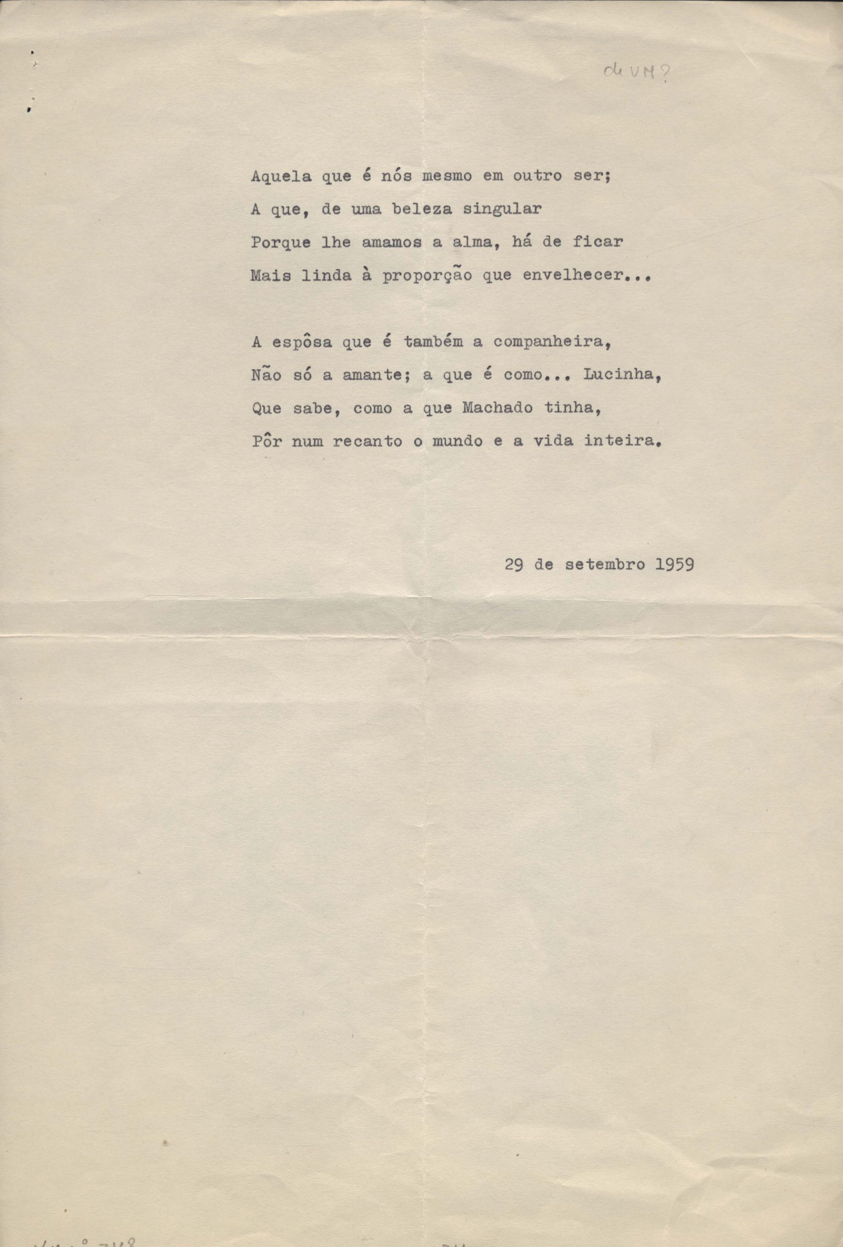 Este documento faz parte do dossiê VMPI248, "Poemas esparsos", que contempla poemas datados entre 21 ago. 1927 e 8 dez. 1971. Destes poemas, 401 são esboços e não possuem título (cf. registro VM0PI248_1_232). Estes originais não podem ser tomados como obra inédita. Ideias, tentativas, escritos inacabados, abandonados ou aproveitados posteriormente com outra forma compõem o dossiê.