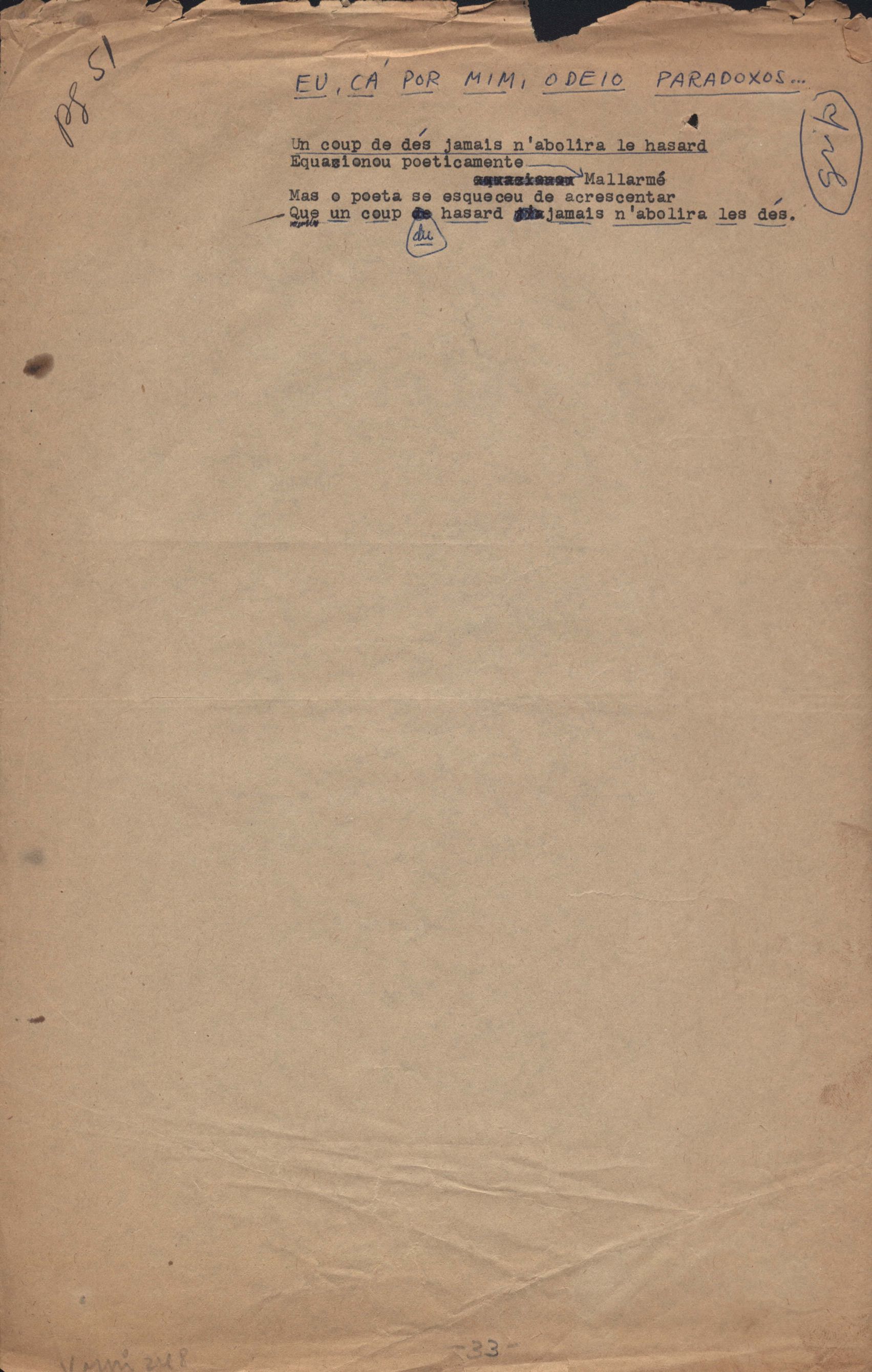 Este documento faz parte do dossiê VMPI248, "Poemas esparsos", que contempla poemas datados entre 21 ago. 1927 e 8 dez. 1971. Destes poemas, 401 são esboços e não possuem título (cf. registro VM0PI248_1_232). Estes originais não podem ser tomados como obra inédita. Ideias, tentativas, escritos inacabados, abandonados ou aproveitados posteriormente com outra forma compõem o dossiê.