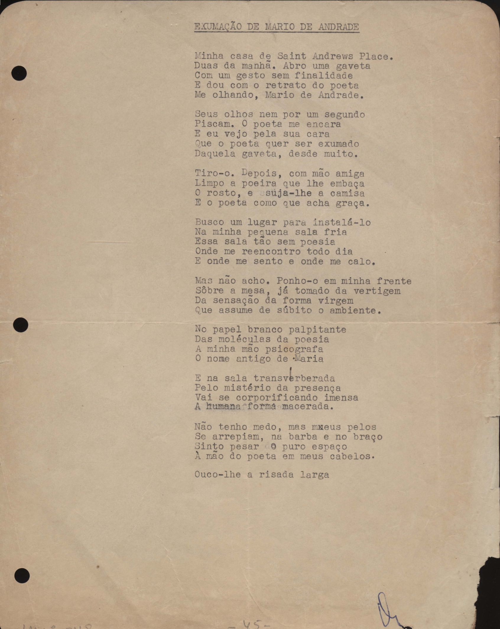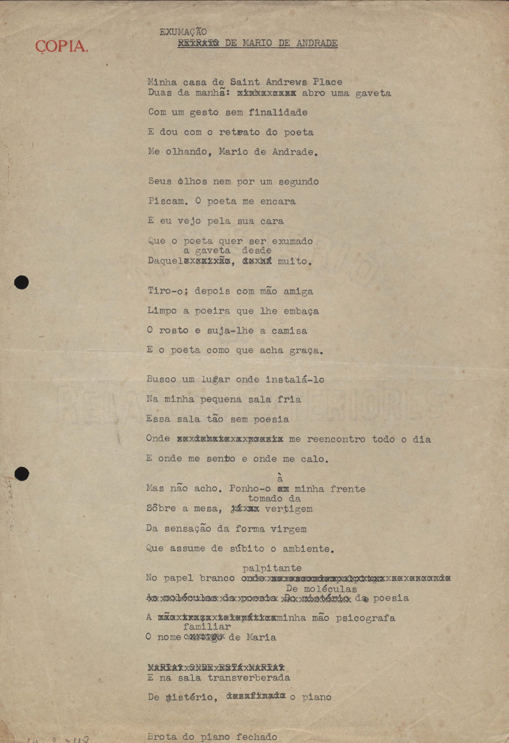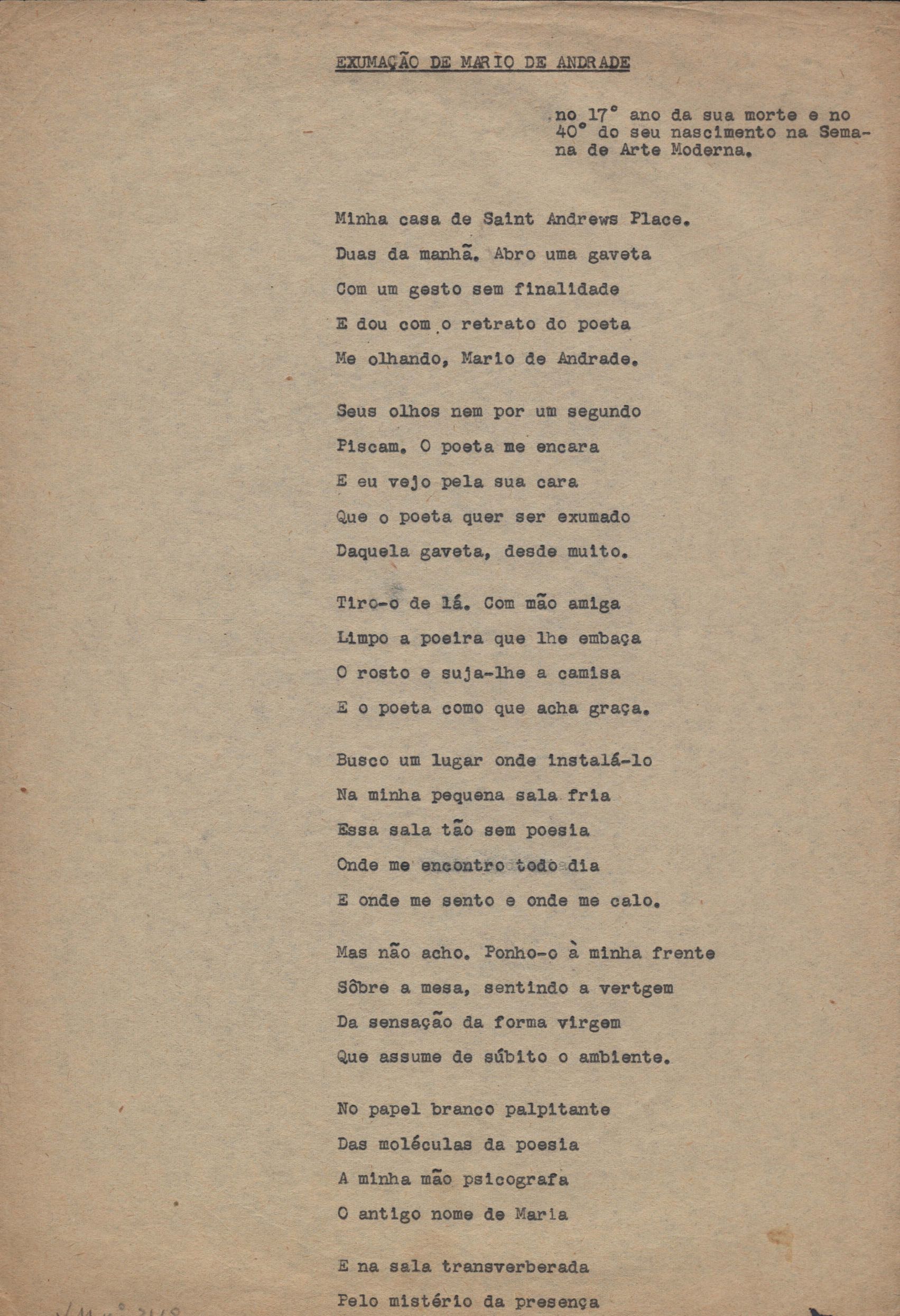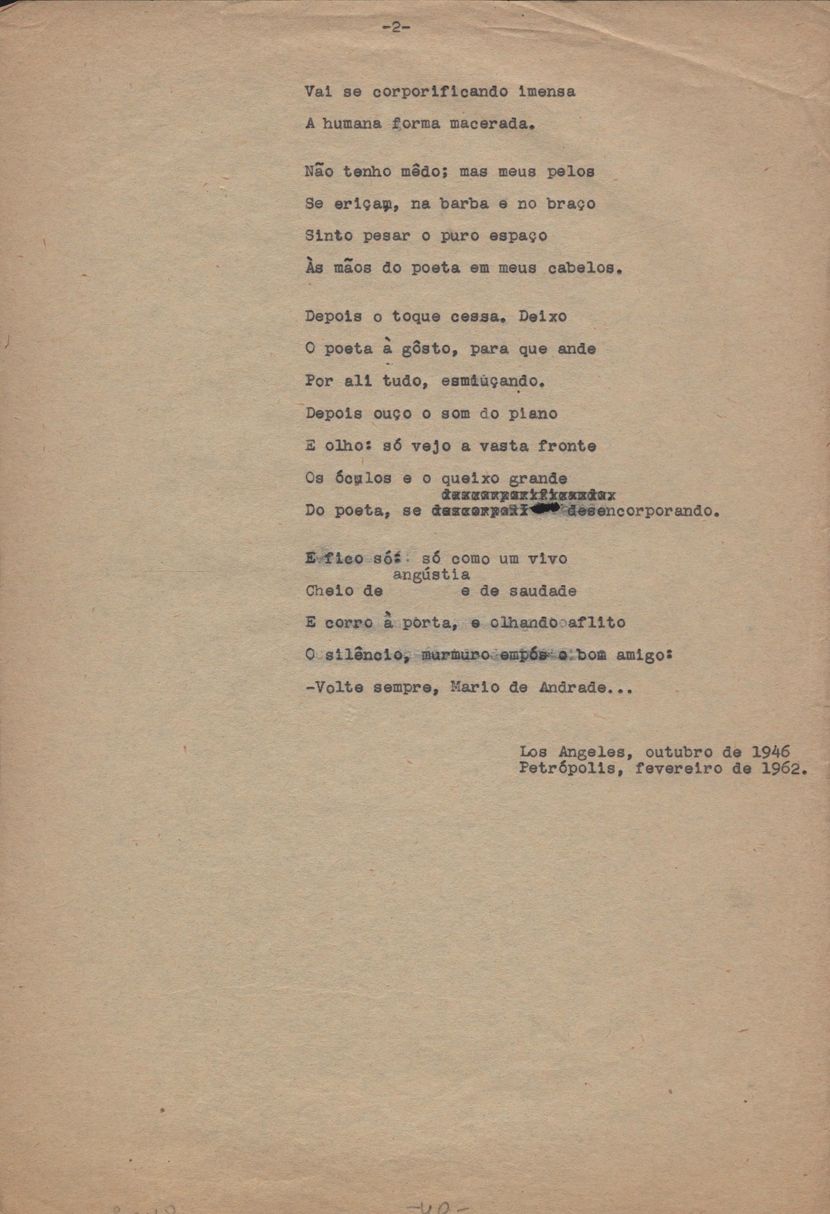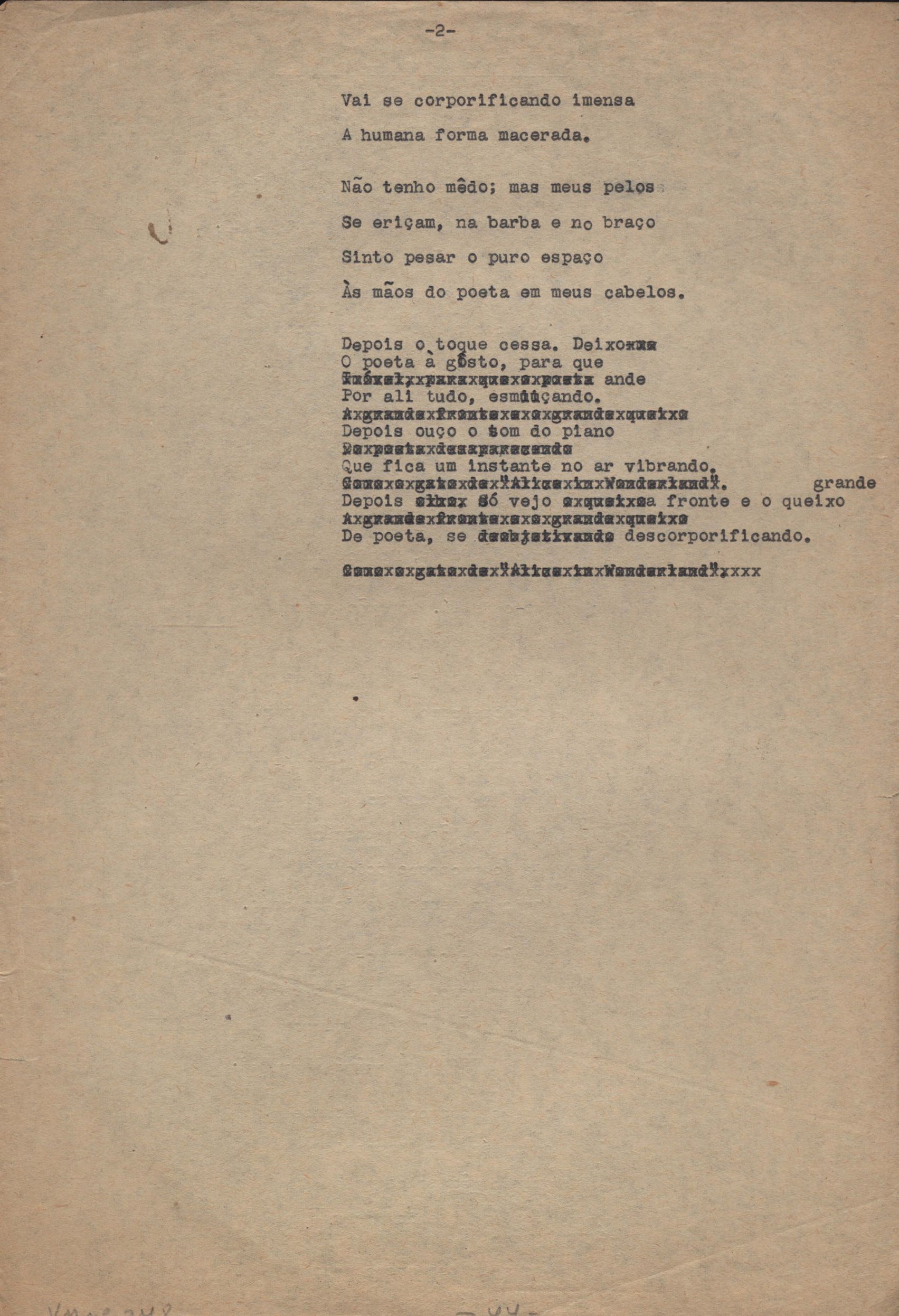 Este documento faz parte do dossiê VMPI248, "Poemas esparsos", que contempla poemas datados entre 21 ago. 1927 e 8 dez. 1971. Destes poemas, 401 são esboços e não possuem título (cf. registro VM0PI248_1_232). Estes originais não podem ser tomados como obra inédita. Ideias, tentativas, escritos inacabados, abandonados ou aproveitados posteriormente com outra forma compõem o dossiê.