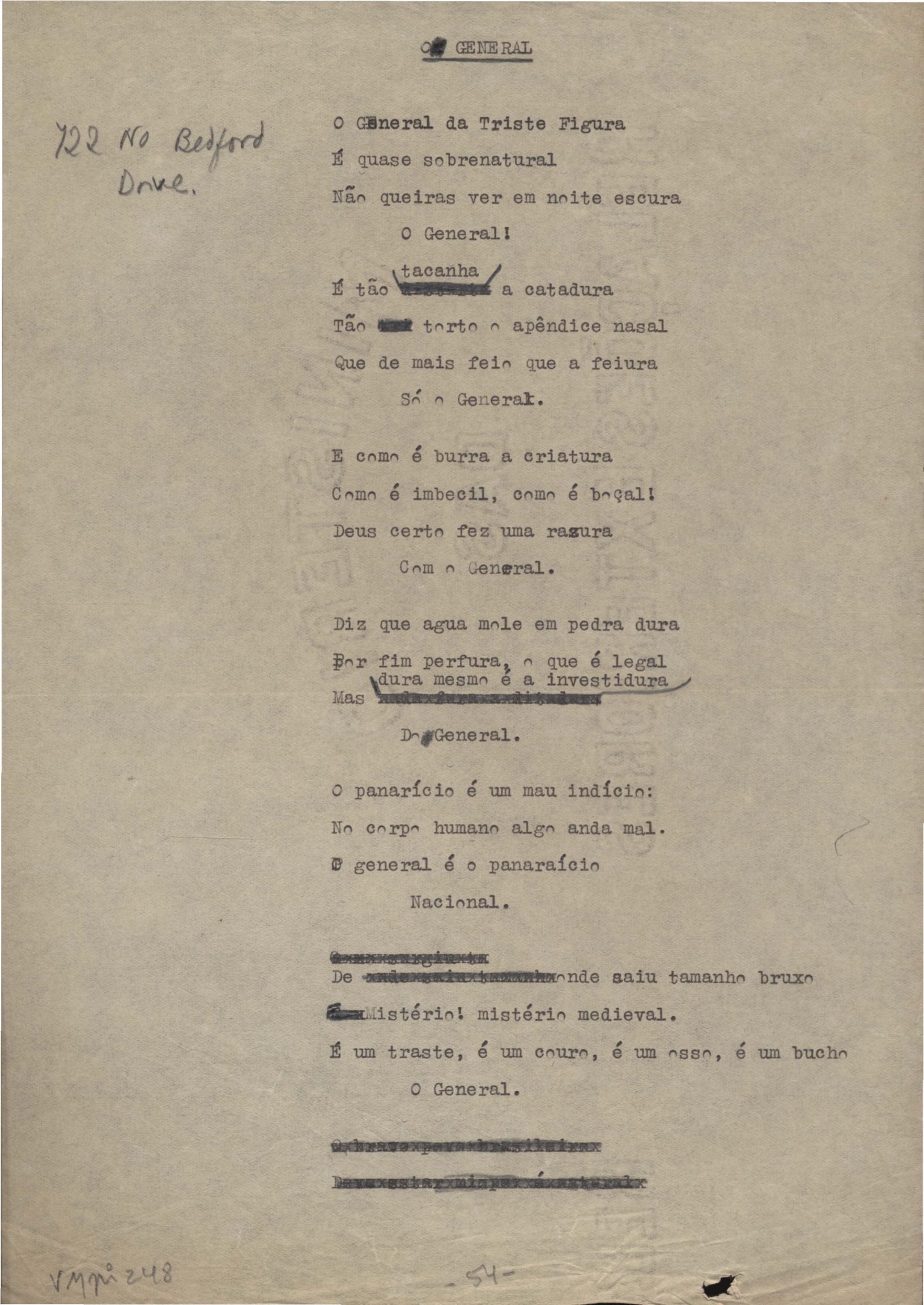 Este documento faz parte do dossiê VMPI248, "Poemas esparsos", que contempla poemas datados entre 21 ago. 1927 e 8 dez. 1971. Destes poemas, 401 são esboços e não possuem título (cf. registro VM0PI248_1_232). Estes originais não podem ser tomados como obra inédita. Ideias, tentativas, escritos inacabados, abandonados ou aproveitados posteriormente com outra forma compõem o dossiê.