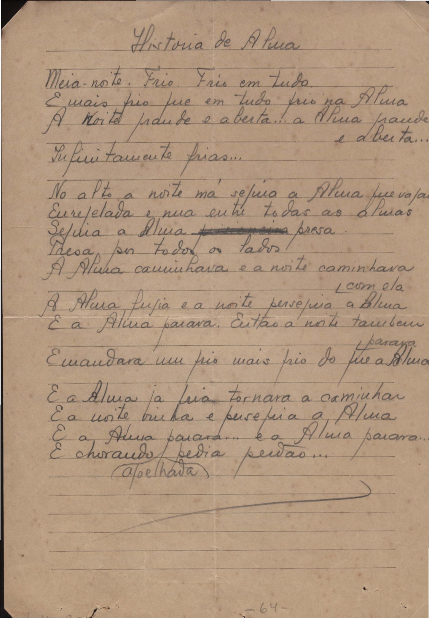 Este documento faz parte do dossiê VMPI248, "Poemas esparsos", que contempla poemas datados entre 21 ago. 1927 e 8 dez. 1971. Destes poemas, 401 são esboços e não possuem título (cf. registro VM0PI248_1_232). Estes originais não podem ser tomados como obra inédita. Ideias, tentativas, escritos inacabados, abandonados ou aproveitados posteriormente com outra forma compõem o dossiê.