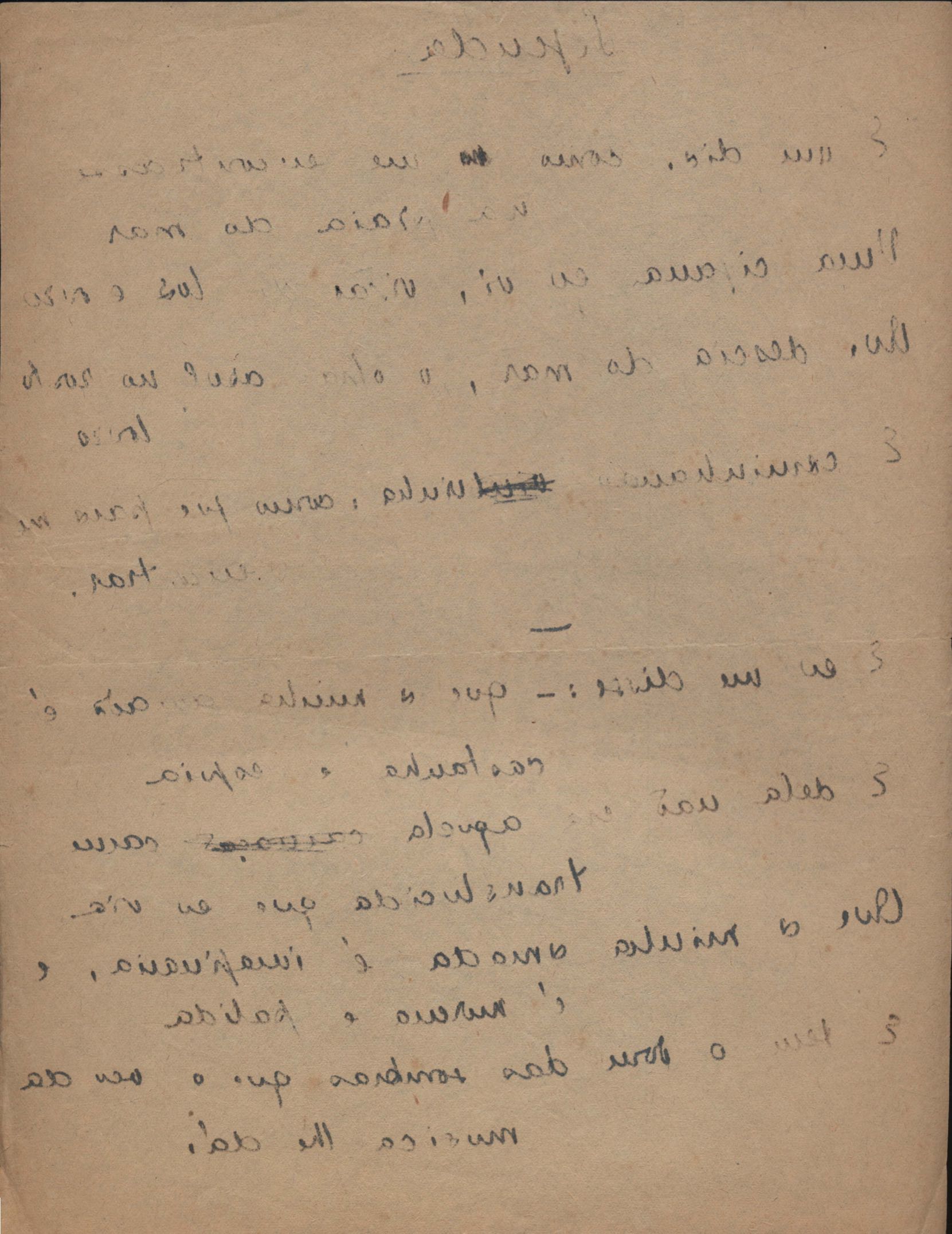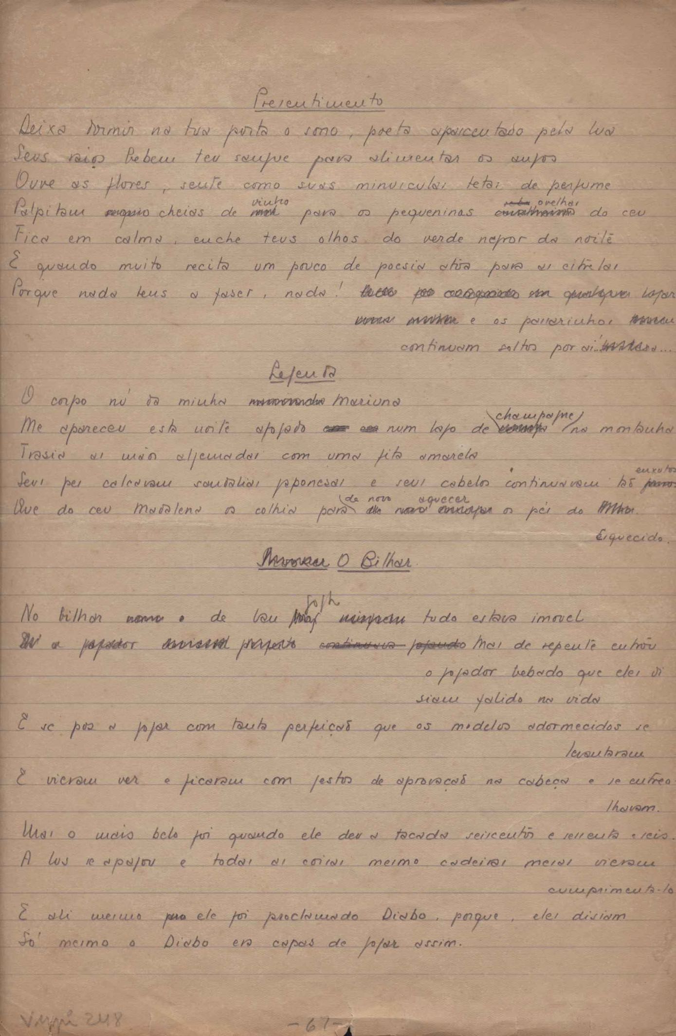 Este documento faz parte do dossiê VMPI248, "Poemas esparsos", que contempla poemas datados entre 21 ago. 1927 e 8 dez. 1971. Destes poemas, 401 são esboços e não possuem título (cf. registro VM0PI248_1_232). Estes originais não podem ser tomados como obra inédita. Ideias, tentativas, escritos inacabados, abandonados ou aproveitados posteriormente com outra forma compõem o dossiê.