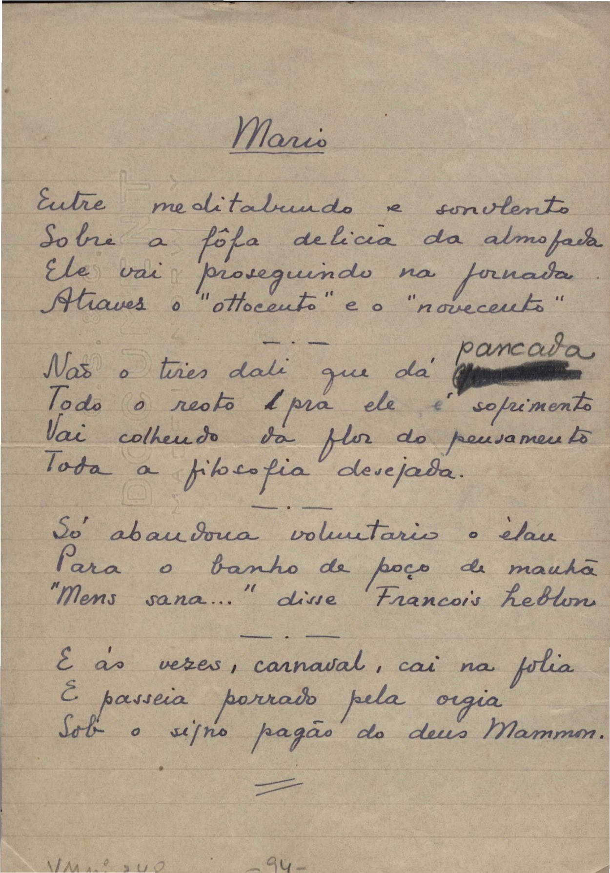 Este documento faz parte do dossiê VMPI248, "Poemas esparsos", que contempla poemas datados entre 21 ago. 1927 e 8 dez. 1971. Destes poemas, 401 são esboços e não possuem título (cf. registro VM0PI248_1_232). Estes originais não podem ser tomados como obra inédita. Ideias, tentativas, escritos inacabados, abandonados ou aproveitados posteriormente com outra forma compõem o dossiê.