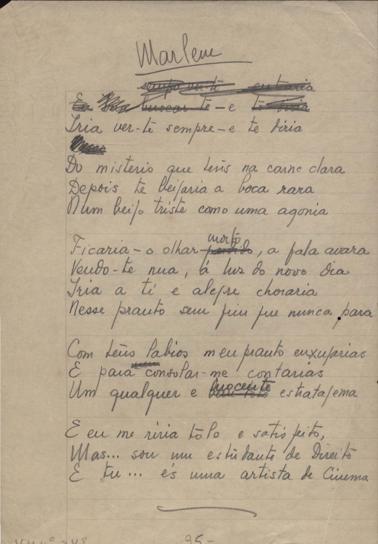 Este documento faz parte do dossiê VMPI248, "Poemas esparsos", que contempla poemas datados entre 21 ago. 1927 e 8 dez. 1971. Destes poemas, 401 são esboços e não possuem título (cf. registro VM0PI248_1_232). Estes originais não podem ser tomados como obra inédita. Ideias, tentativas, escritos inacabados, abandonados ou aproveitados posteriormente com outra forma compõem o dossiê.