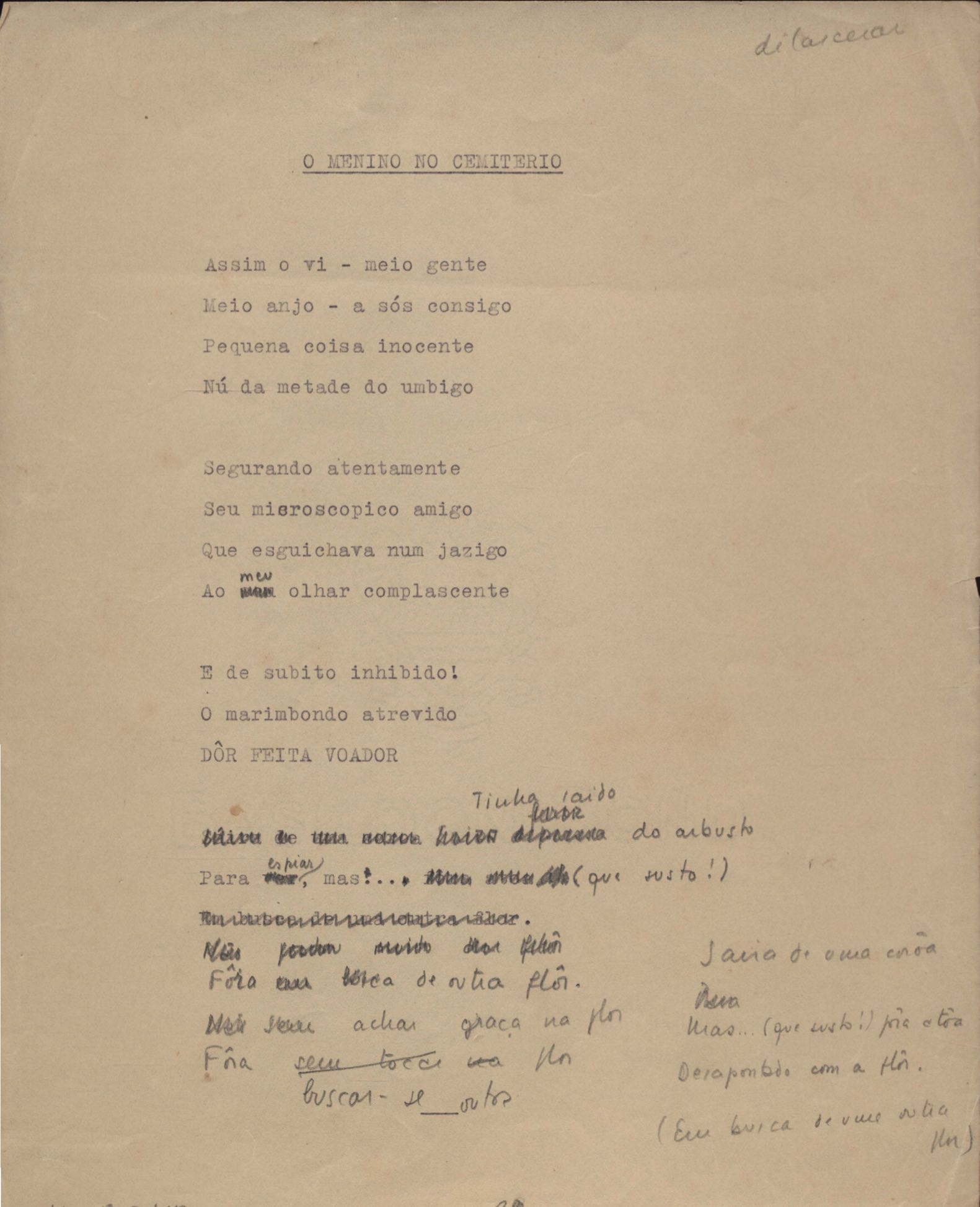 Este documento faz parte do dossiê VMPI248, "Poemas esparsos", que contempla poemas datados entre 21 ago. 1927 e 8 dez. 1971. Destes poemas, 401 são esboços e não possuem título (cf. registro VM0PI248_1_232). Estes originais não podem ser tomados como obra inédita. Ideias, tentativas, escritos inacabados, abandonados ou aproveitados posteriormente com outra forma compõem o dossiê.