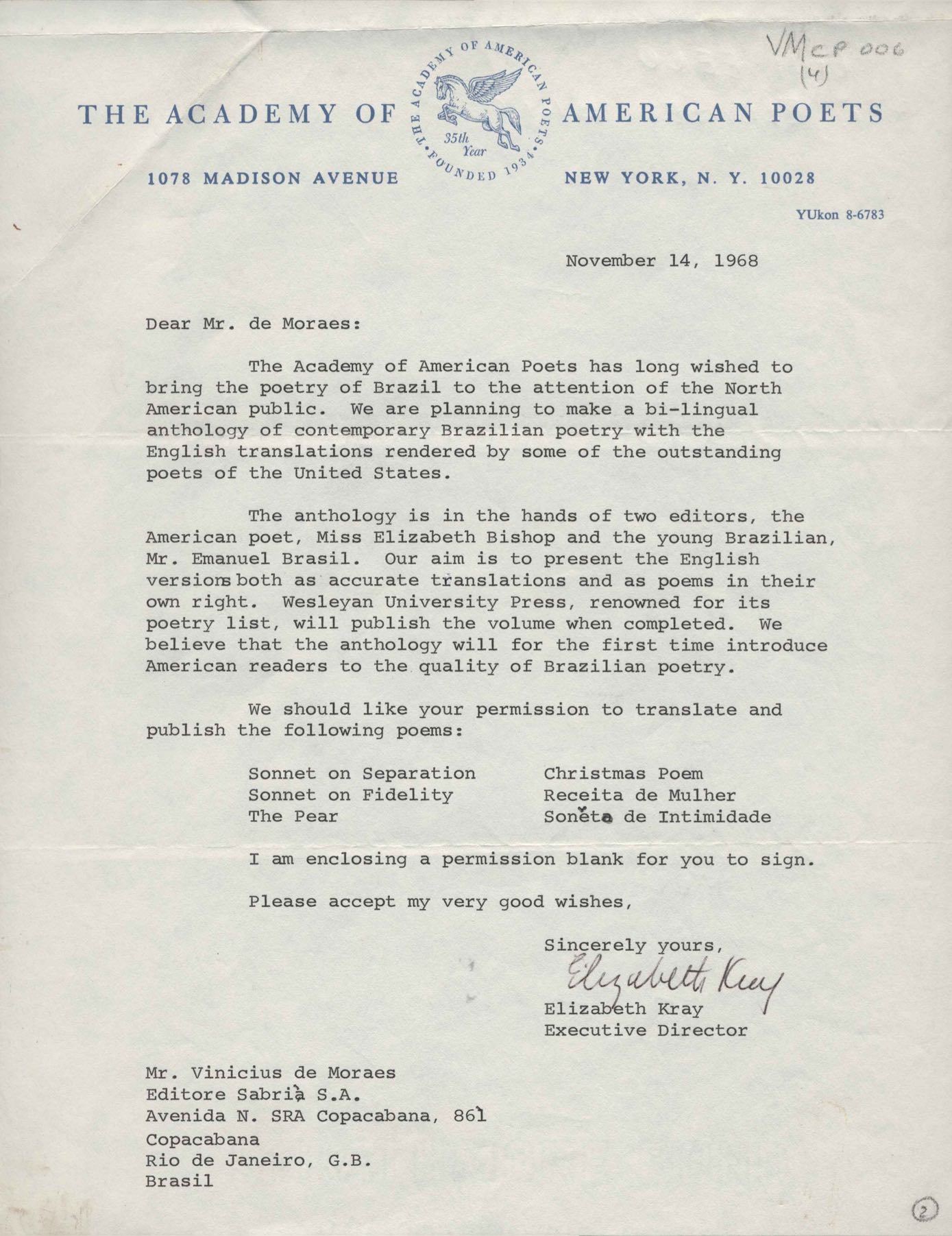 Publicação de antologia bilíngue de poetas brasileiros contemporâneos. Convite para VM participar de um recital de poesia no Guggenheim Museum. Anexo: Permissão para incluir poemas de VM em antologia.