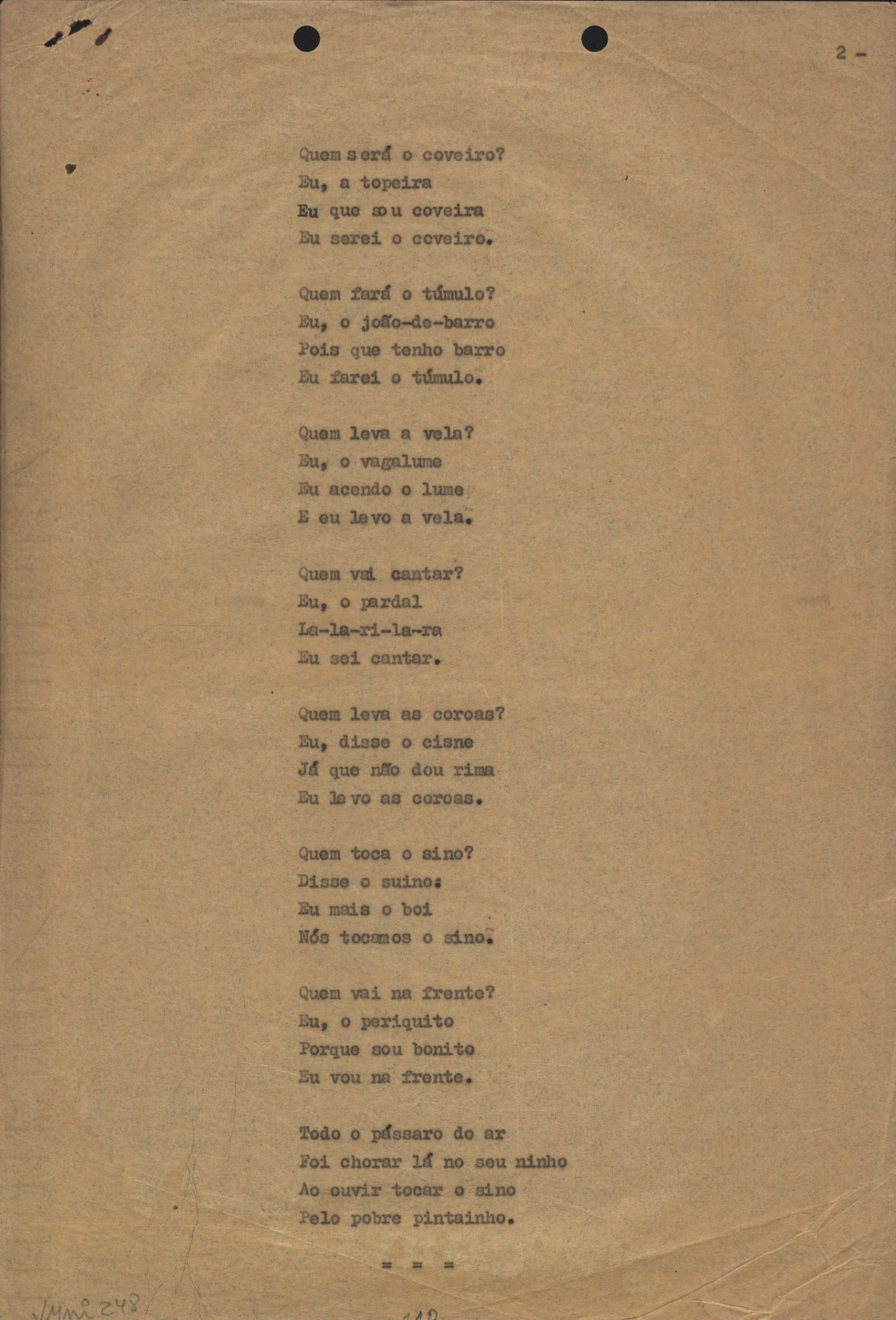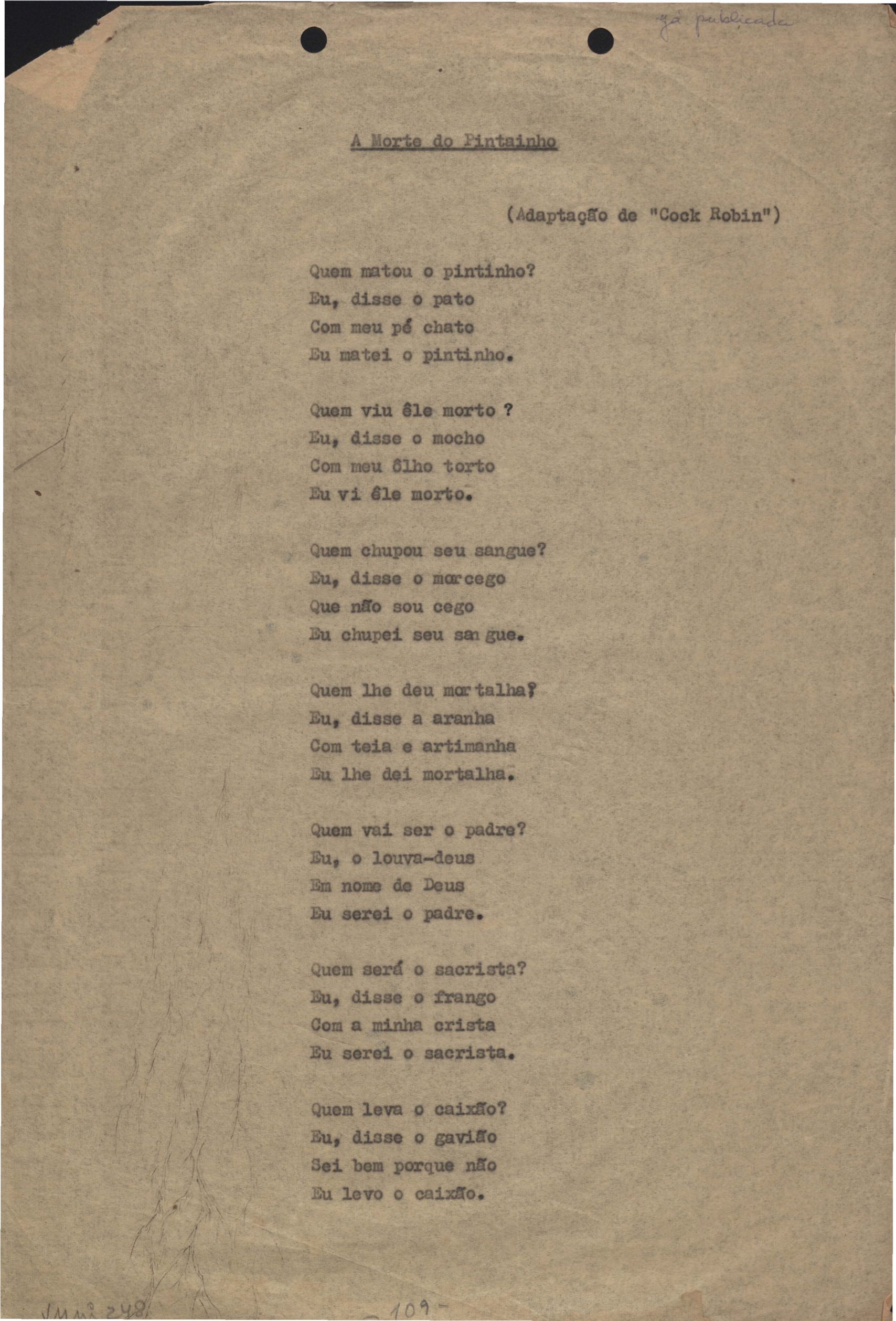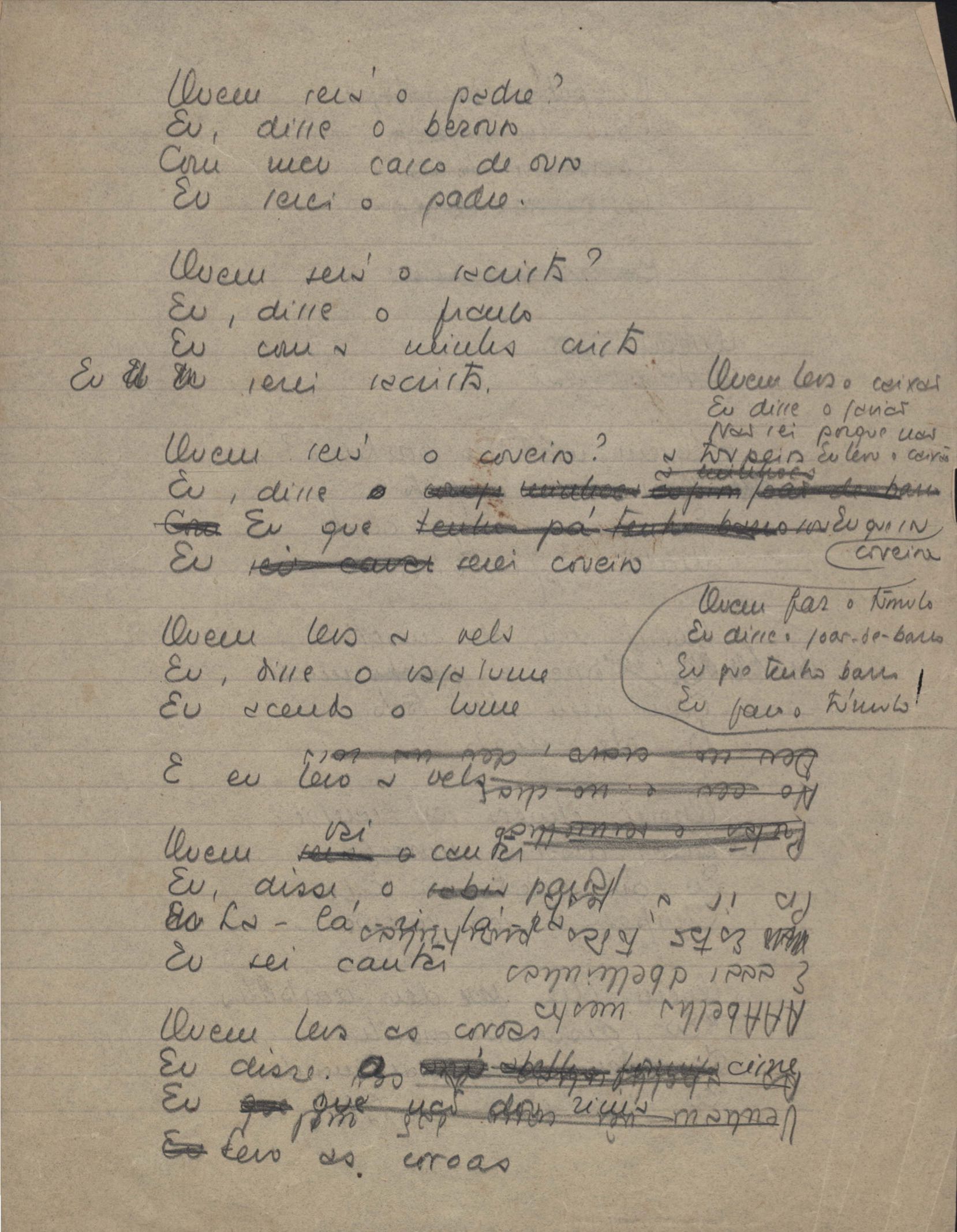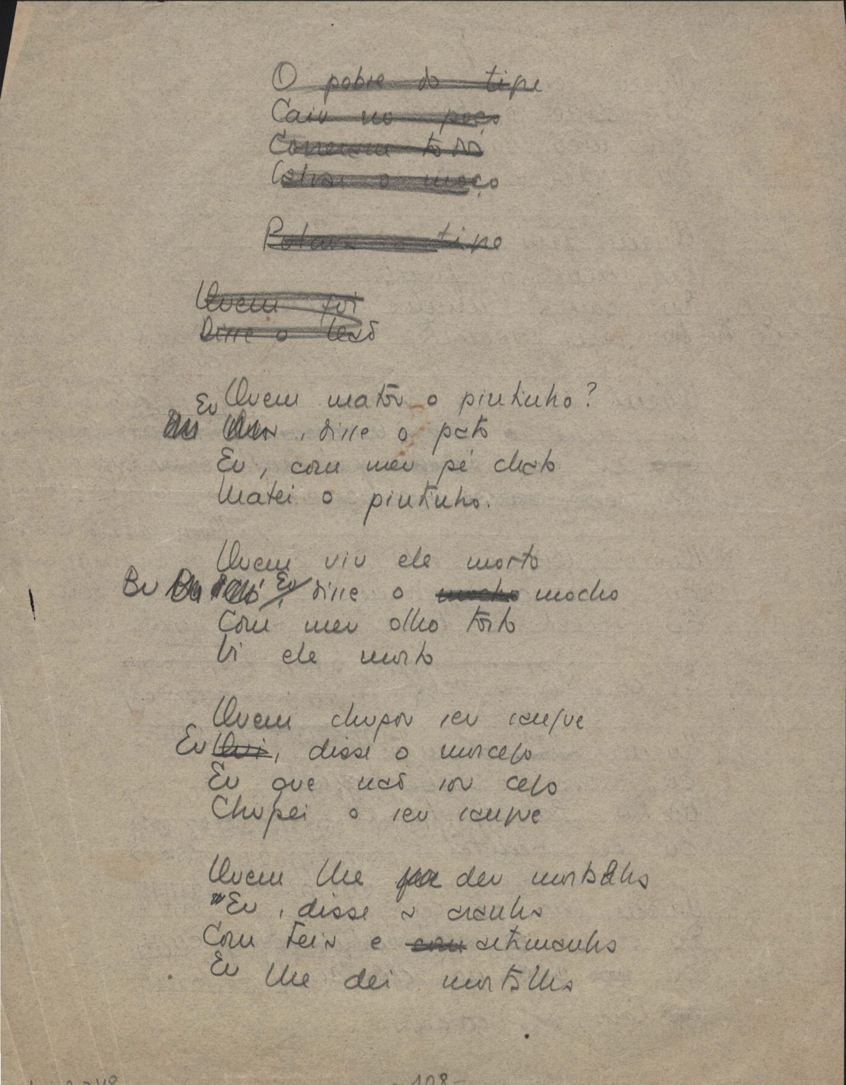 Este documento faz parte do dossiê VMPI248, "Poemas esparsos", que contempla poemas datados entre 21 ago. 1927 e 8 dez. 1971. Destes poemas, 401 são esboços e não possuem título (cf. registro VM0PI248_1_232). Estes originais não podem ser tomados como obra inédita. Ideias, tentativas, escritos inacabados, abandonados ou aproveitados posteriormente com outra forma compõem o dossiê.