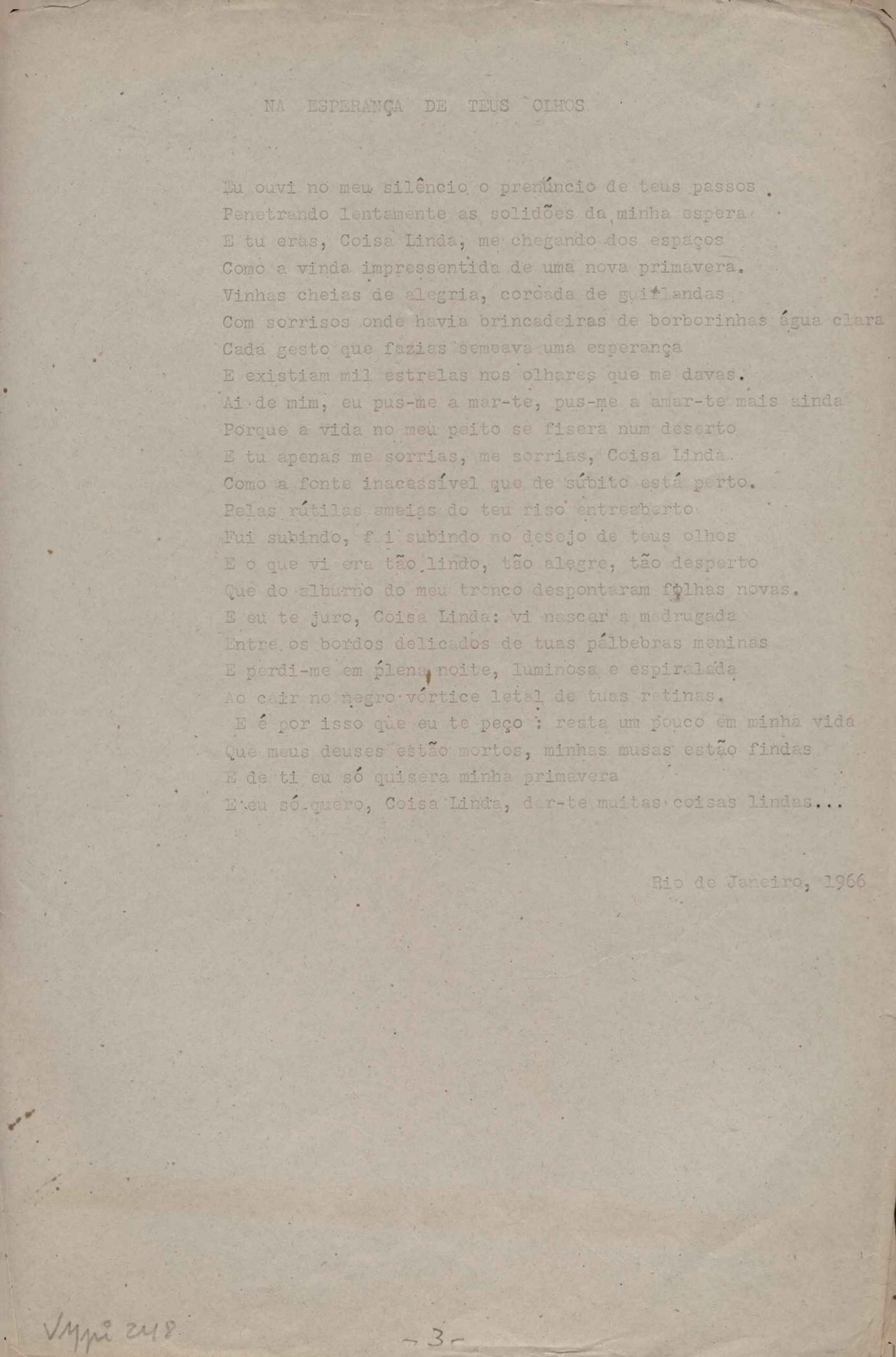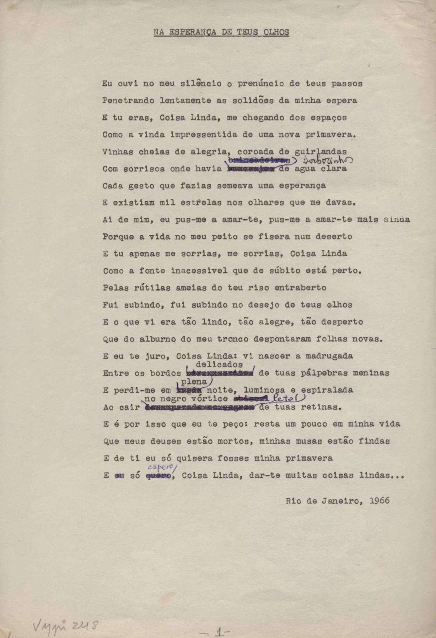 Este documento faz parte do dossiê VMPI248, "Poemas esparsos", que contempla poemas datados entre 21 ago. 1927 e 8 dez. 1971. Destes poemas, 401 são esboços e não possuem título (cf. registro VM0PI248_1_232). Estes originais não podem ser tomados como obra inédita. Ideias, tentativas, escritos inacabados, abandonados ou aproveitados posteriormente com outra forma compõem o dossiê.