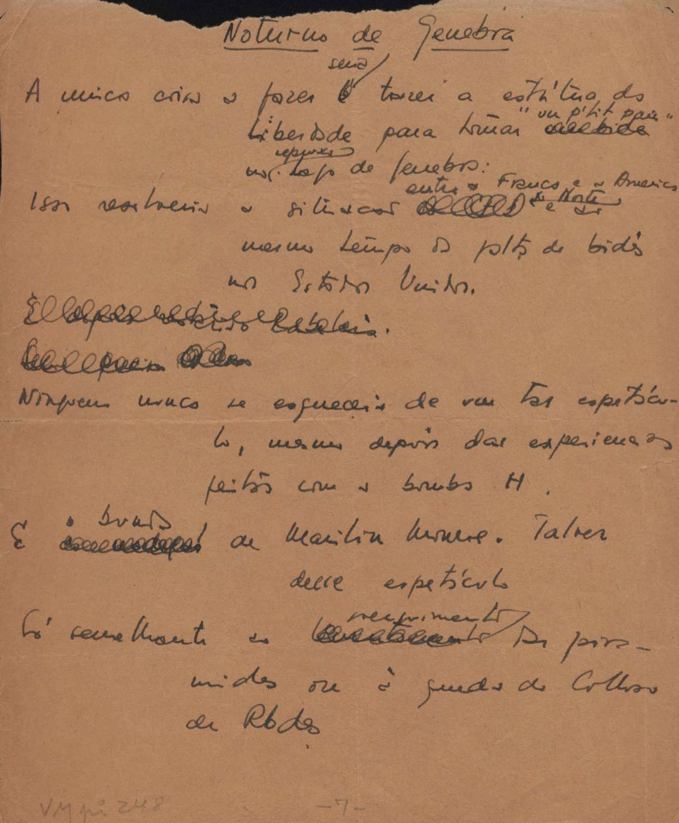 Este documento faz parte do dossiê VMPI248, "Poemas esparsos", que contempla poemas datados entre 21 ago. 1927 e 8 dez. 1971. Destes poemas, 401 são esboços e não possuem título (cf. registro VM0PI248_1_232). Estes originais não podem ser tomados como obra inédita. Ideias, tentativas, escritos inacabados, abandonados ou aproveitados posteriormente com outra forma compõem o dossiê.