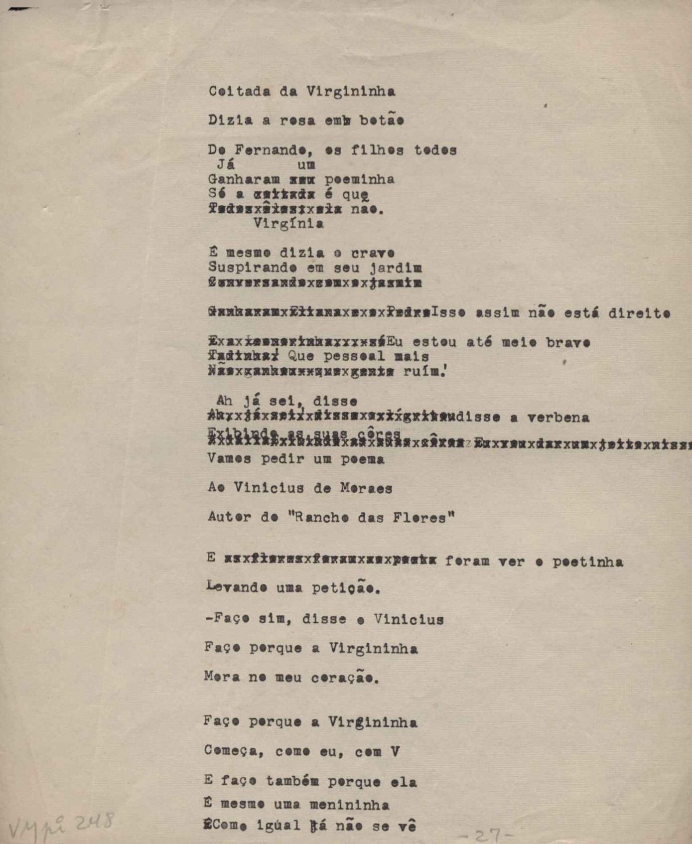 Este documento faz parte do dossiê VMPI248, "Poemas esparsos", que contempla poemas datados entre 21 ago. 1927 e 8 dez. 1971. Destes poemas, 401 são esboços e não possuem título (cf. registro VM0PI248_1_232). Estes originais não podem ser tomados como obra inédita. Ideias, tentativas, escritos inacabados, abandonados ou aproveitados posteriormente com outra forma compõem o dossiê.