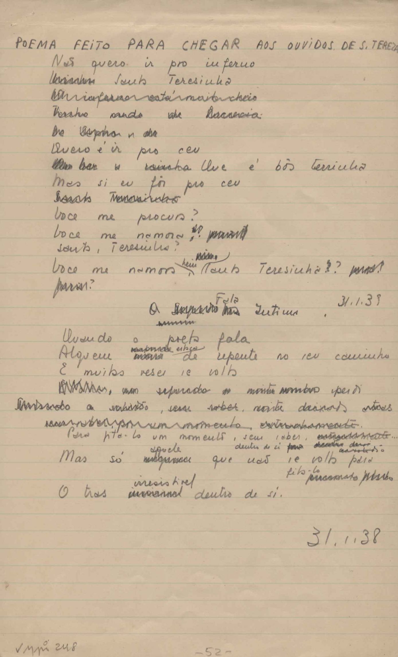Este documento faz parte do dossiê VMPI248, "Poemas esparsos", que contempla poemas datados entre 21 ago. 1927 e 8 dez. 1971. Destes poemas, 401 são esboços e não possuem título (cf. registro VM0PI248_1_232). Estes originais não podem ser tomados como obra inédita. Ideias, tentativas, escritos inacabados, abandonados ou aproveitados posteriormente com outra forma compõem o dossiê.