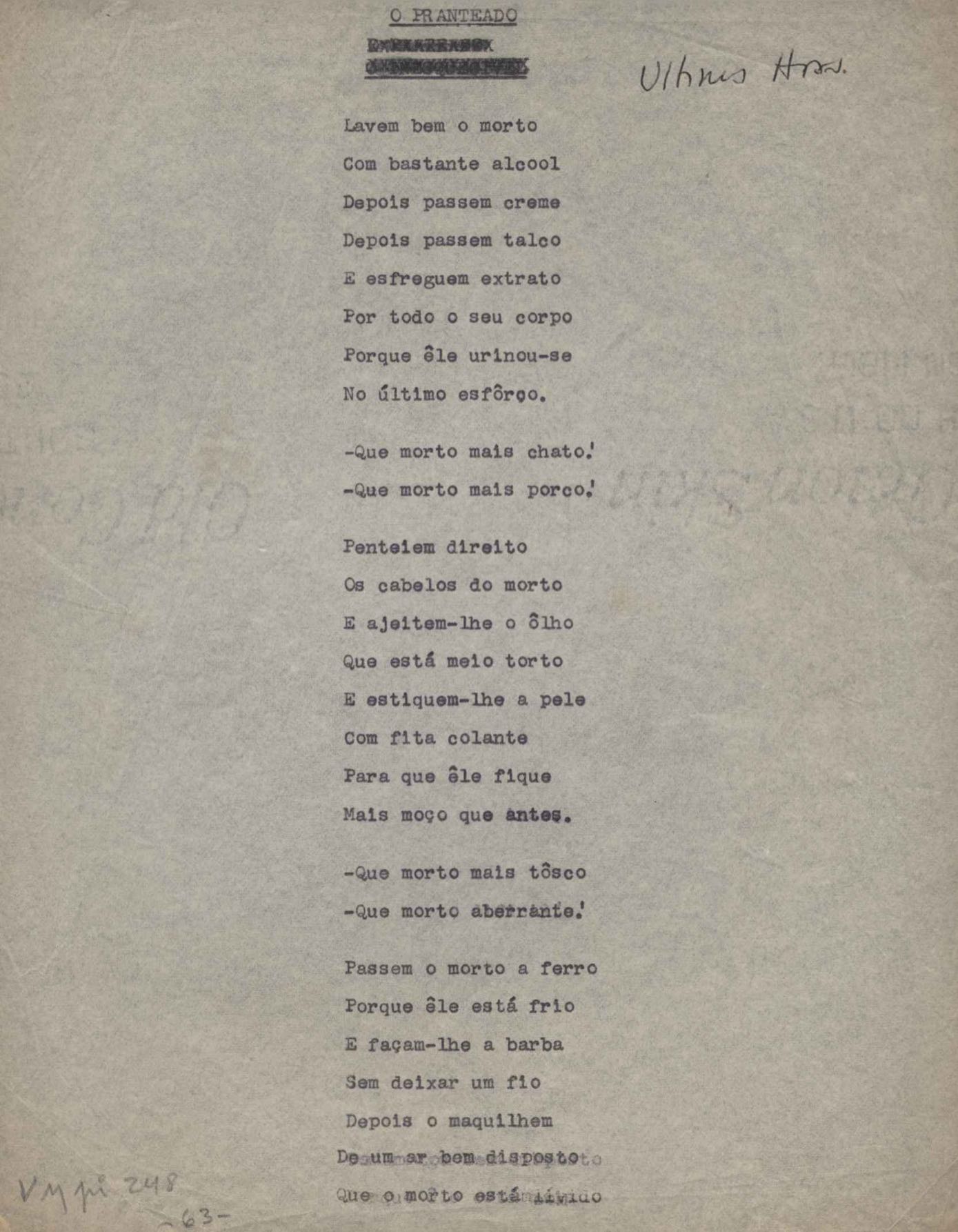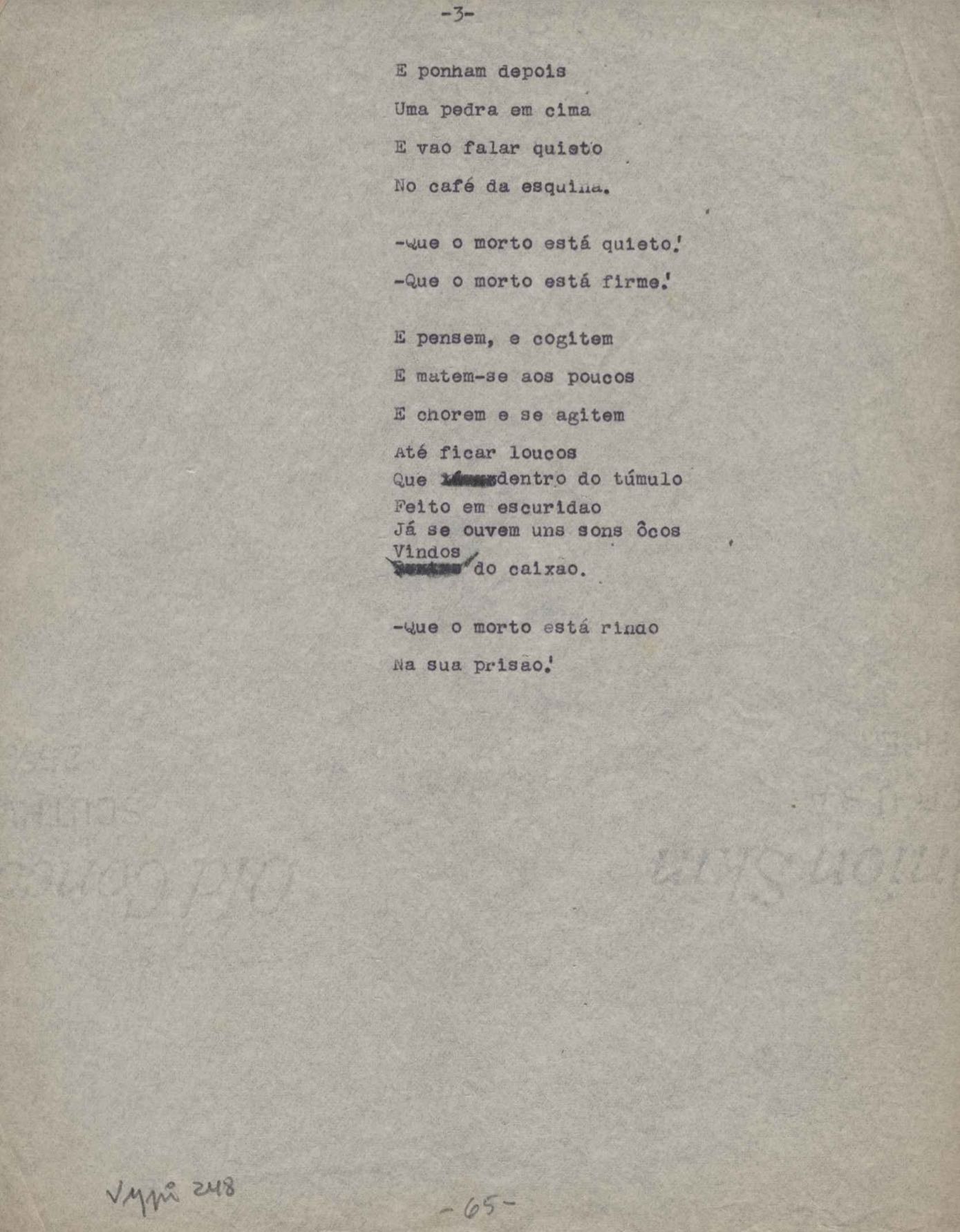Este documento faz parte do dossiê VMPI248, "Poemas esparsos", que contempla poemas datados entre 21 ago. 1927 e 8 dez. 1971. Destes poemas, 401 são esboços e não possuem título (cf. registro VM0PI248_1_232). Estes originais não podem ser tomados como obra inédita. Ideias, tentativas, escritos inacabados, abandonados ou aproveitados posteriormente com outra forma compõem o dossiê.
