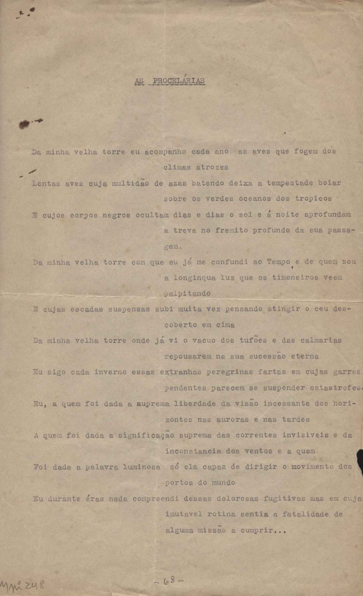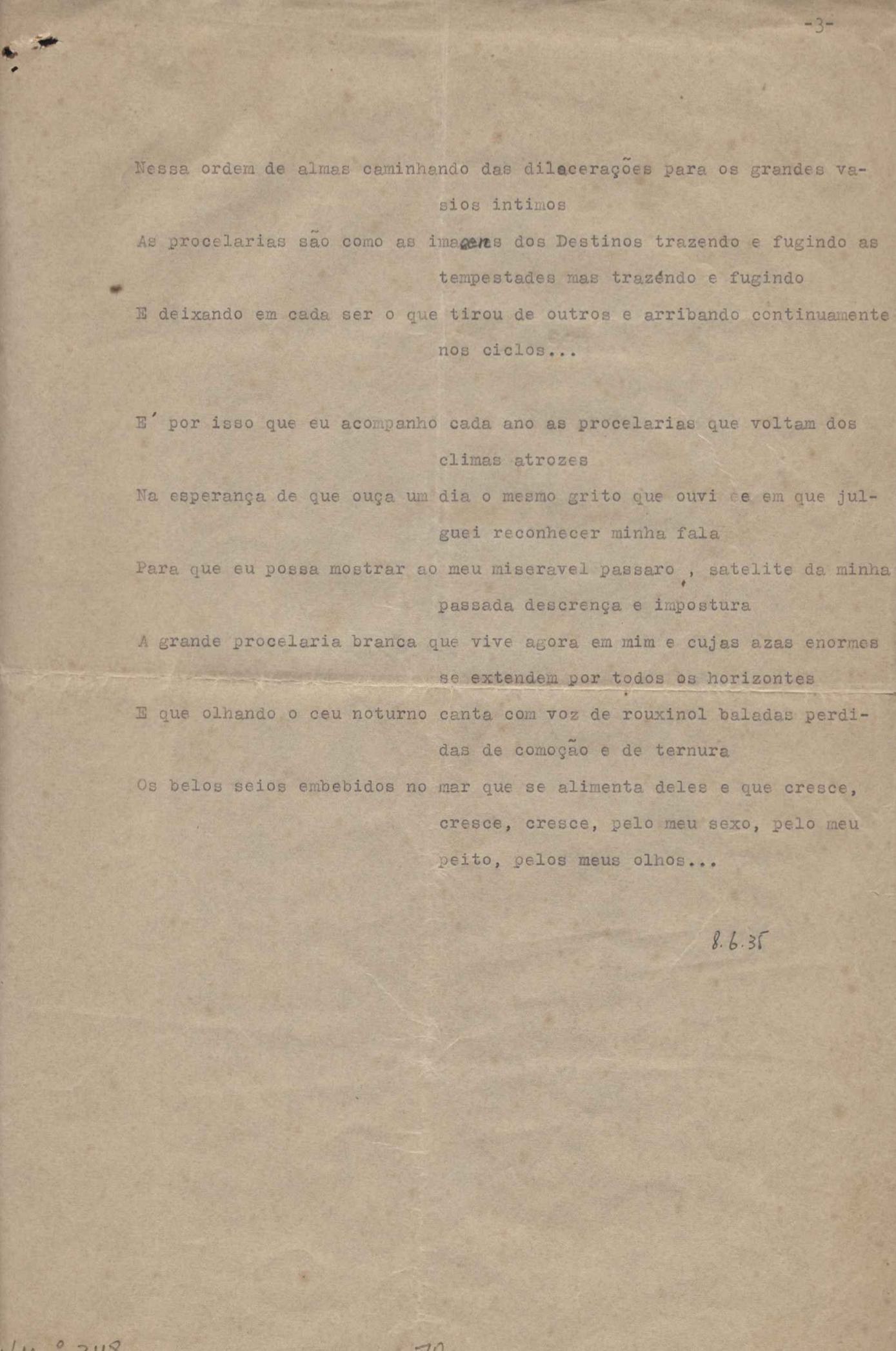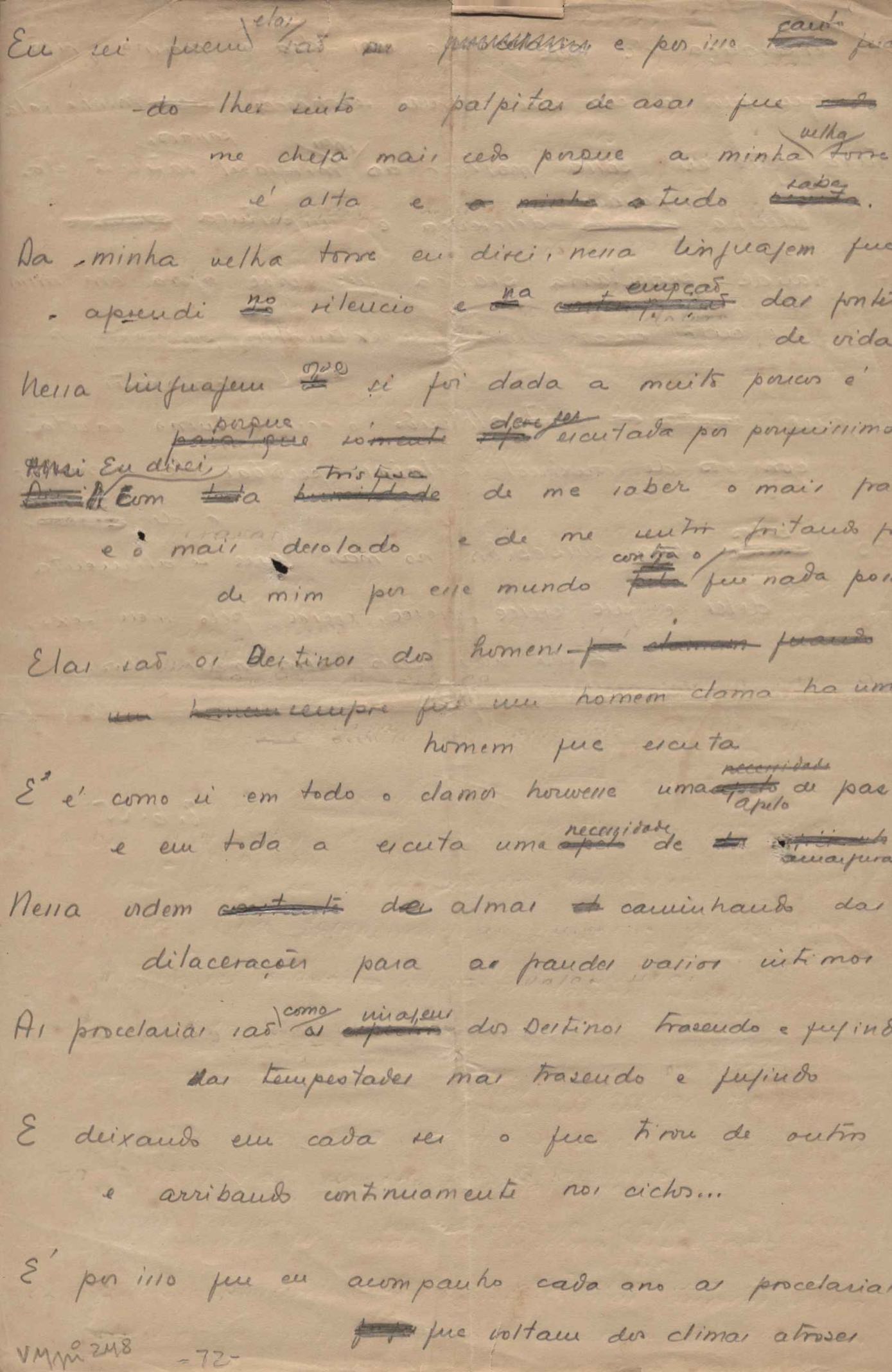 Este documento faz parte do dossiê VMPI248, "Poemas esparsos", que contempla poemas datados entre 21 ago. 1927 e 8 dez. 1971. Destes poemas, 401 são esboços e não possuem título (cf. registro VM0PI248_1_232). Estes originais não podem ser tomados como obra inédita. Ideias, tentativas, escritos inacabados, abandonados ou aproveitados posteriormente com outra forma compõem o dossiê.