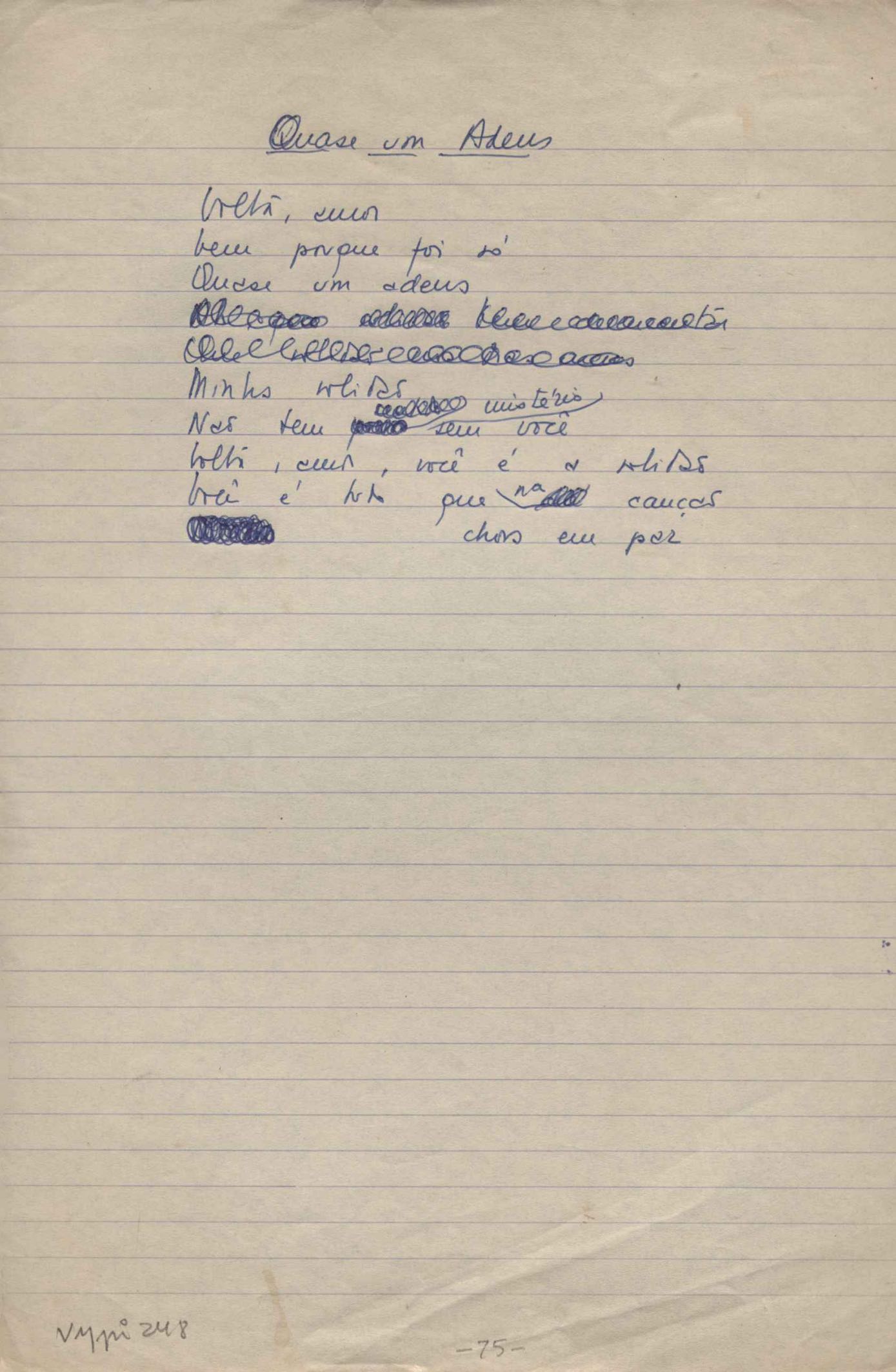Este documento faz parte do dossiê VMPI248, "Poemas esparsos", que contempla poemas datados entre 21 ago. 1927 e 8 dez. 1971. Destes poemas, 401 são esboços e não possuem título (cf. registro VM0PI248_1_232). Estes originais não podem ser tomados como obra inédita. Ideias, tentativas, escritos inacabados, abandonados ou aproveitados posteriormente com outra forma compõem o dossiê.