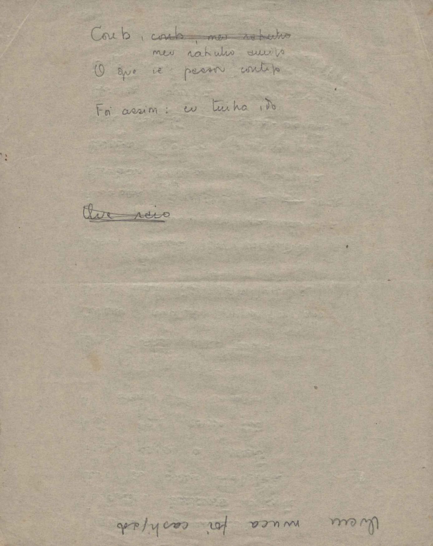 Este documento faz parte do dossiê VMPI248, "Poemas esparsos", que contempla poemas datados entre 21 ago. 1927 e 8 dez. 1971. Destes poemas, 401 são esboços e não possuem título (cf. registro VM0PI248_1_232). Estes originais não podem ser tomados como obra inédita. Ideias, tentativas, escritos inacabados, abandonados ou aproveitados posteriormente com outra forma compõem o dossiê.