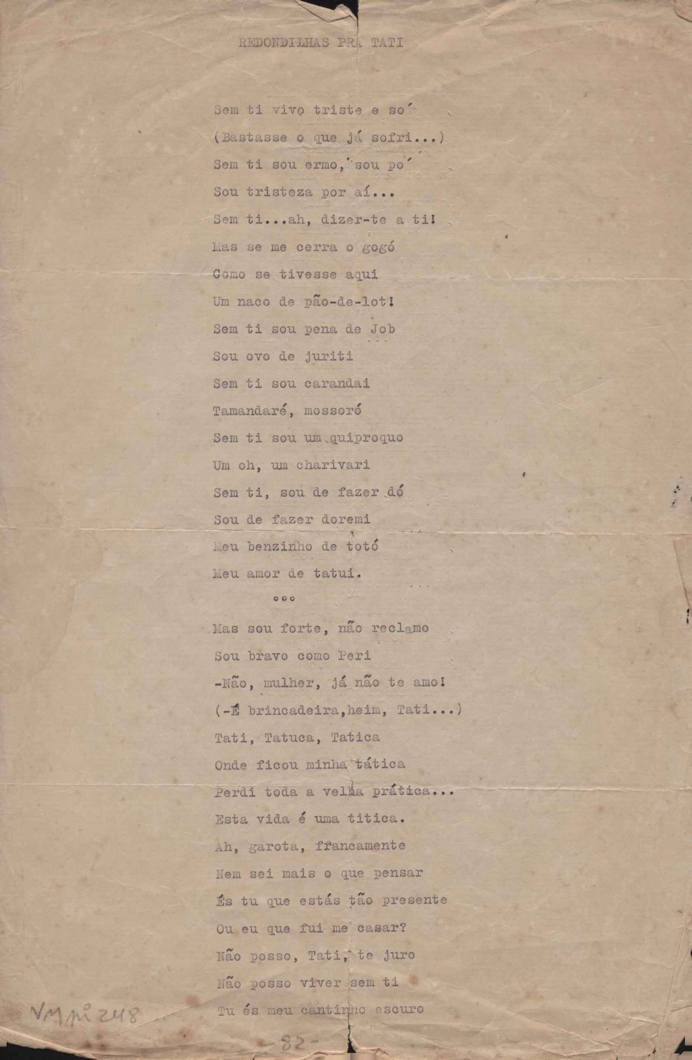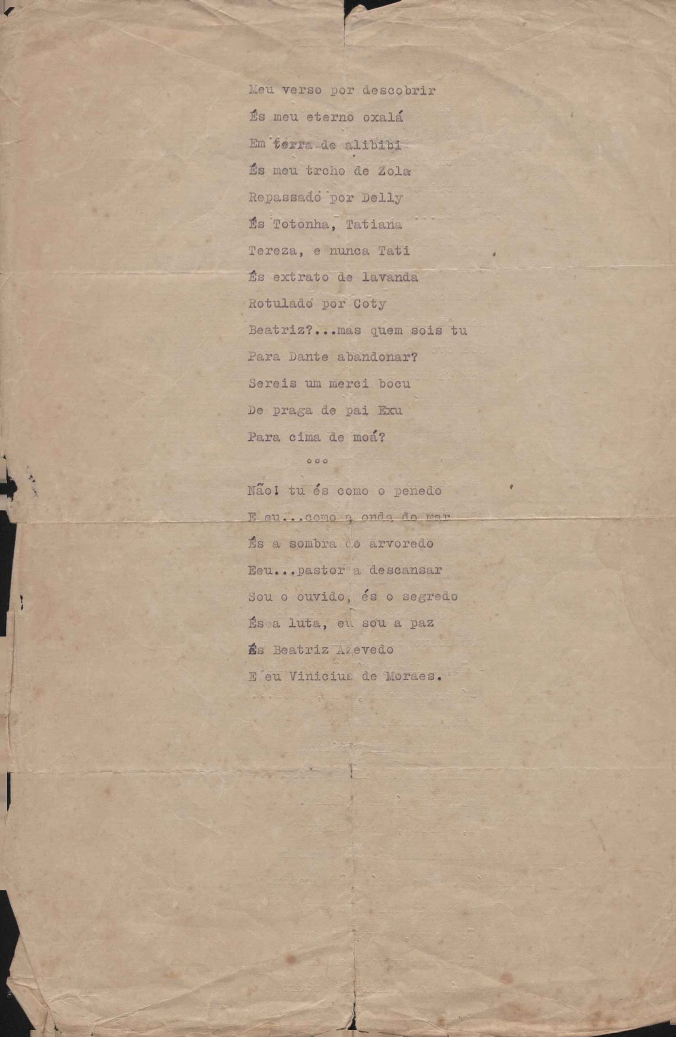 Este documento faz parte do dossiê VMPI248, "Poemas esparsos", que contempla poemas datados entre 21 ago. 1927 e 8 dez. 1971. Destes poemas, 401 são esboços e não possuem título (cf. registro VM0PI248_1_232). Estes originais não podem ser tomados como obra inédita. Ideias, tentativas, escritos inacabados, abandonados ou aproveitados posteriormente com outra forma compõem o dossiê.