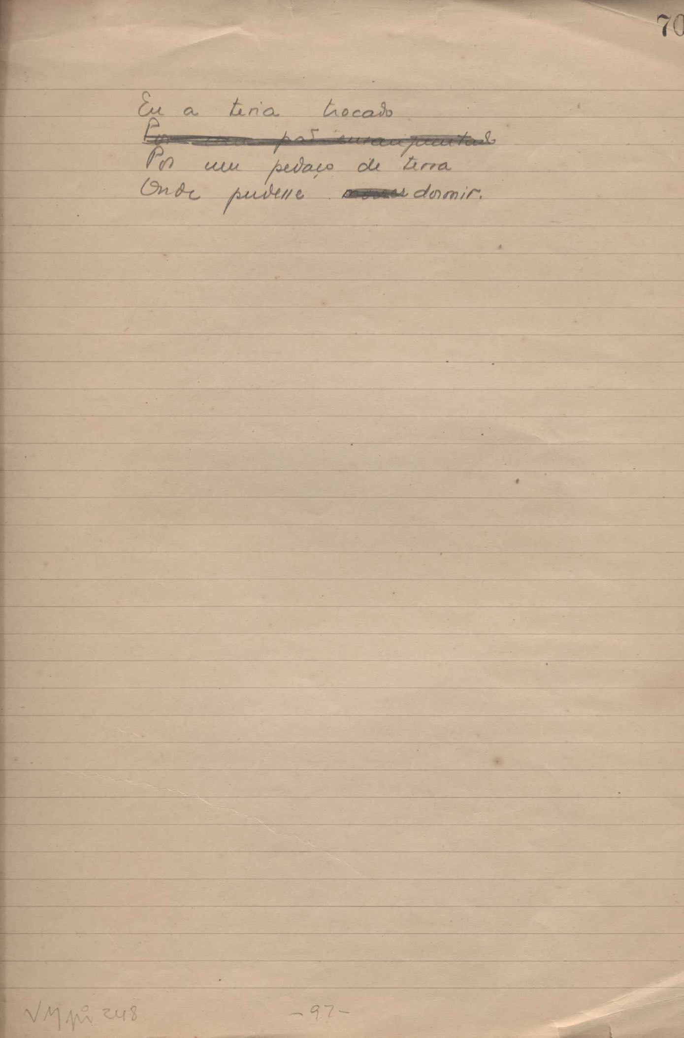 Este documento faz parte do dossiê VMPI248, "Poemas esparsos", que contempla poemas datados entre 21 ago. 1927 e 8 dez. 1971. Destes poemas, 401 são esboços e não possuem título (cf. registro VM0PI248_1_232). Estes originais não podem ser tomados como obra inédita. Ideias, tentativas, escritos inacabados, abandonados ou aproveitados posteriormente com outra forma compõem o dossiê.