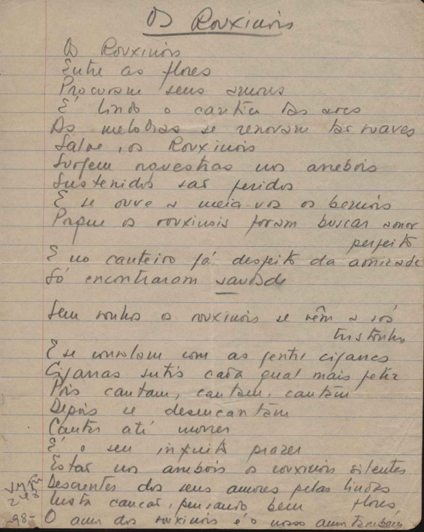 Este documento faz parte do dossiê VMPI248, "Poemas esparsos", que contempla poemas datados entre 21 ago. 1927 e 8 dez. 1971. Destes poemas, 401 são esboços e não possuem título (cf. registro VM0PI248_1_232). Estes originais não podem ser tomados como obra inédita. Ideias, tentativas, escritos inacabados, abandonados ou aproveitados posteriormente com outra forma compõem o dossiê.