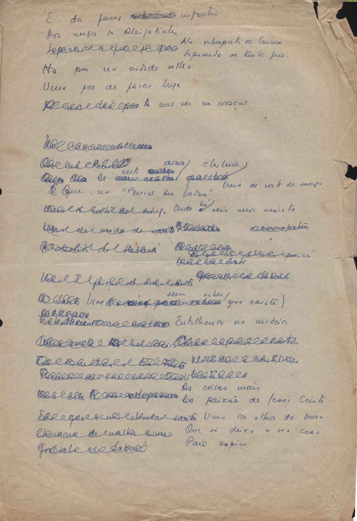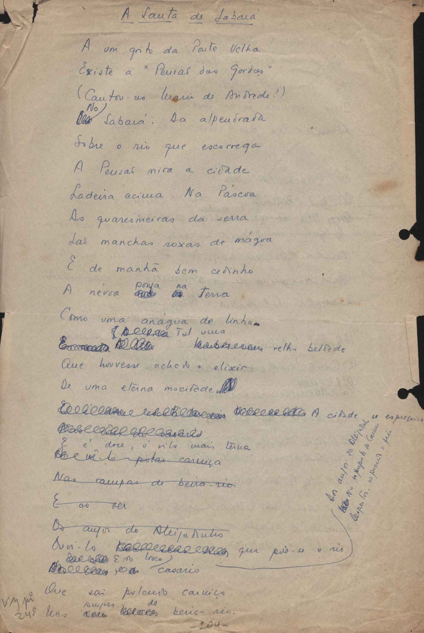 Este documento faz parte do dossiê VMPI248, "Poemas esparsos", que contempla poemas datados entre 21 ago. 1927 e 8 dez. 1971. Destes poemas, 401 são esboços e não possuem título (cf. registro VM0PI248_1_232). Estes originais não podem ser tomados como obra inédita. Ideias, tentativas, escritos inacabados, abandonados ou aproveitados posteriormente com outra forma compõem o dossiê.