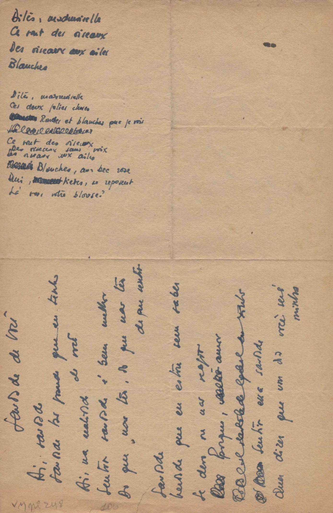 Este documento faz parte do dossiê VMPI248, "Poemas esparsos", que contempla poemas datados entre 21 ago. 1927 e 8 dez. 1971. Destes poemas, 401 são esboços e não possuem título (cf. registro VM0PI248_1_232). Estes originais não podem ser tomados como obra inédita. Ideias, tentativas, escritos inacabados, abandonados ou aproveitados posteriormente com outra forma compõem o dossiê.
