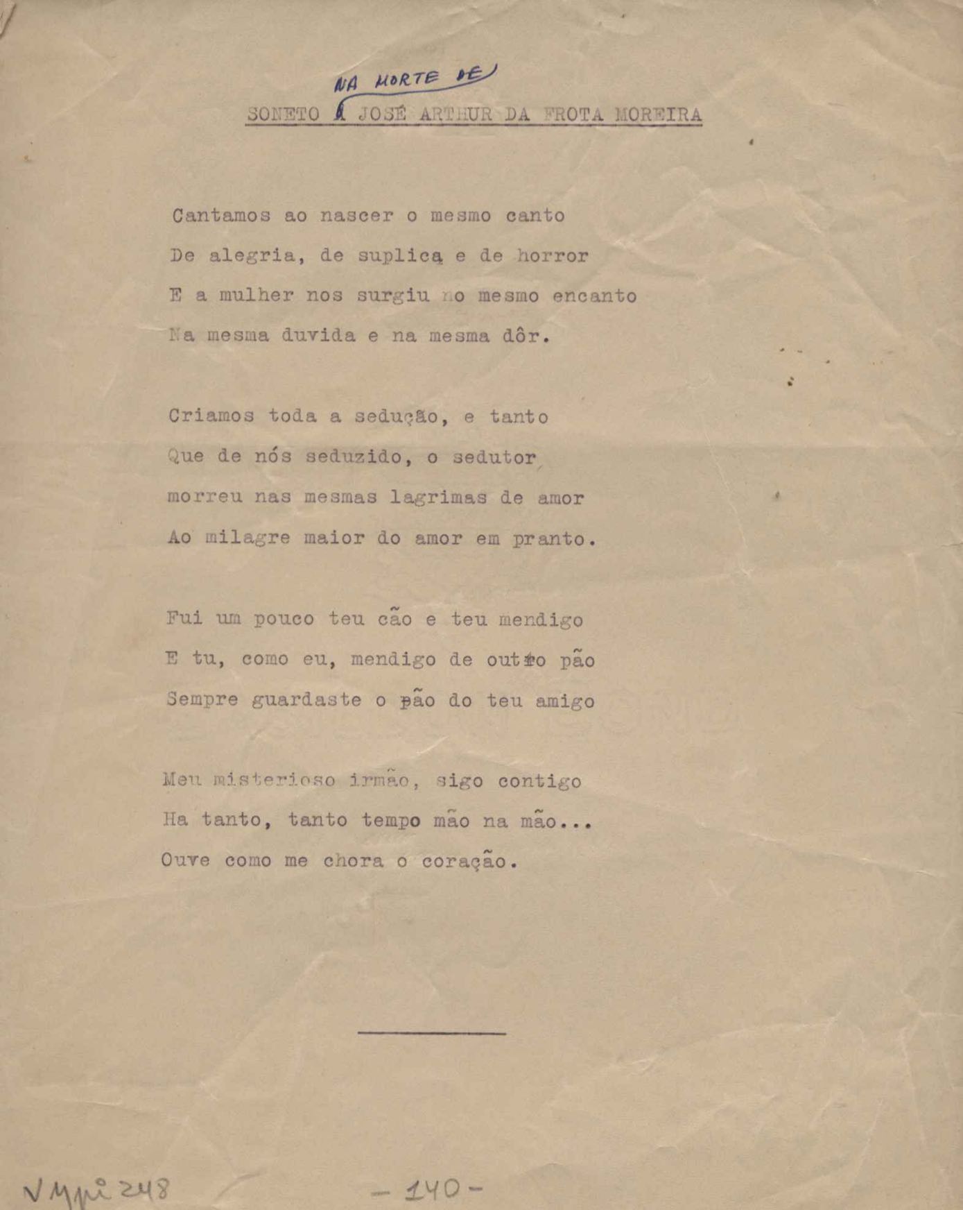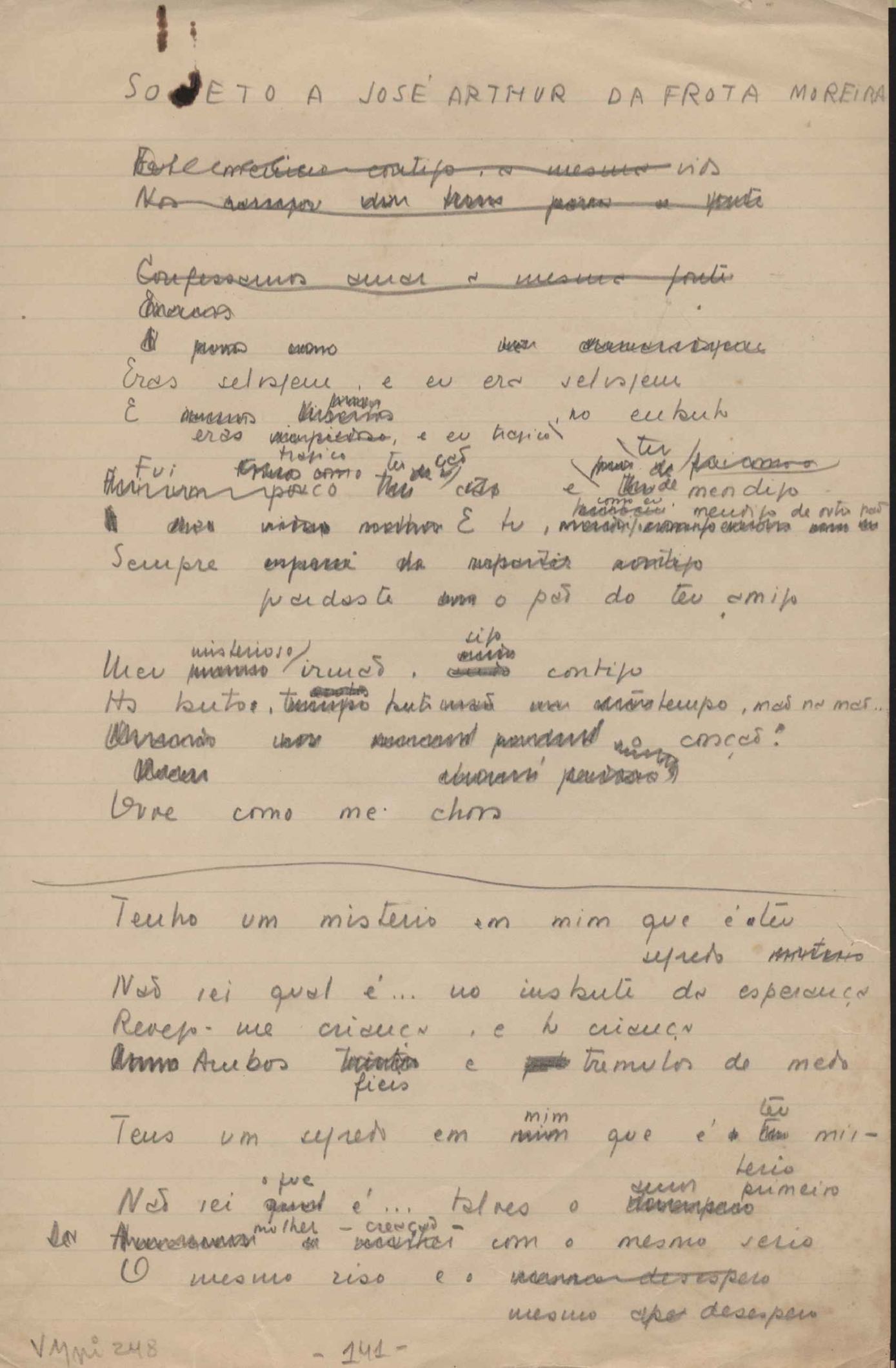 Este documento faz parte do dossiê VMPI248, "Poemas esparsos", que contempla poemas datados entre 21 ago. 1927 e 8 dez. 1971. Destes poemas, 401 são esboços e não possuem título (cf. registro VM0PI248_1_232). Estes originais não podem ser tomados como obra inédita. Ideias, tentativas, escritos inacabados, abandonados ou aproveitados posteriormente com outra forma compõem o dossiê.