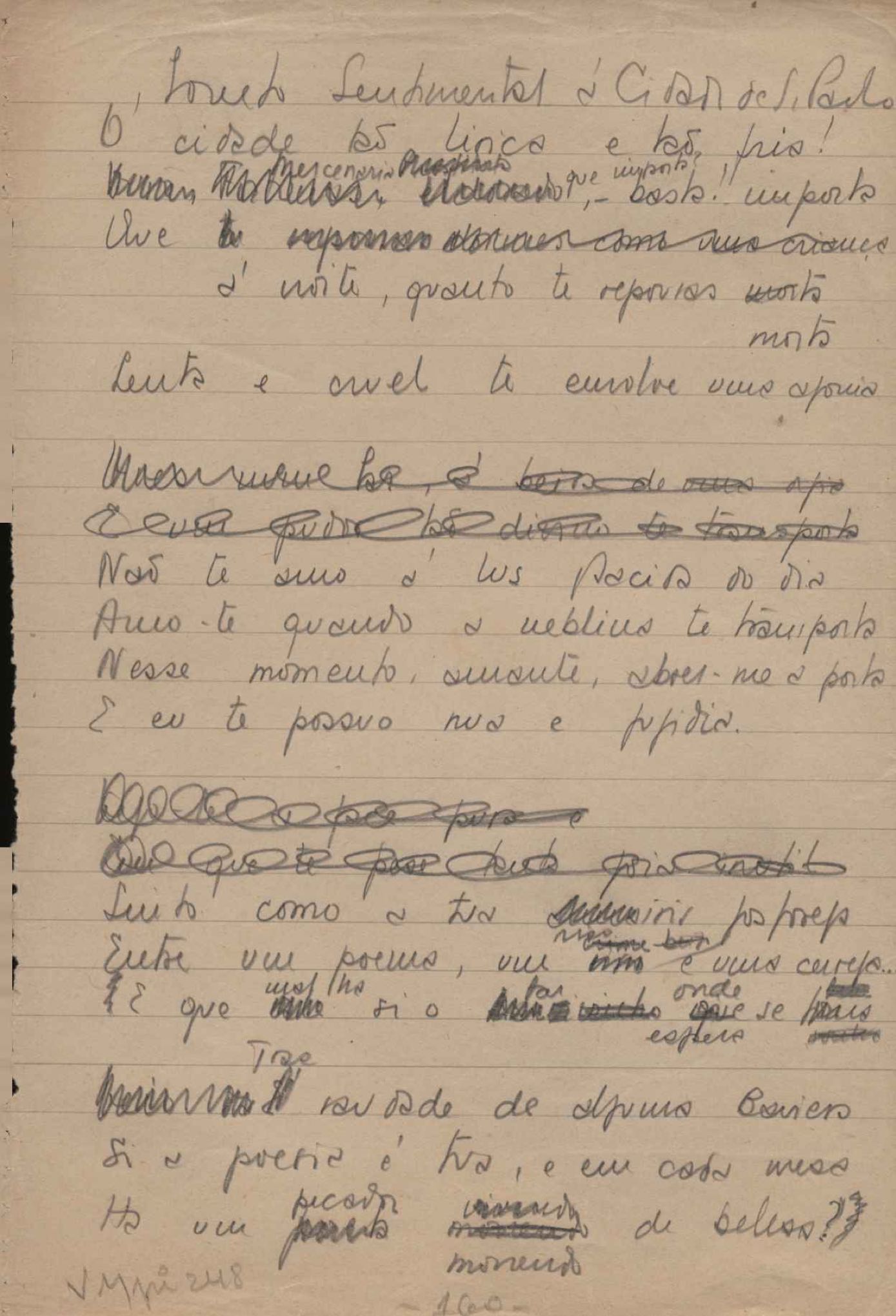 Este documento faz parte do dossiê VMPI248, "Poemas esparsos", que contempla poemas datados entre 21 ago. 1927 e 8 dez. 1971. Destes poemas, 401 são esboços e não possuem título (cf. registro VM0PI248_1_232). Estes originais não podem ser tomados como obra inédita. Ideias, tentativas, escritos inacabados, abandonados ou aproveitados posteriormente com outra forma compõem o dossiê.