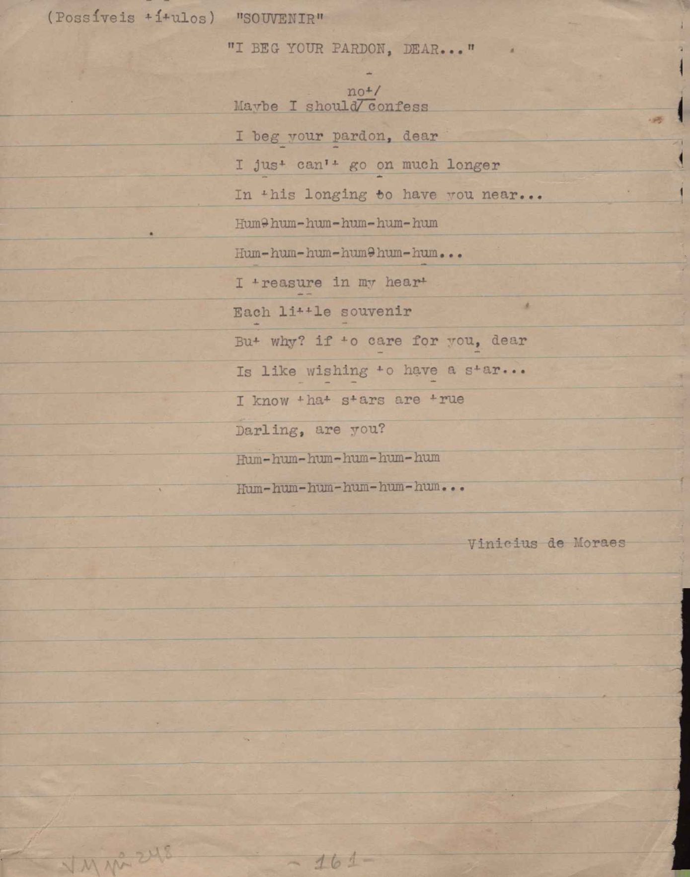 Este documento faz parte do dossiê VMPI248, "Poemas esparsos", que contempla poemas datados entre 21 ago. 1927 e 8 dez. 1971. Destes poemas, 401 são esboços e não possuem título (cf. registro VM0PI248_1_232). Estes originais não podem ser tomados como obra inédita. Ideias, tentativas, escritos inacabados, abandonados ou aproveitados posteriormente com outra forma compõem o dossiê.